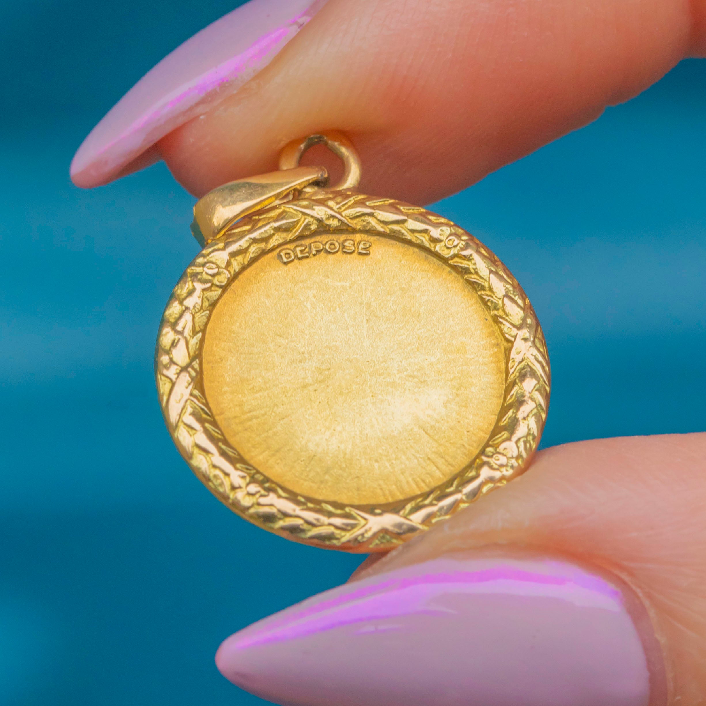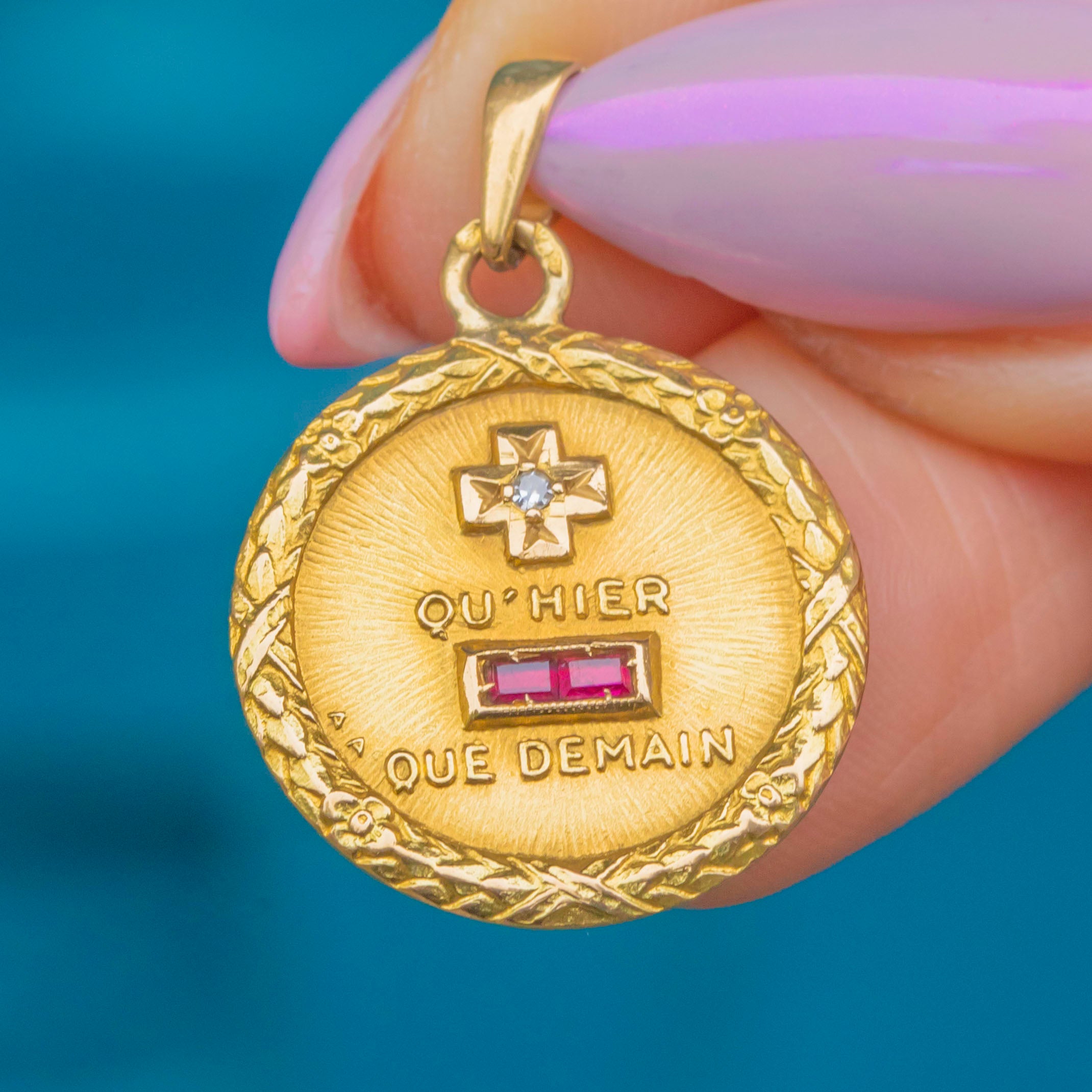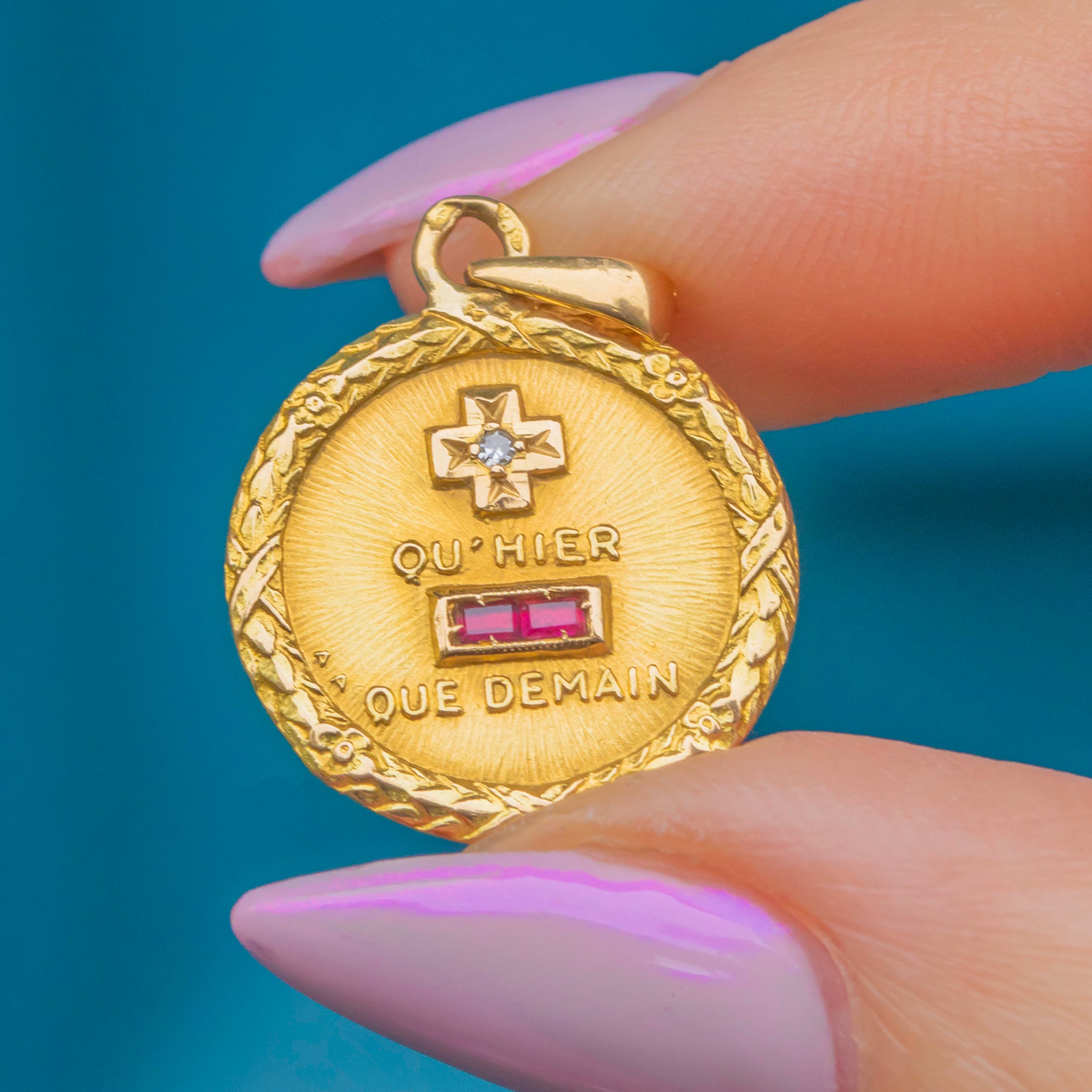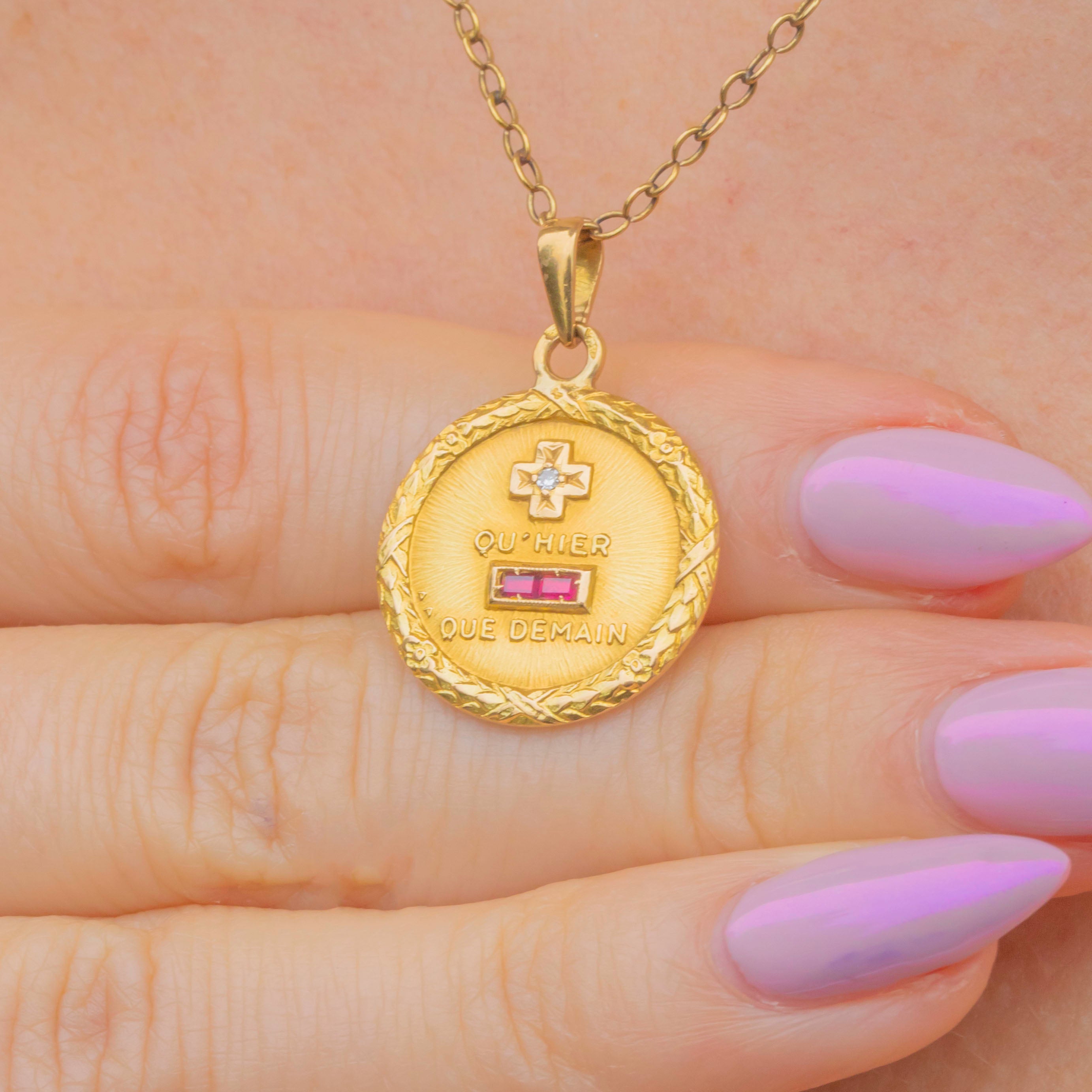 This beautiful French 18ct Gold pendant bears the iconic “Plus qu’hier, moins que demain” rebus — meaning “More than yesterday, less than tomorrow.” The phrase, taken from a poem written in 1889 by Rosemonde Gérard to her husband Edmond Rostand (author of Cyrano de Bergerac), has come to symbolise enduring and ever-growing love.