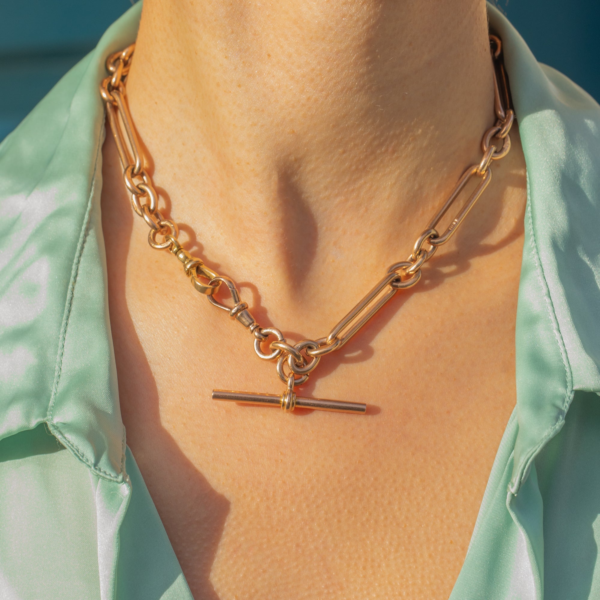 The elongated 28mm trombone links have a wonderfully architectural feel, balanced by rounded connectors and the characterful mix of a rounded and a squarer dog-clip. Measuring 15” long, this chain is ideal as a choker-length statement necklace, layered piece, or even as a charm-holder. Its rich hue and robust construction make it both wearable and highly desirable.