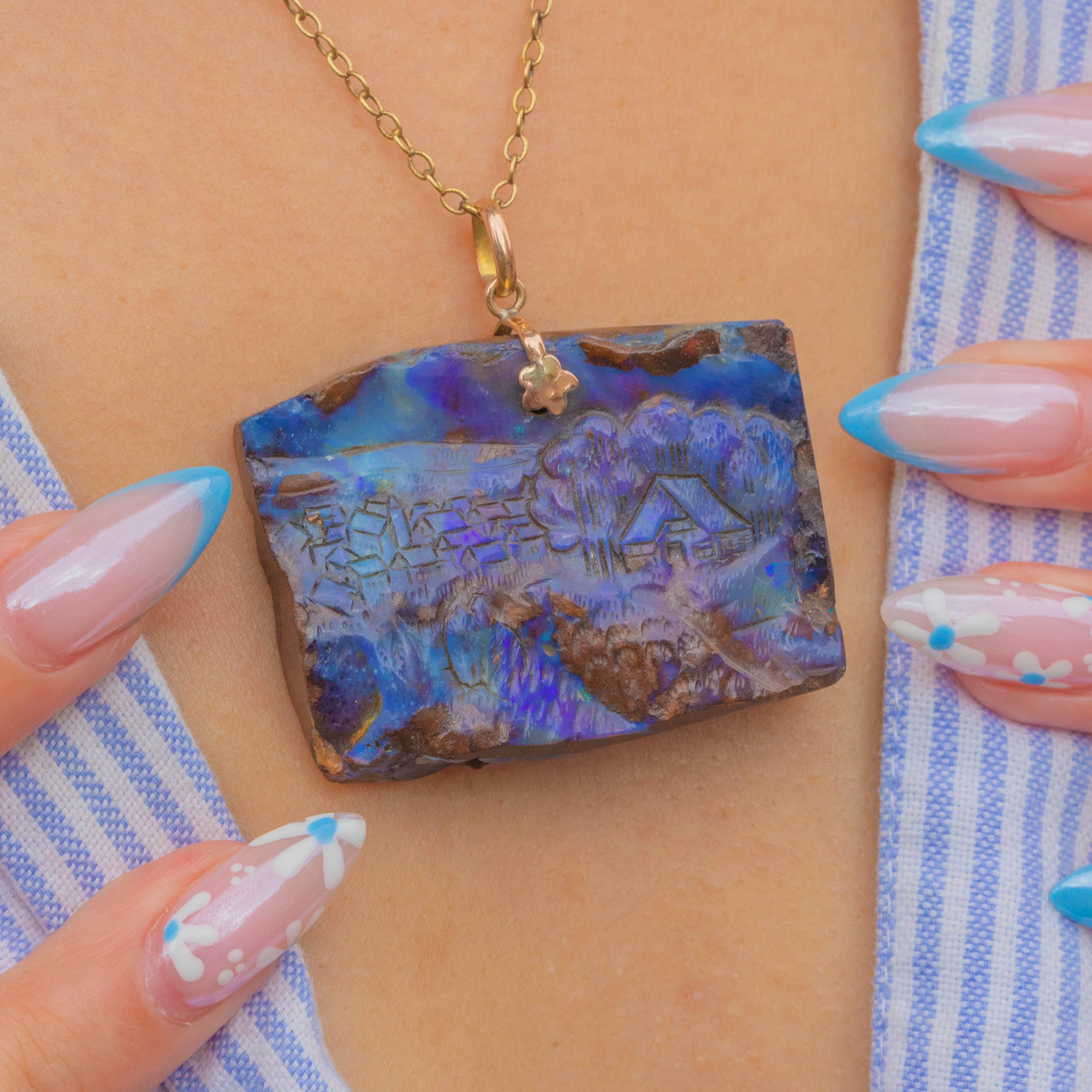Rare Antique Carved Boulder Opal Pendant with Village Scene
