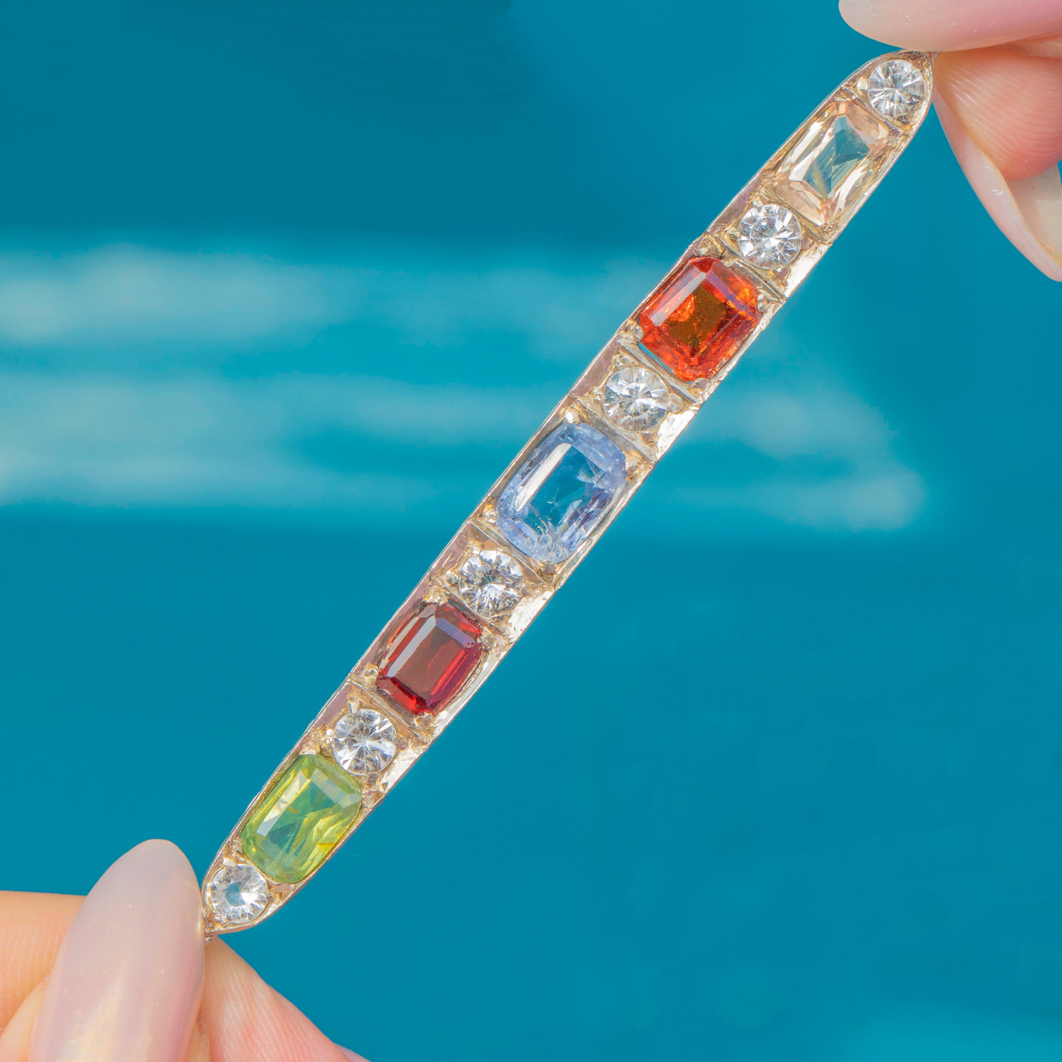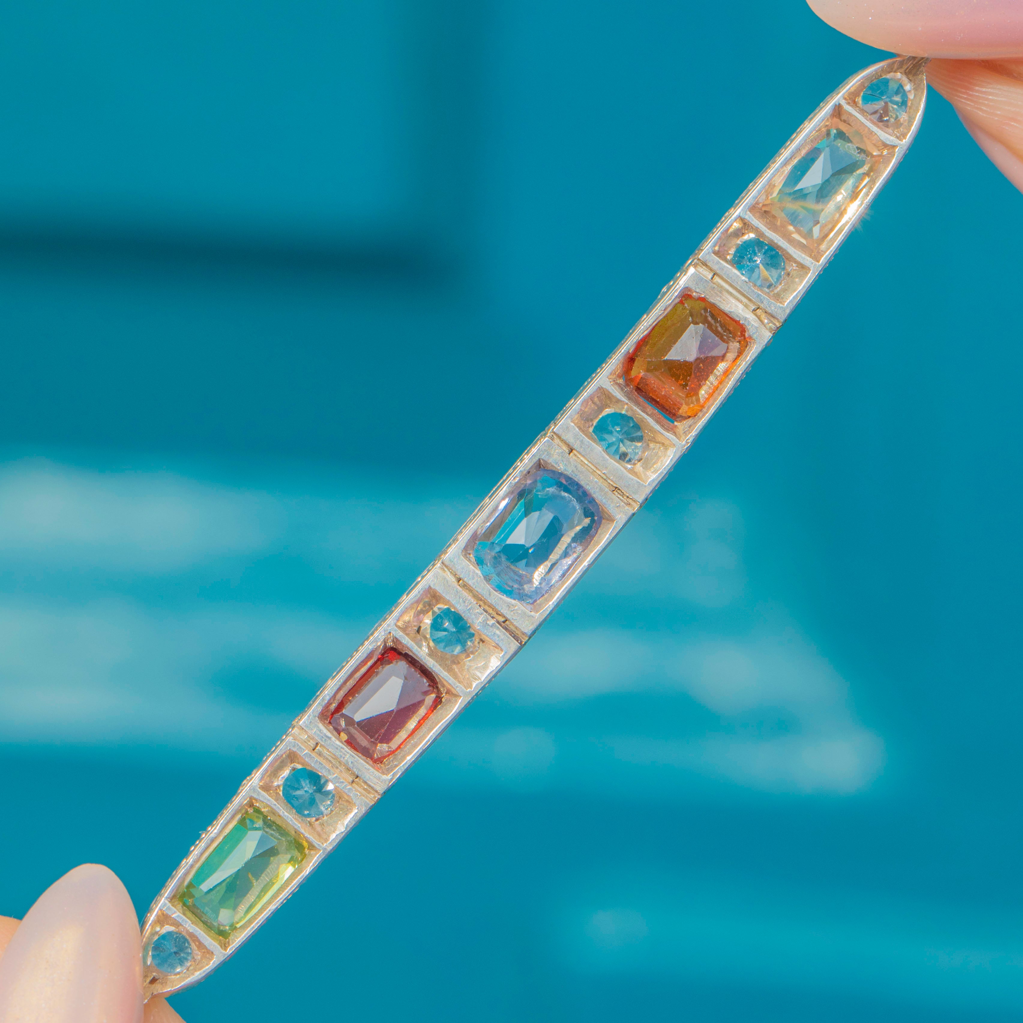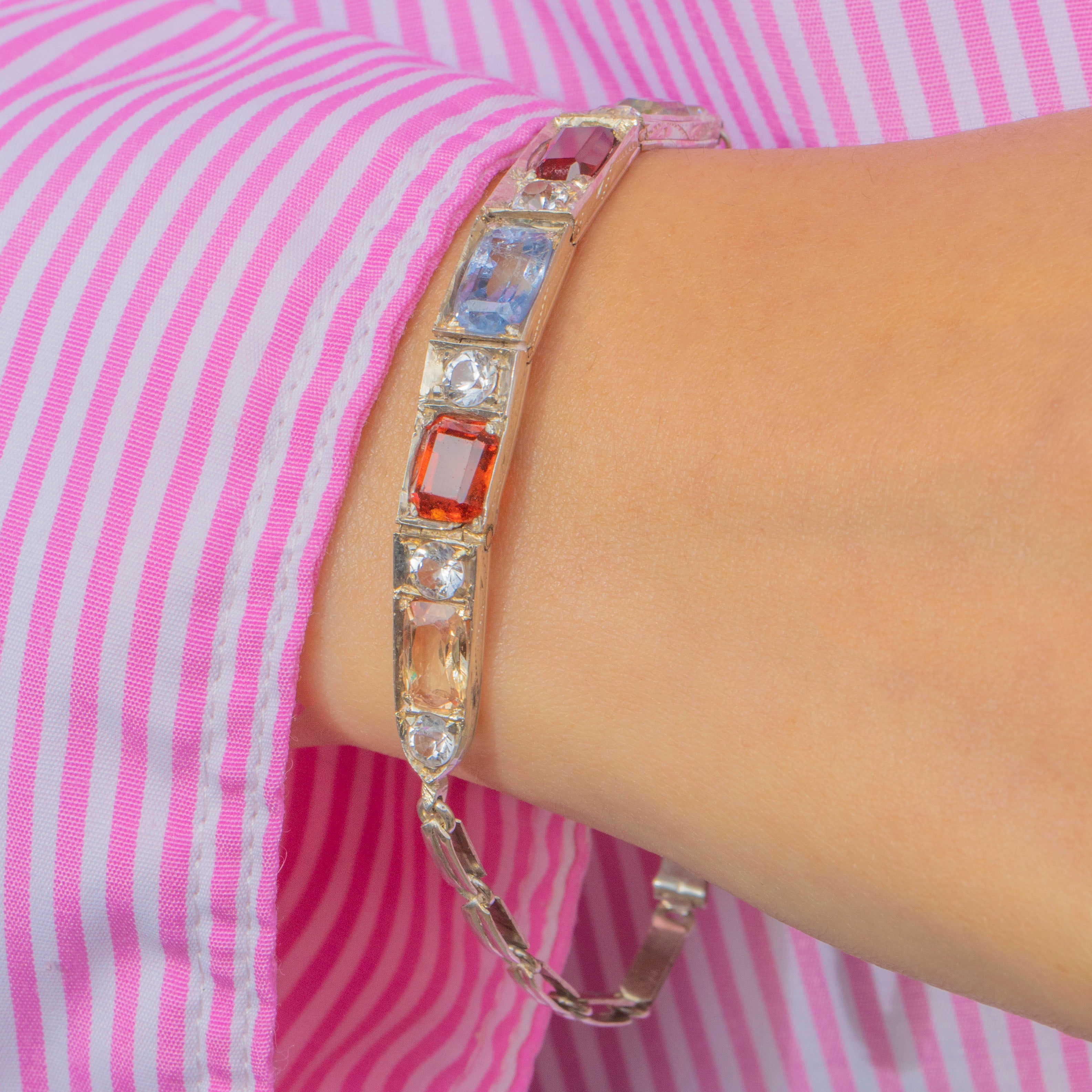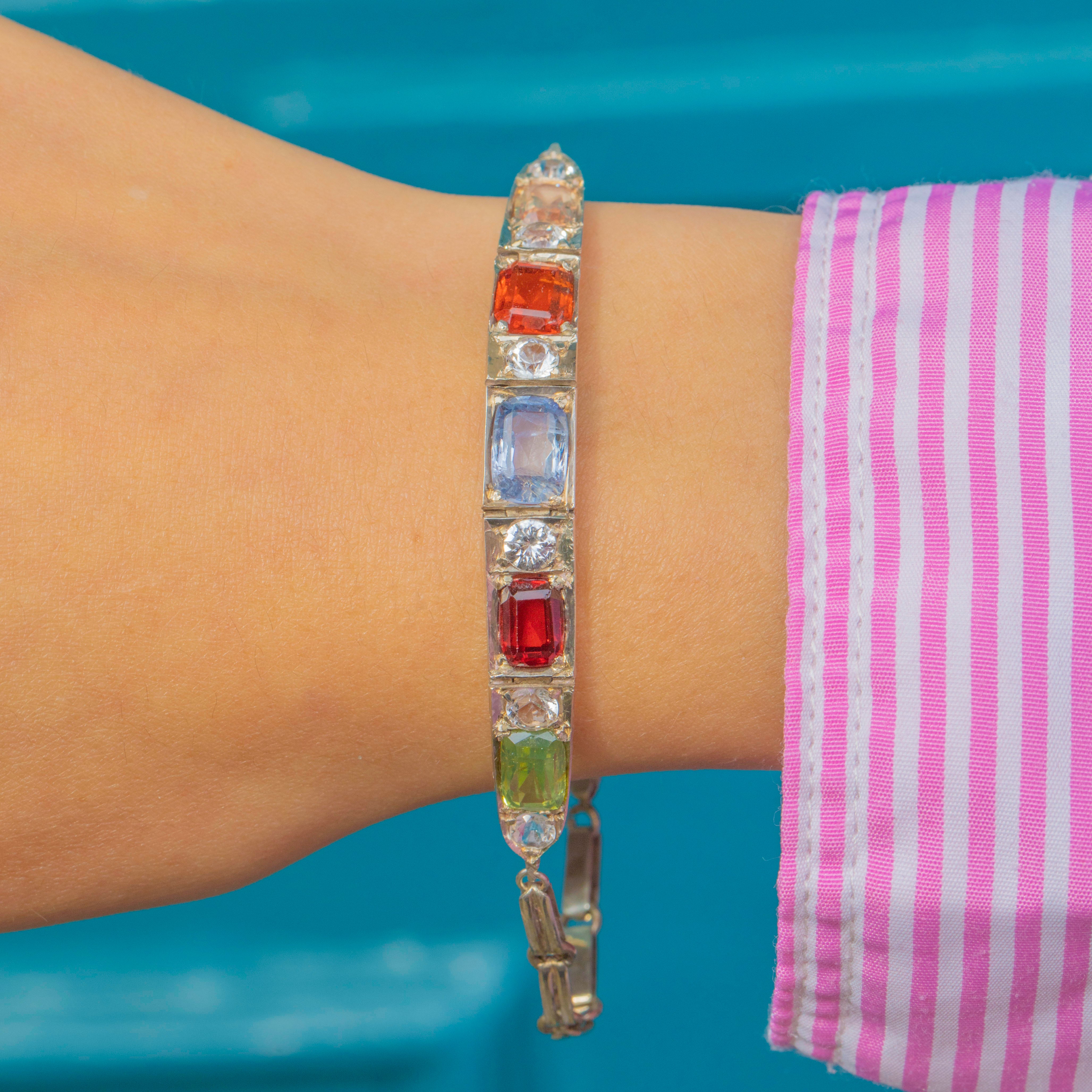 A rare and vibrant Art Deco bracelet, showcasing a dazzling harlequin arrangement of coloured gems. Each rectangular stone is framed by sparkling white round Sapphires, graduating neatly along the line. The palette is bold and joyful: a peachy Padparadscha Sapphire, fiery Madeira Citrine, soft cornflower-blue Sapphire, a rich red Paste, and a bright green Peridot. Together they create a vivid rainbow effect, perfectly encapsulating the playful glamour of the 1920s.
