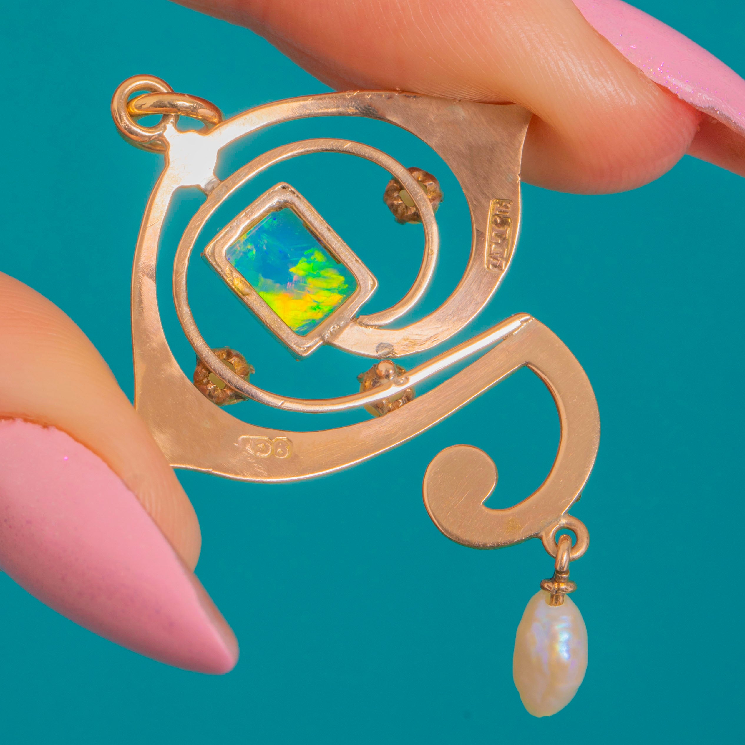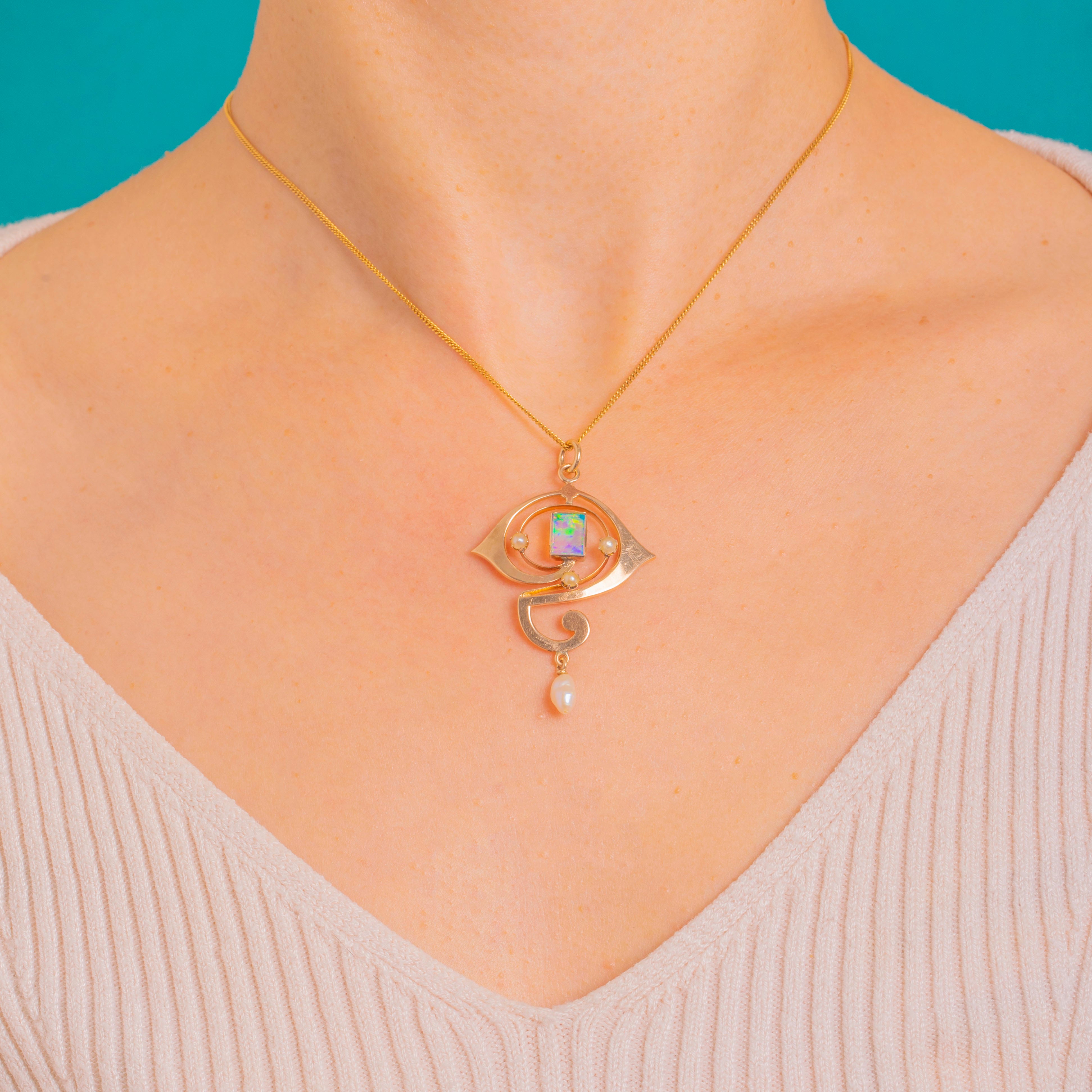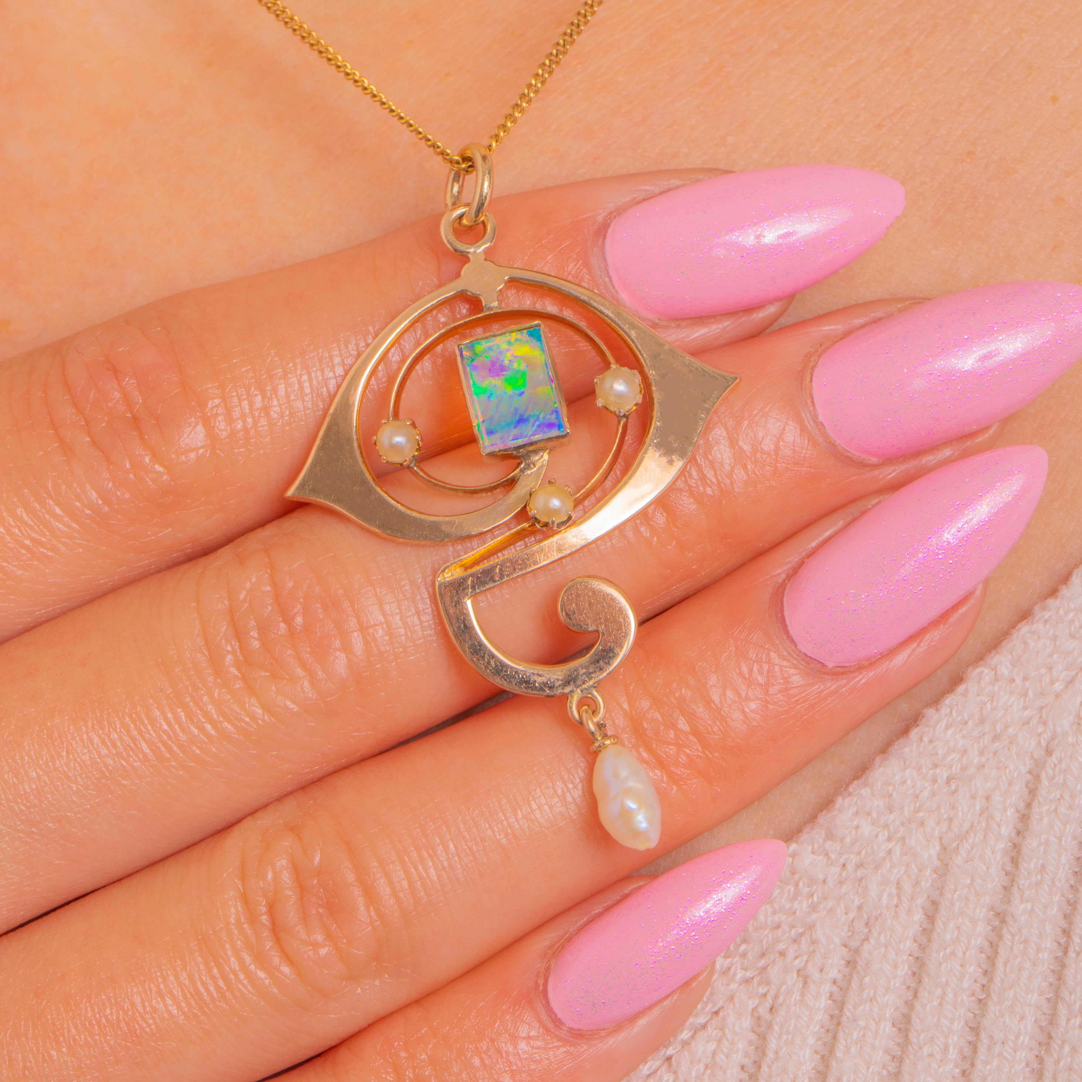 Sensuous scrolls and a poetic “question‑mark” silhouette make this Art Nouveau pendant a little work of wearable art. Crafted in 9ct Gold, its openwork curves frame a rectangular Opal cabochon that shimmers with blue‑green fire and golden flashes. Three petite Pearls accent the sweep, while a baroque Pearl drop lends graceful movement with every step.