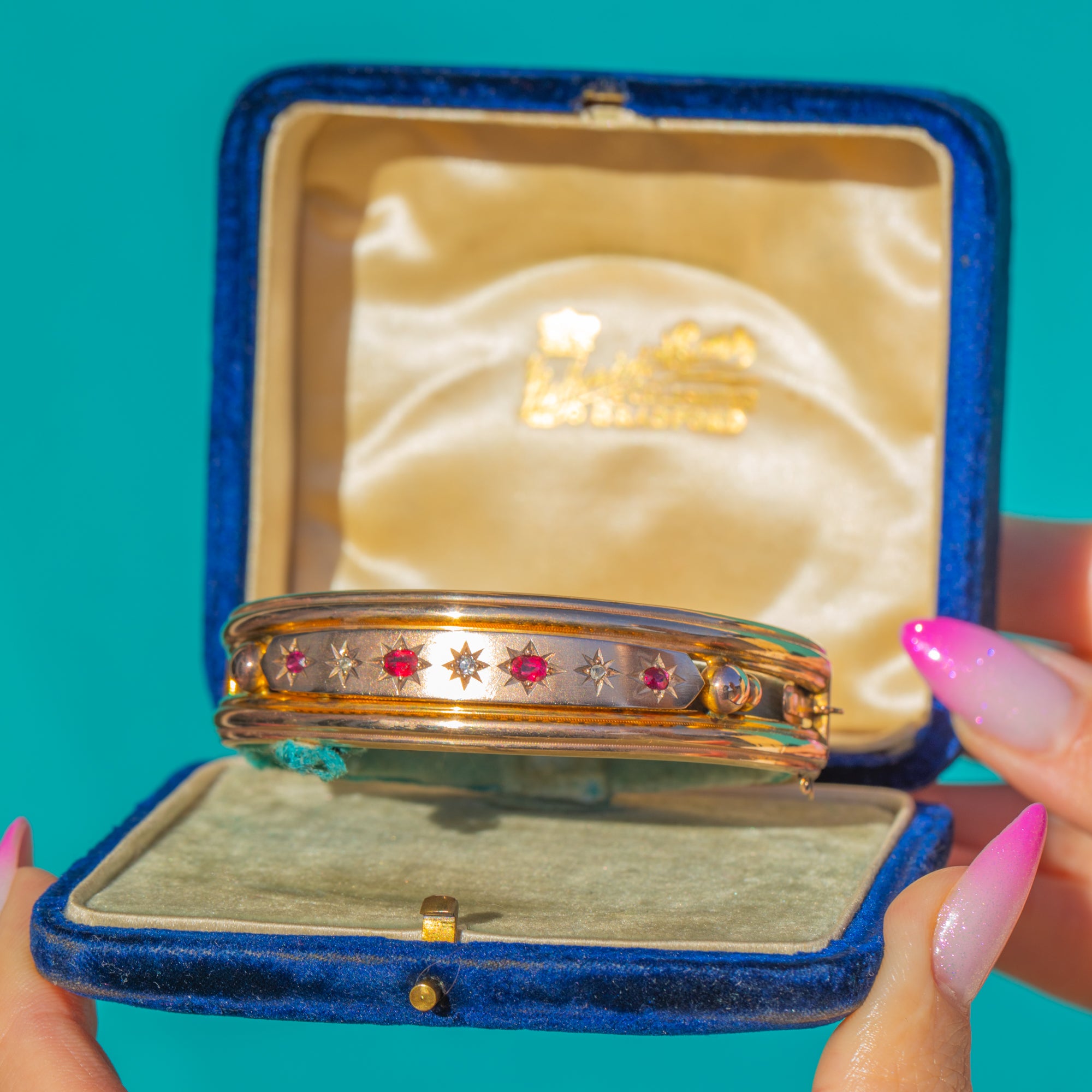 RARE BOXED Antique 9ct Gold Star-Set Ruby Diamond Bangle