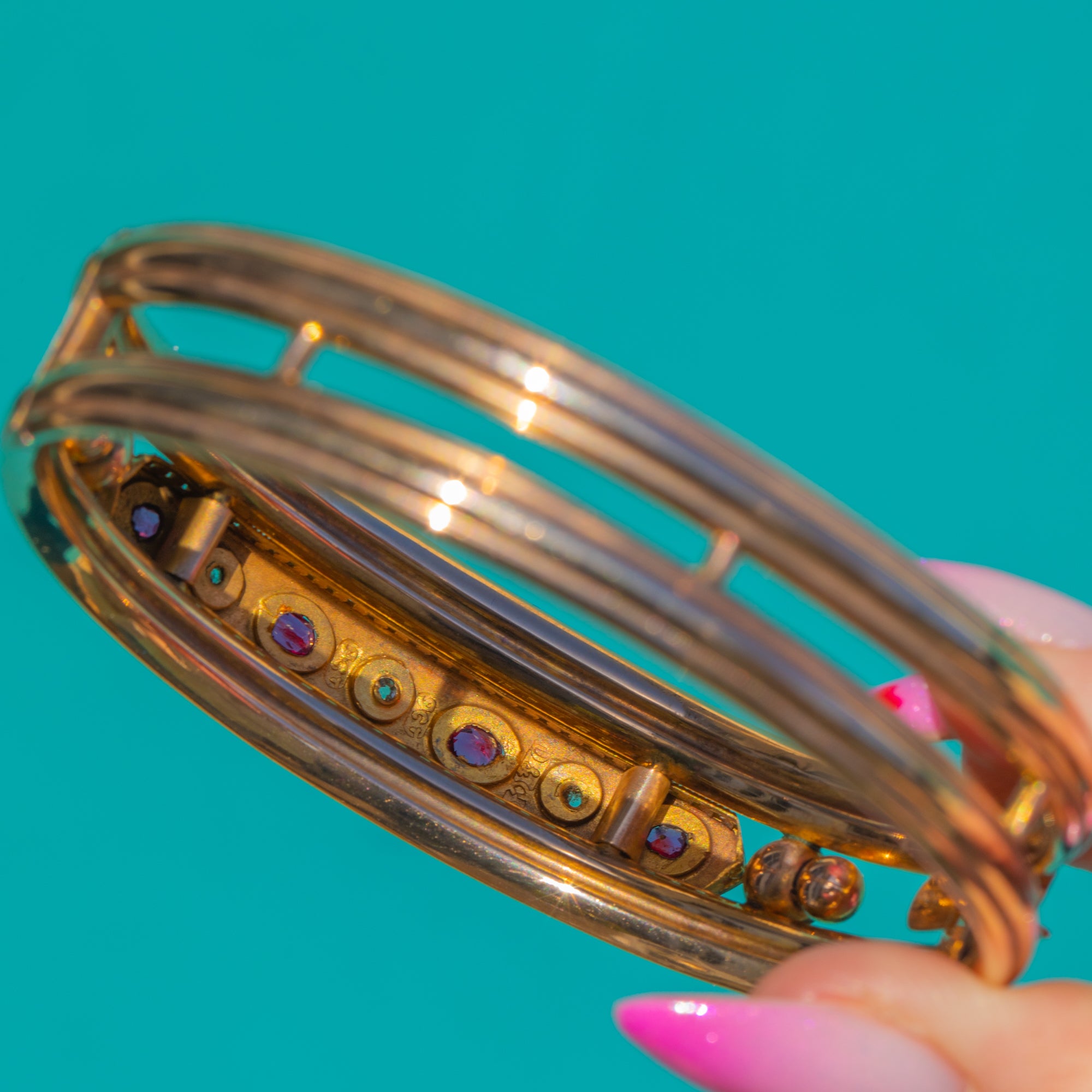 EXCELLENT: Rubies and Diamonds are bright, well-matched and securely set with minimal facet wear visible under magnification. Gold surfaces show light surface scratches and a gentle patina consistent with age. Hinge and clasp are in good working order with a safety loop for added security.