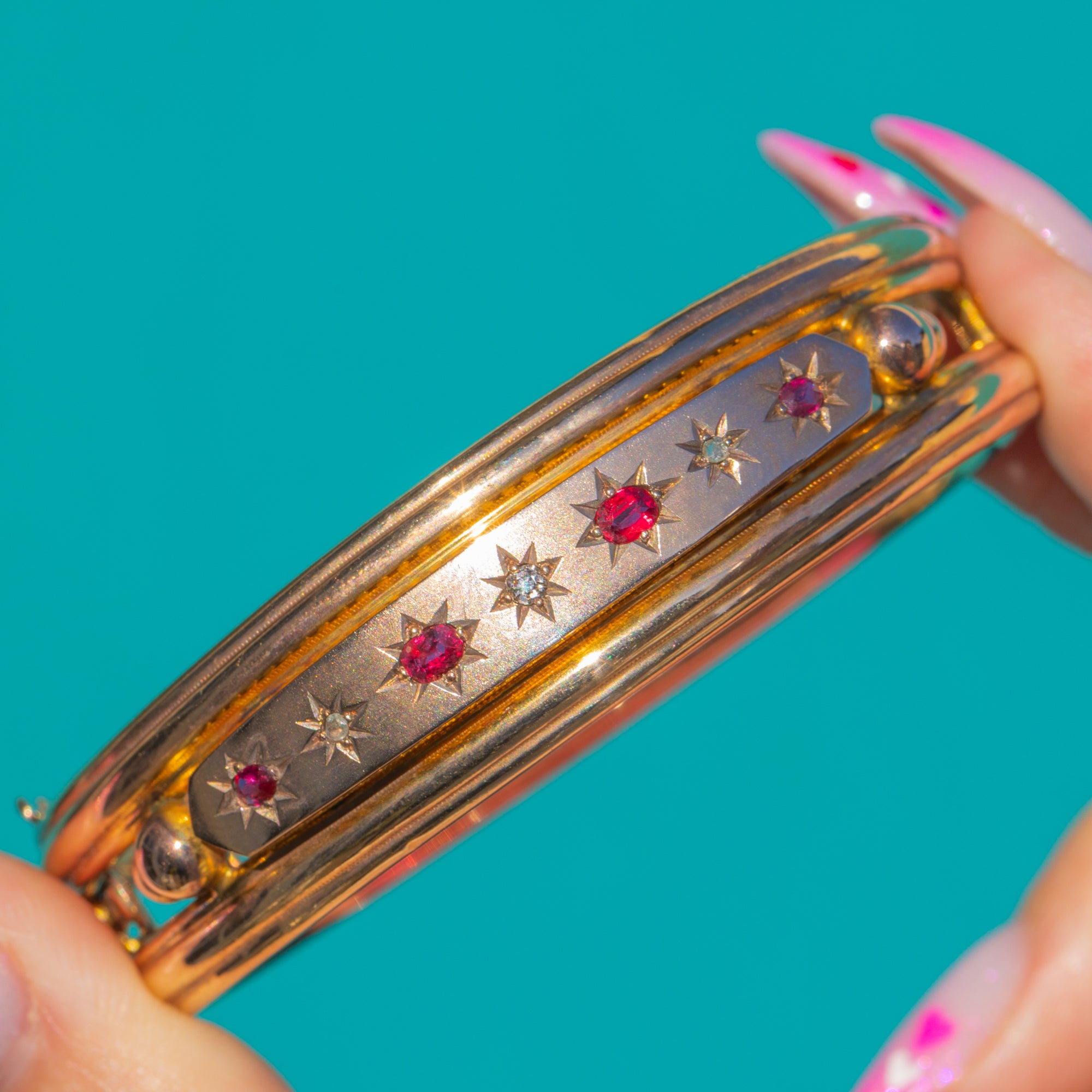 A refined Victorian 9ct Gold hinged bangle, star-set with a rhythmic line of Rubies and twinkling Diamonds. The raised central panel presents a subtle two‑tone look against the warmer Gold rails, each gemstone framed by crisp, engraved eight‑point stars for that quintessential late‑19th century sparkle.