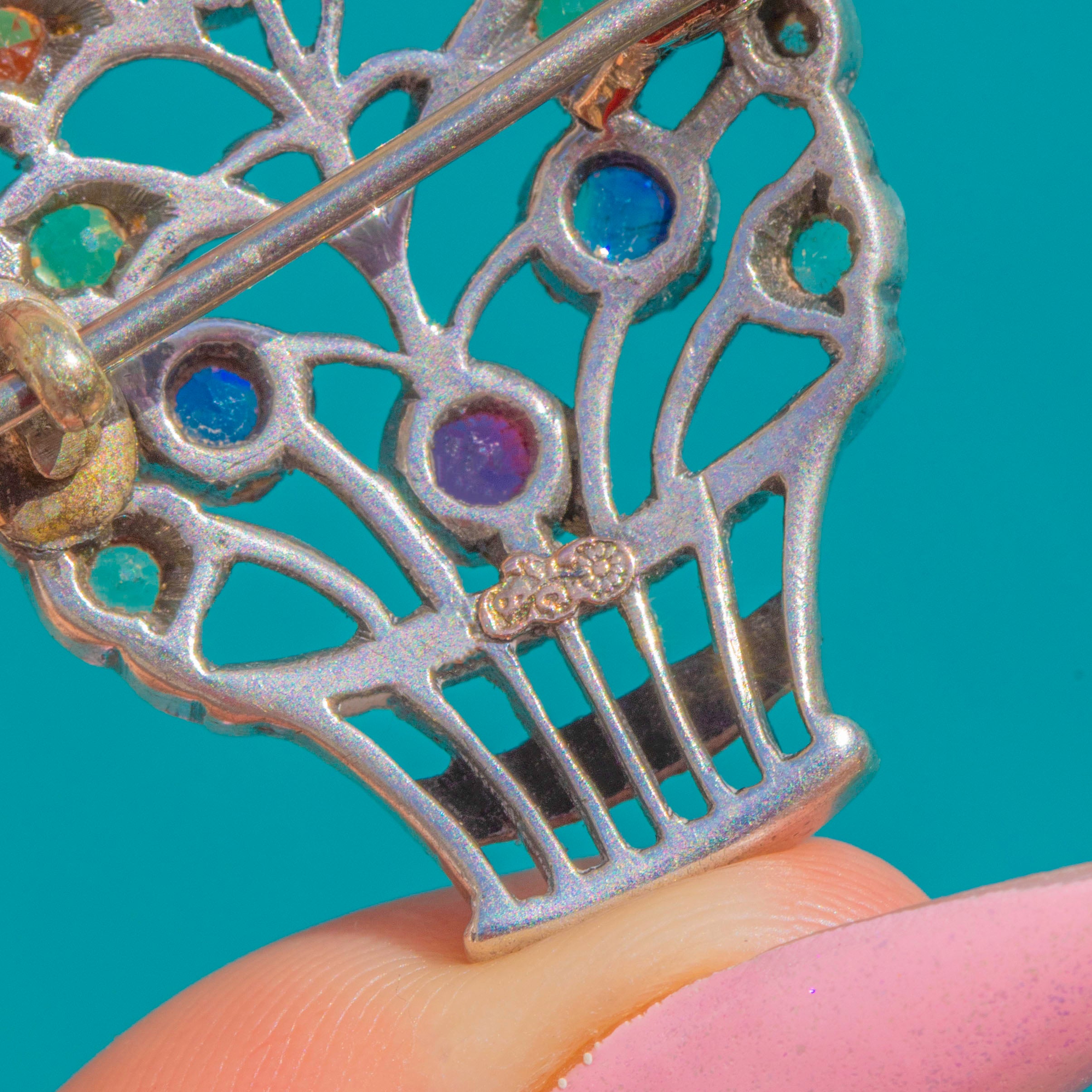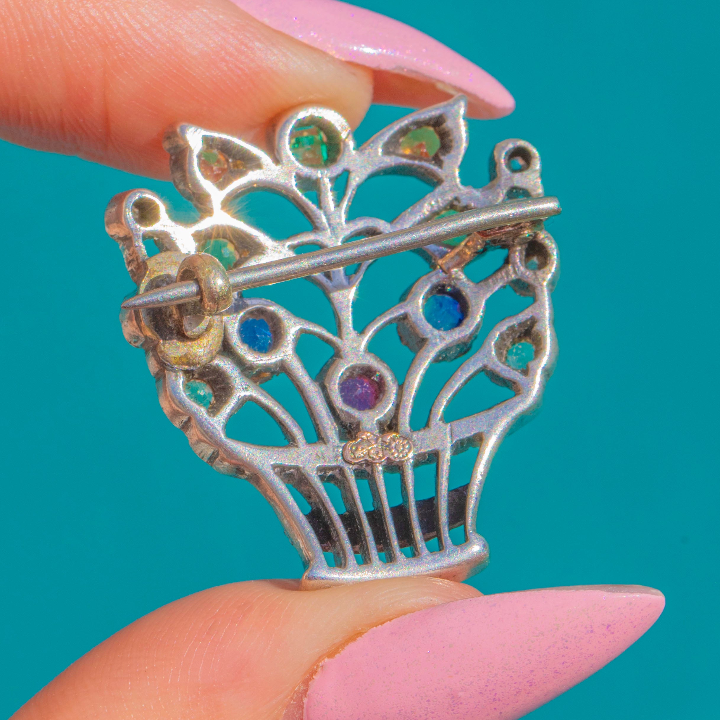 A rare Edwardian “giardinetti” brooch by the celebrated London house Child & Child, this jewel blooms with a joyous basket of flowers. Finely crafted in Sterling Silver with 9ct Gold details, the fluted basket and openwork foliage are alive with jewel‑bright colour: Ruby, Sapphire and Yellow Sapphire mingle with Emerald, Citrine and scintillating Diamond accents in a charming posy.