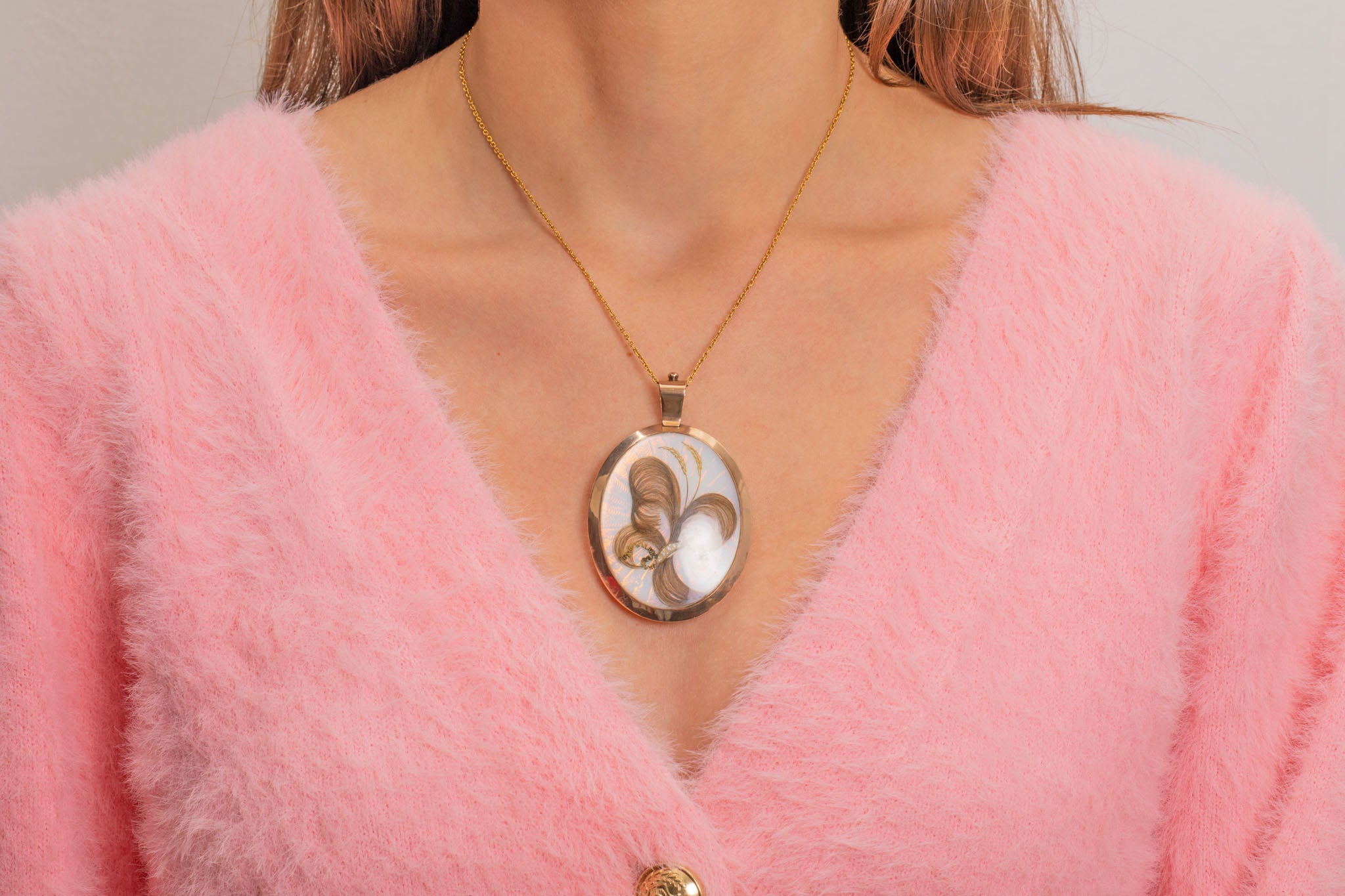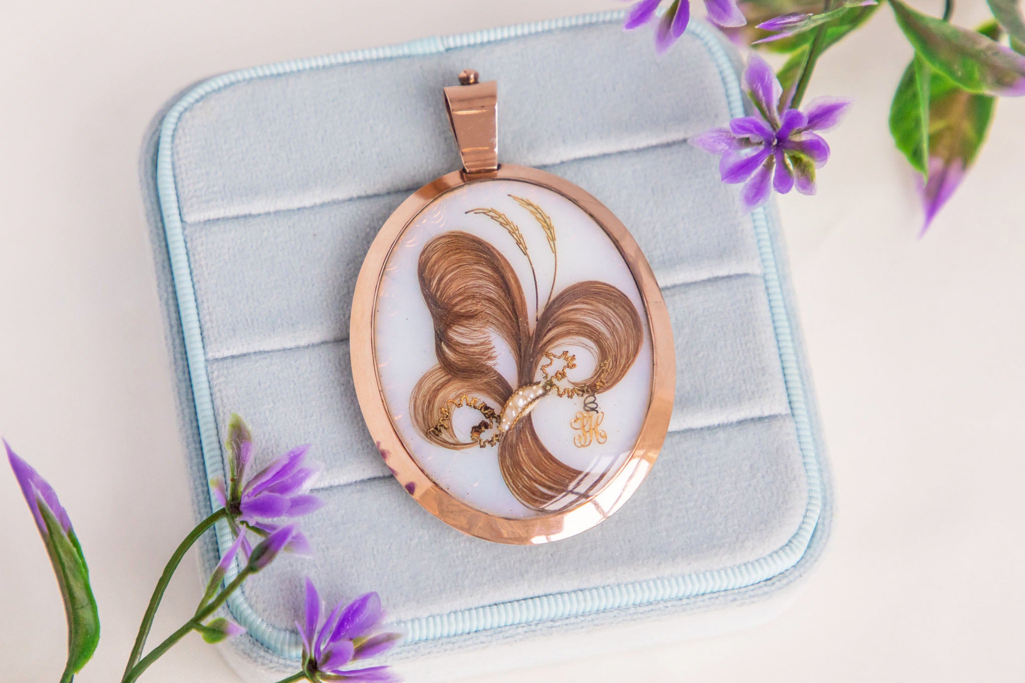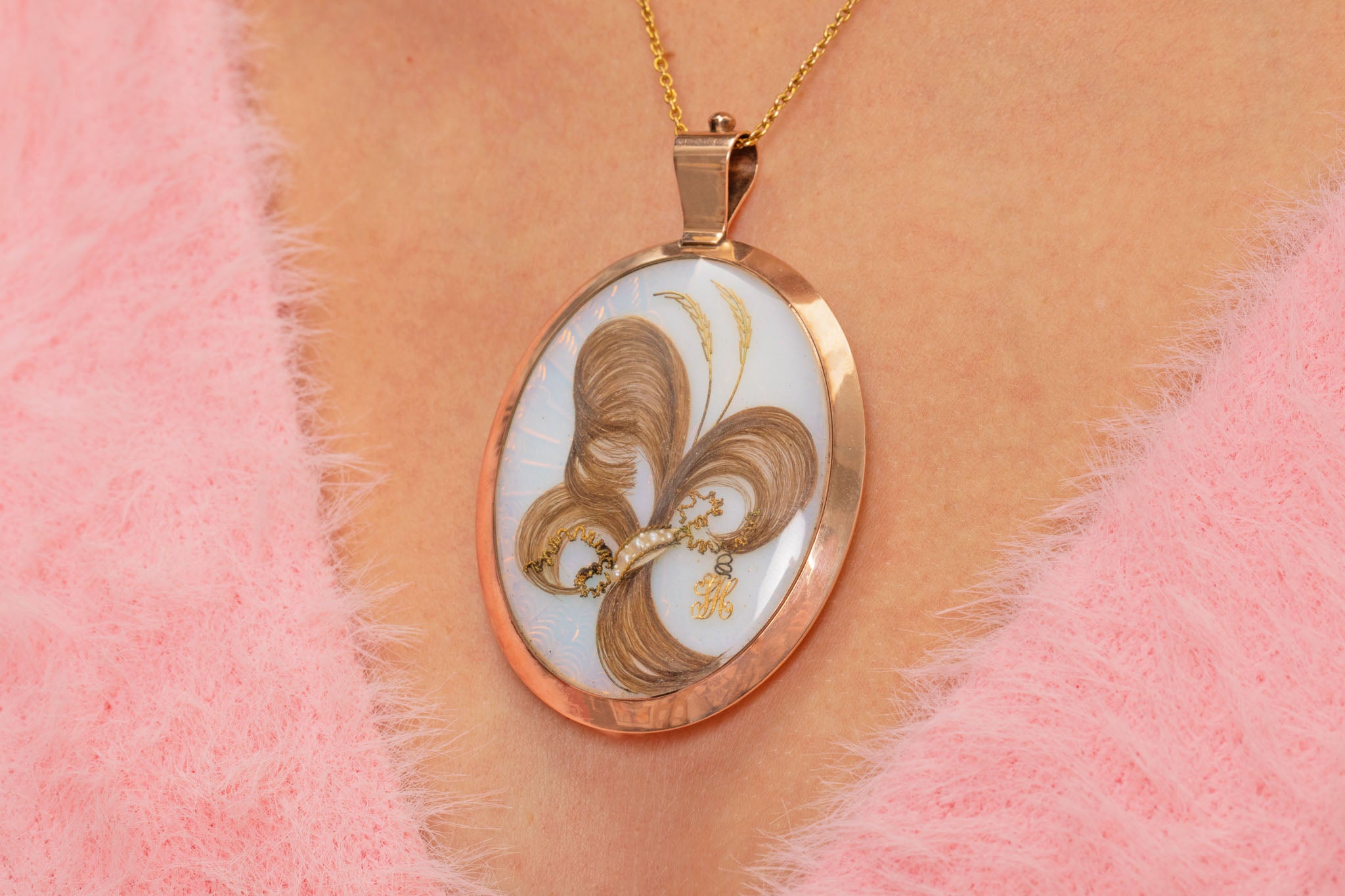 The locket has been crafted from 9ct Gold, and has a sizeable bale in order to support its weight when suspended from a chain. The inside of the locket has an Opaline panel on the back, which shimmers with a soft iridescence of mauves and tangerine! Resting upon this is intricately moulded hair on both sides, which would once have belonged to very special people that someone wanted to keep very close.