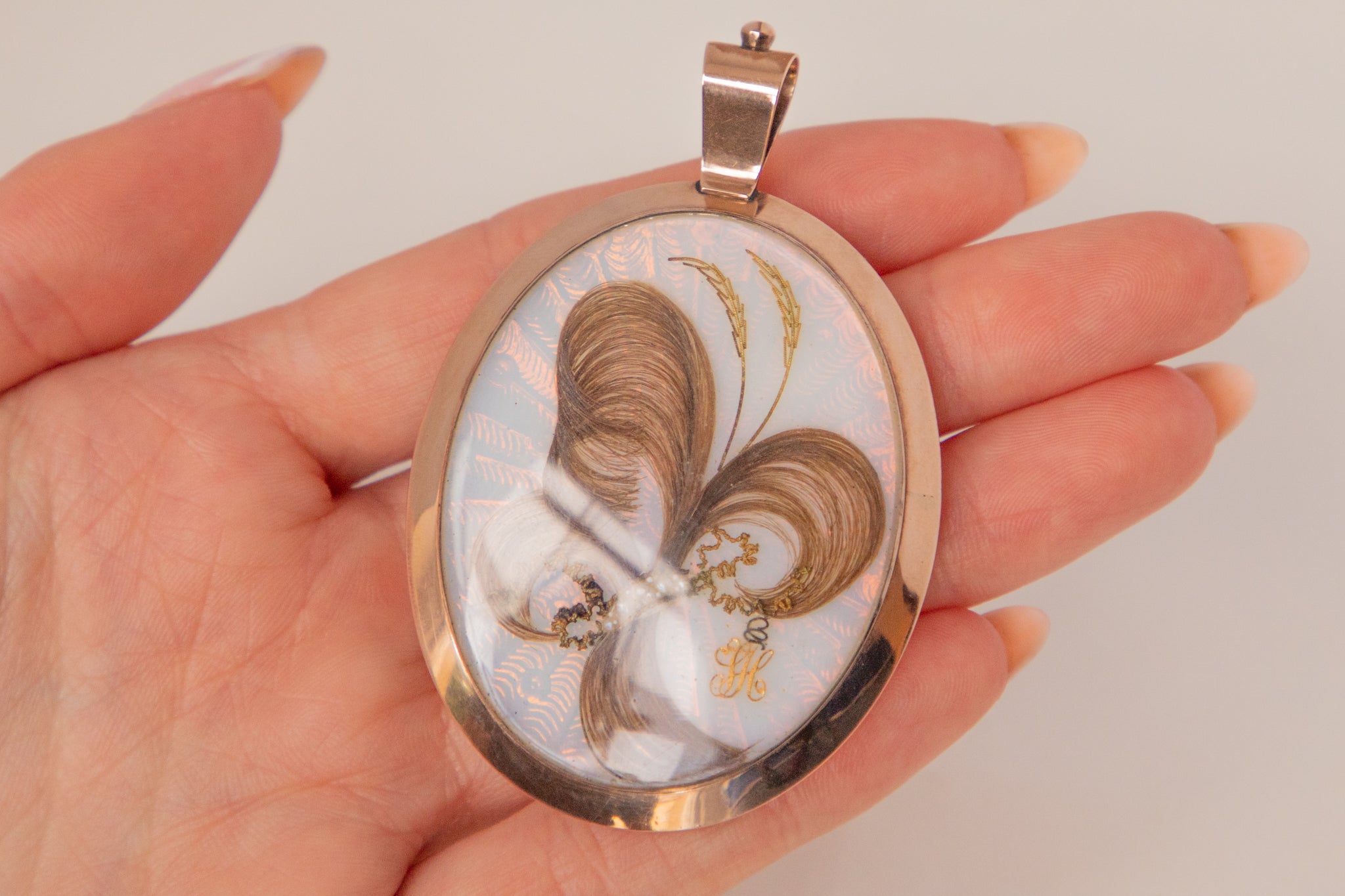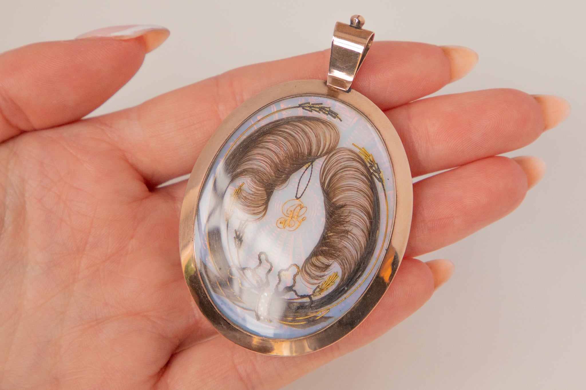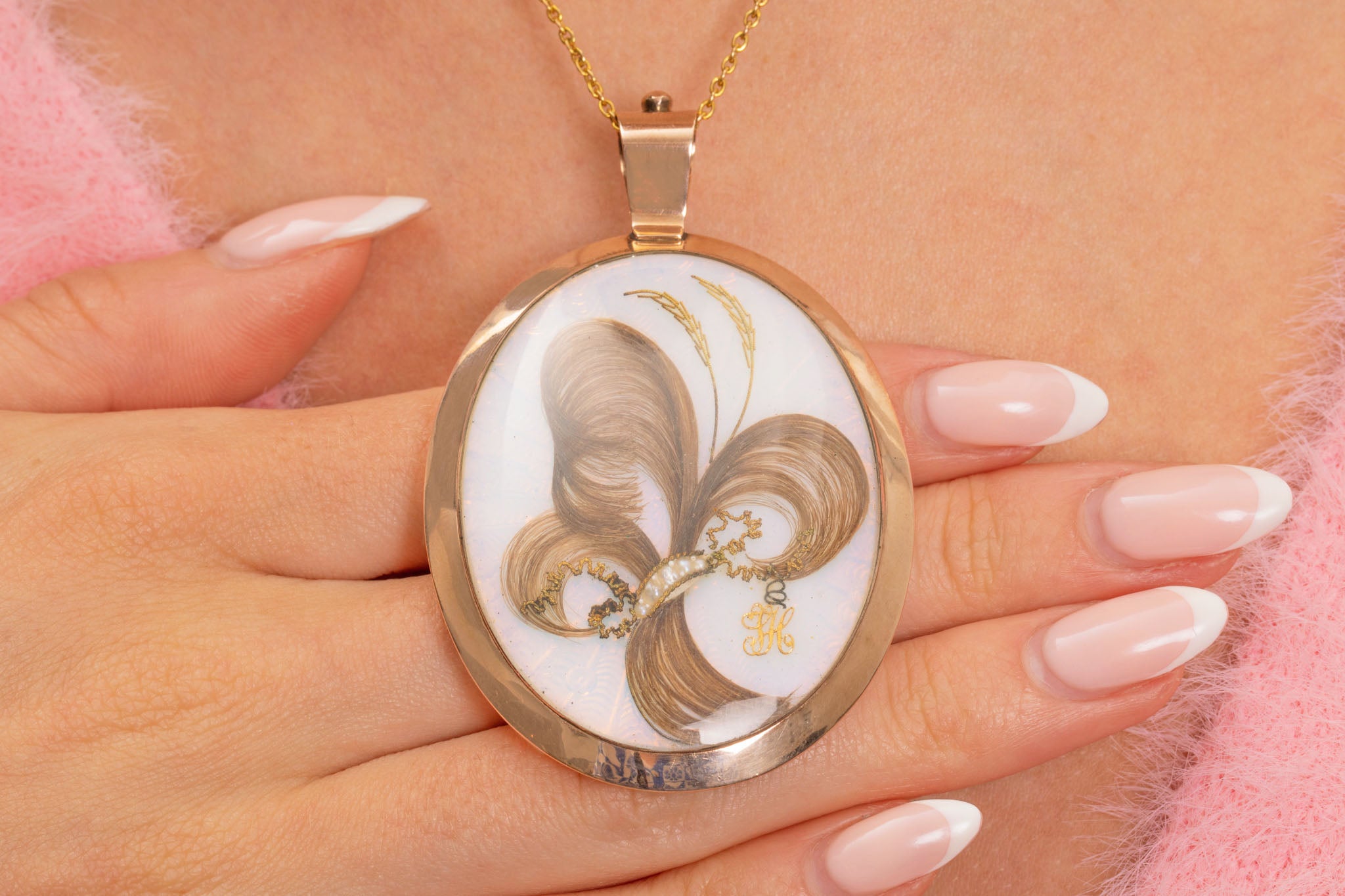 The locket has been crafted from 9ct Gold, and has a sizeable bale in order to support its weight when suspended from a chain. The inside of the locket has an Opaline panel on the back, which shimmers with a soft iridescence of mauves and tangerine! Resting upon this is intricately moulded hair on both sides, which would once have belonged to very special people that someone wanted to keep very close.