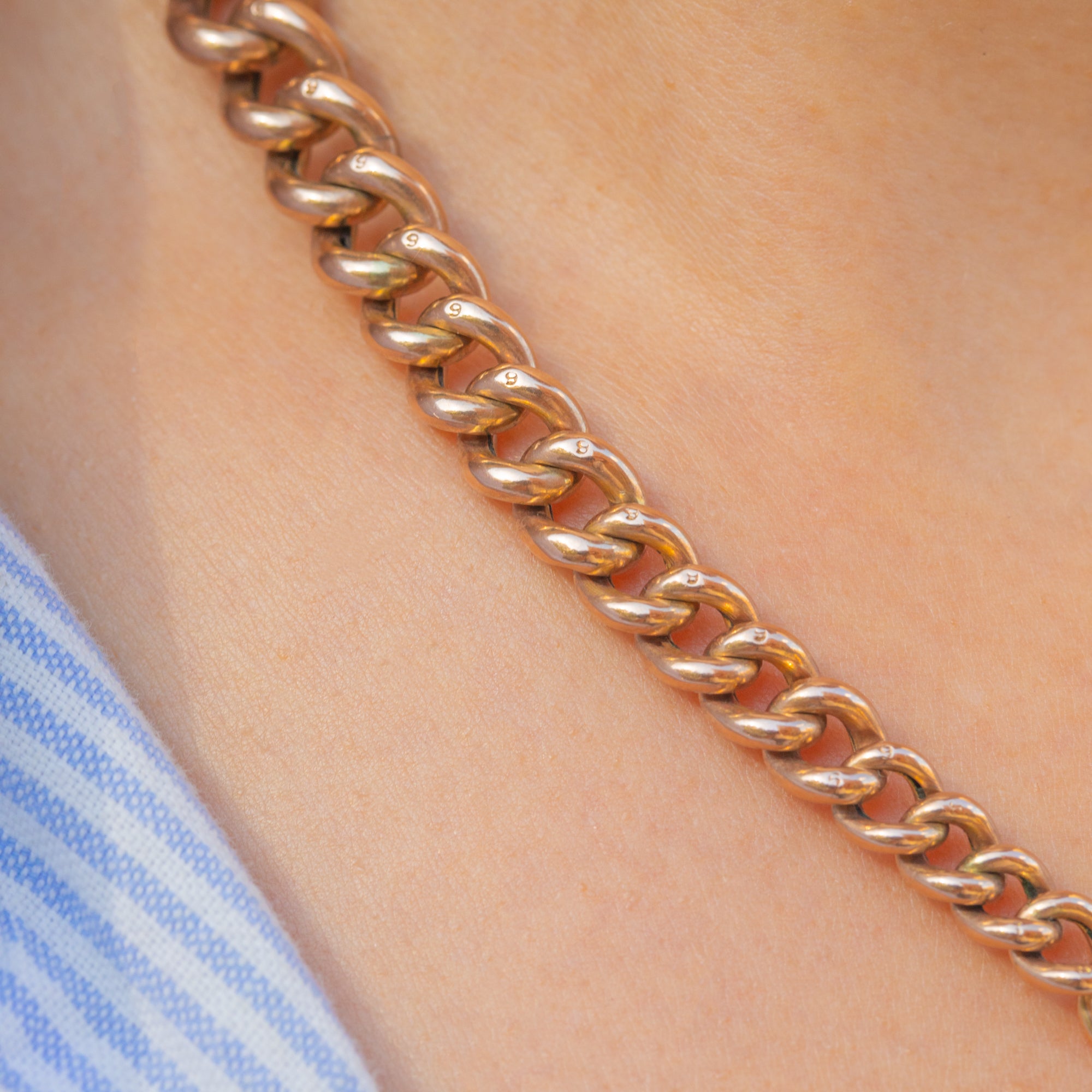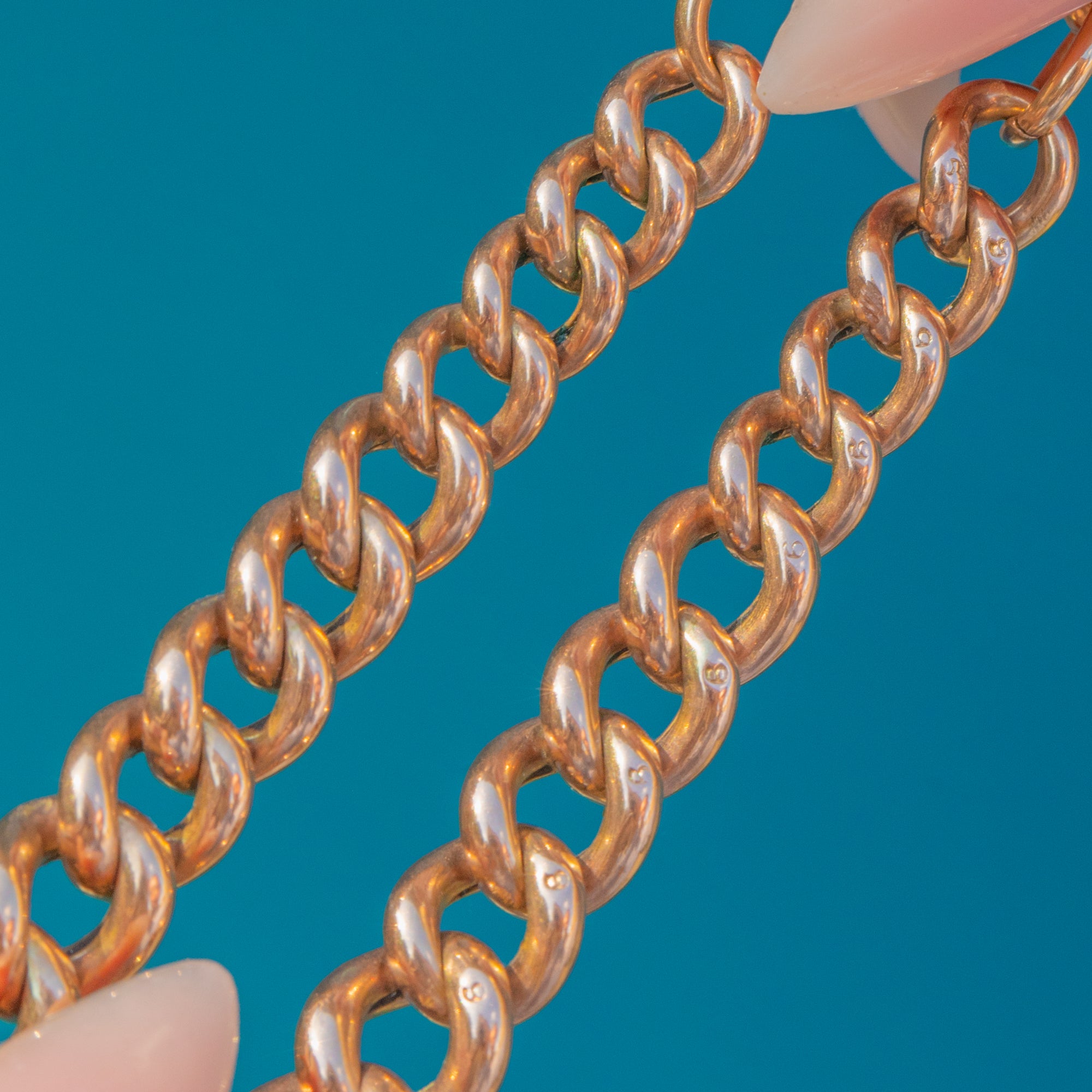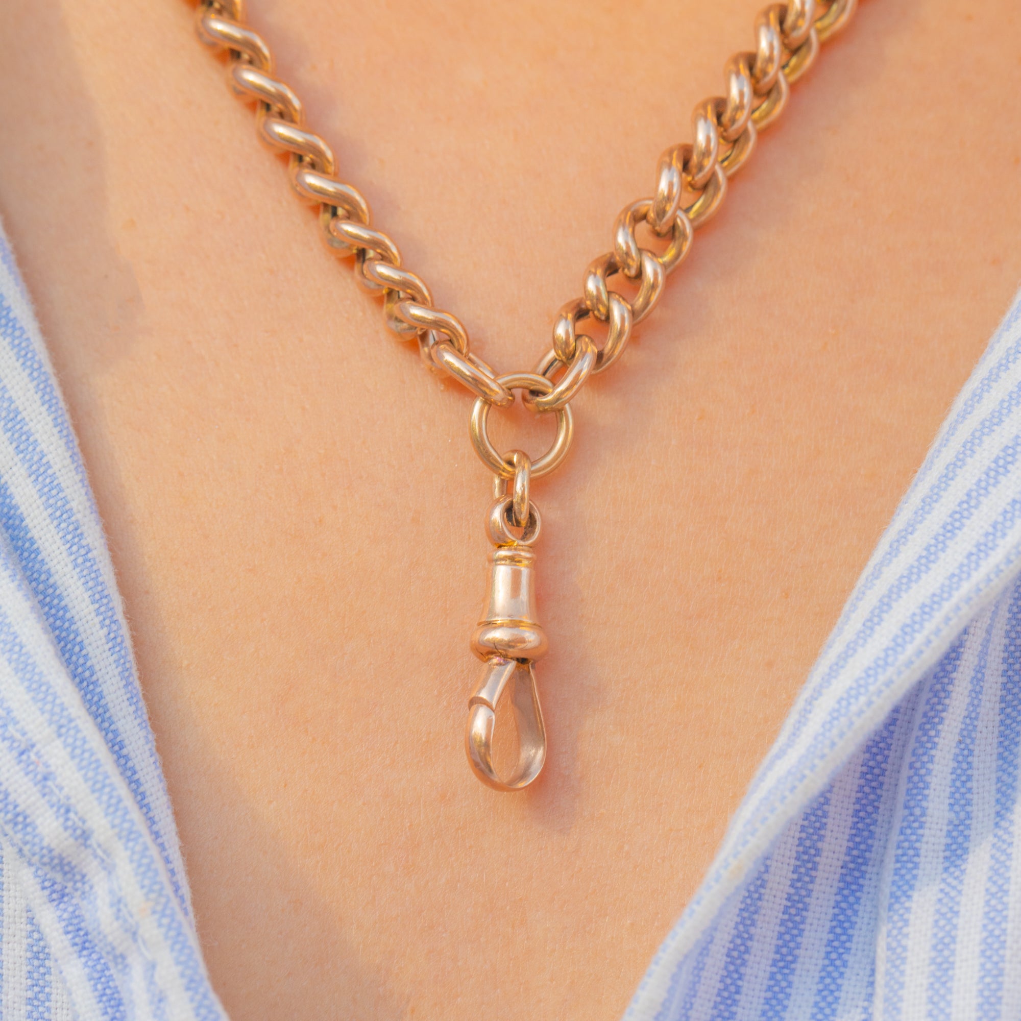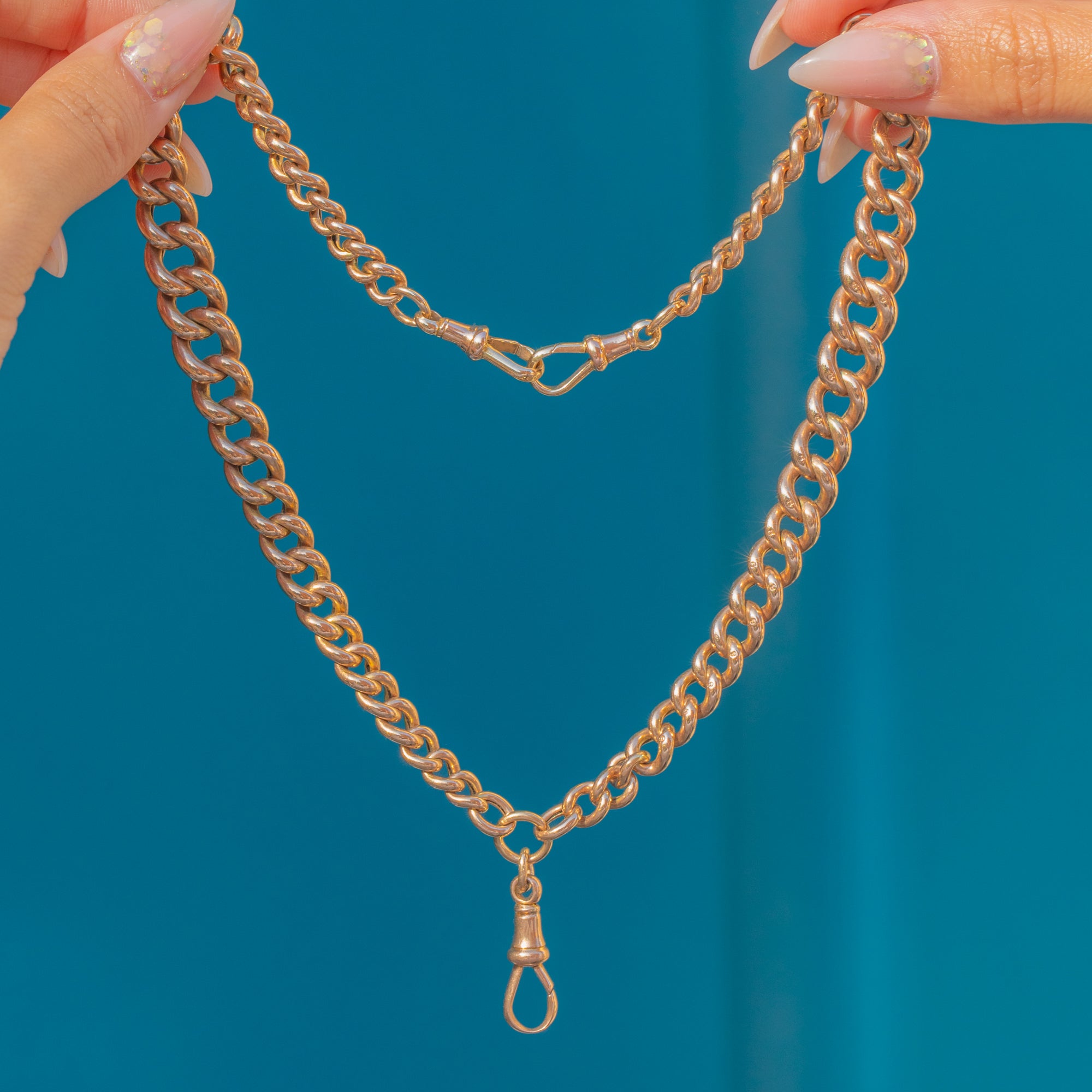 Glowing with the warm hue of 9ct Gold and stamped to each link, its impressive 27.1g weight gives a luxurious drape and satisfying presence. A timeless Victorian silhouette that seamlessly bridges function and finesse, perfect worn solo or layered.