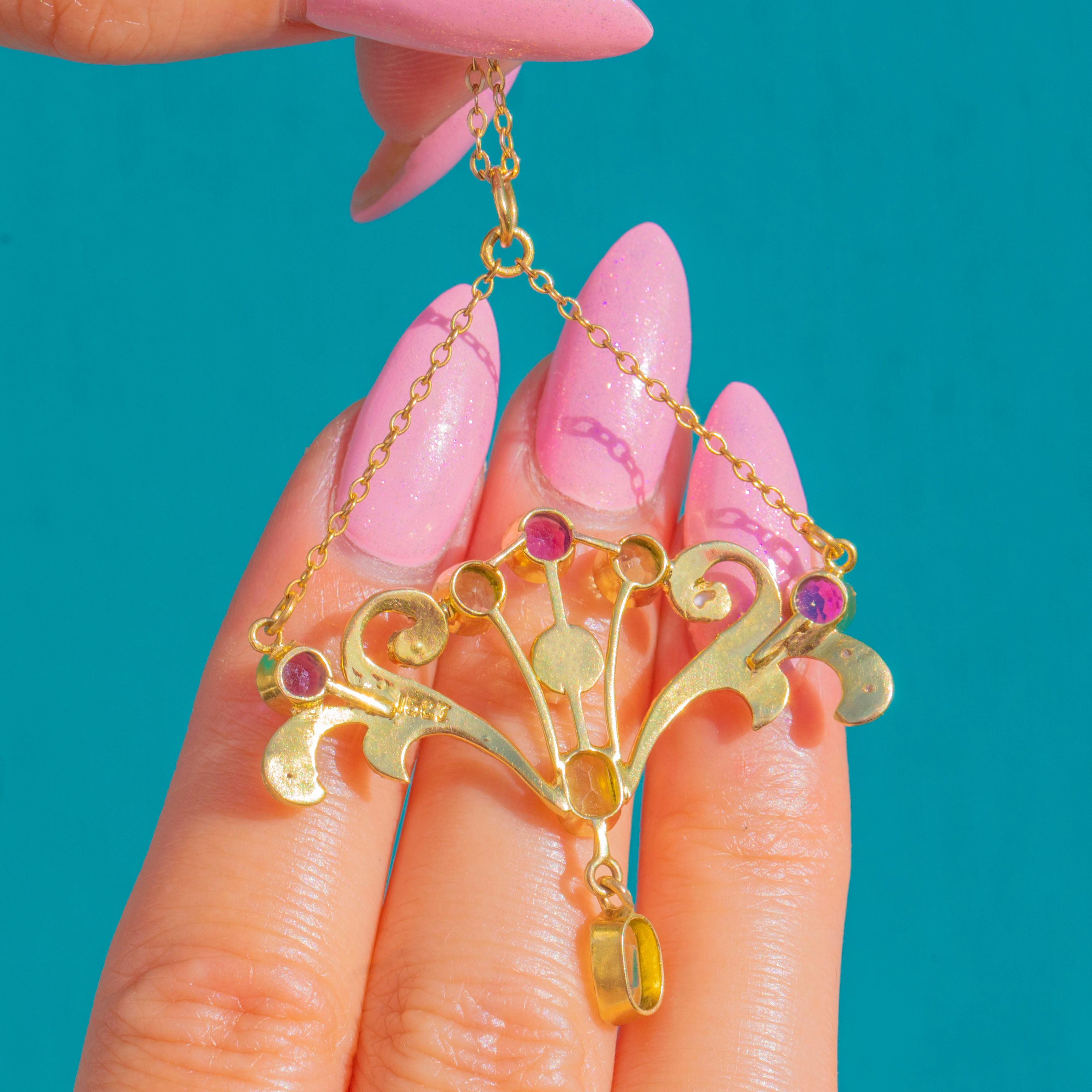 Delicate yet ornate, this Y‑style jewel has beautiful movement and light-play across its vibrant gems and Pearly highlights. A timeless piece with all the romance of the Edwardian era, ready to wear and enjoy.