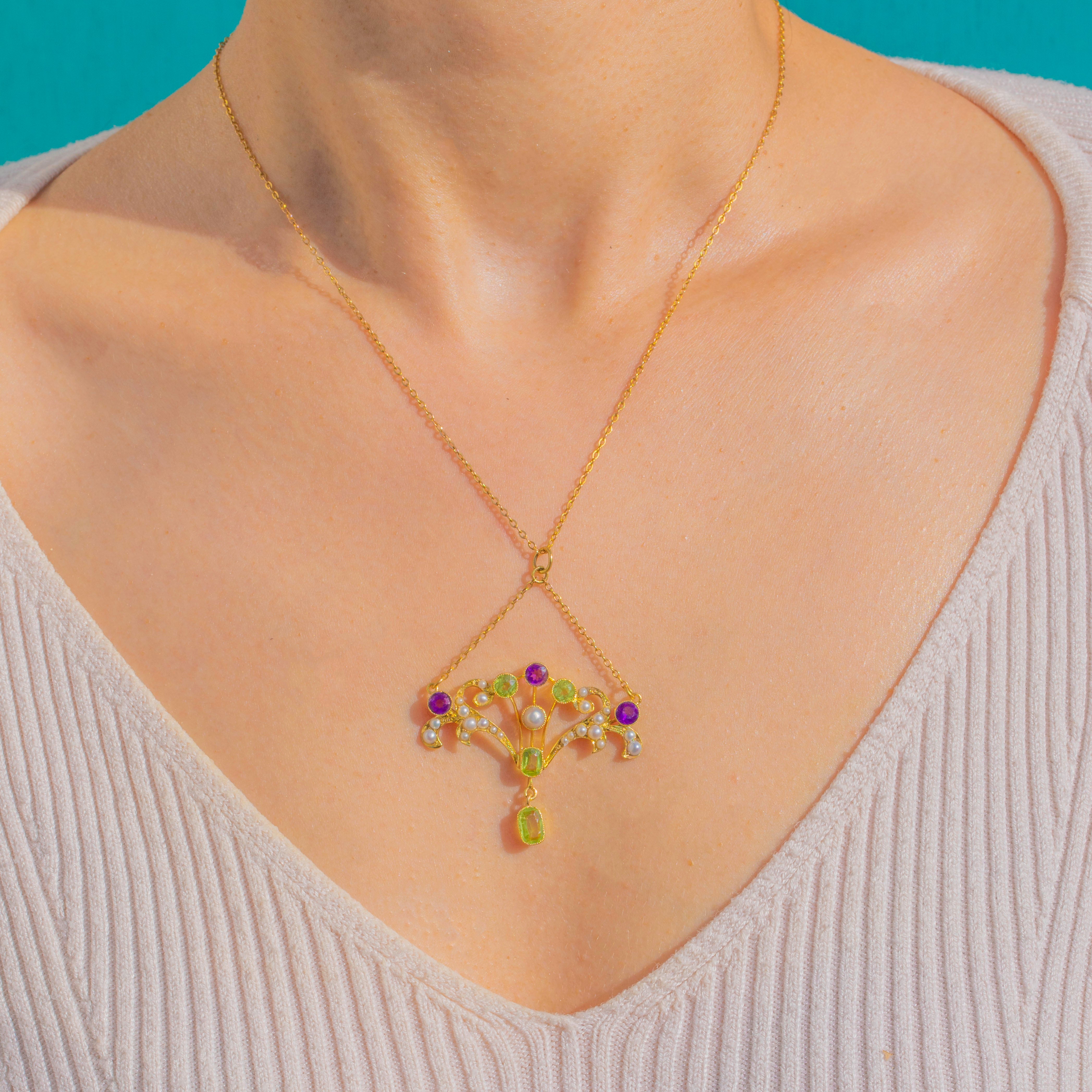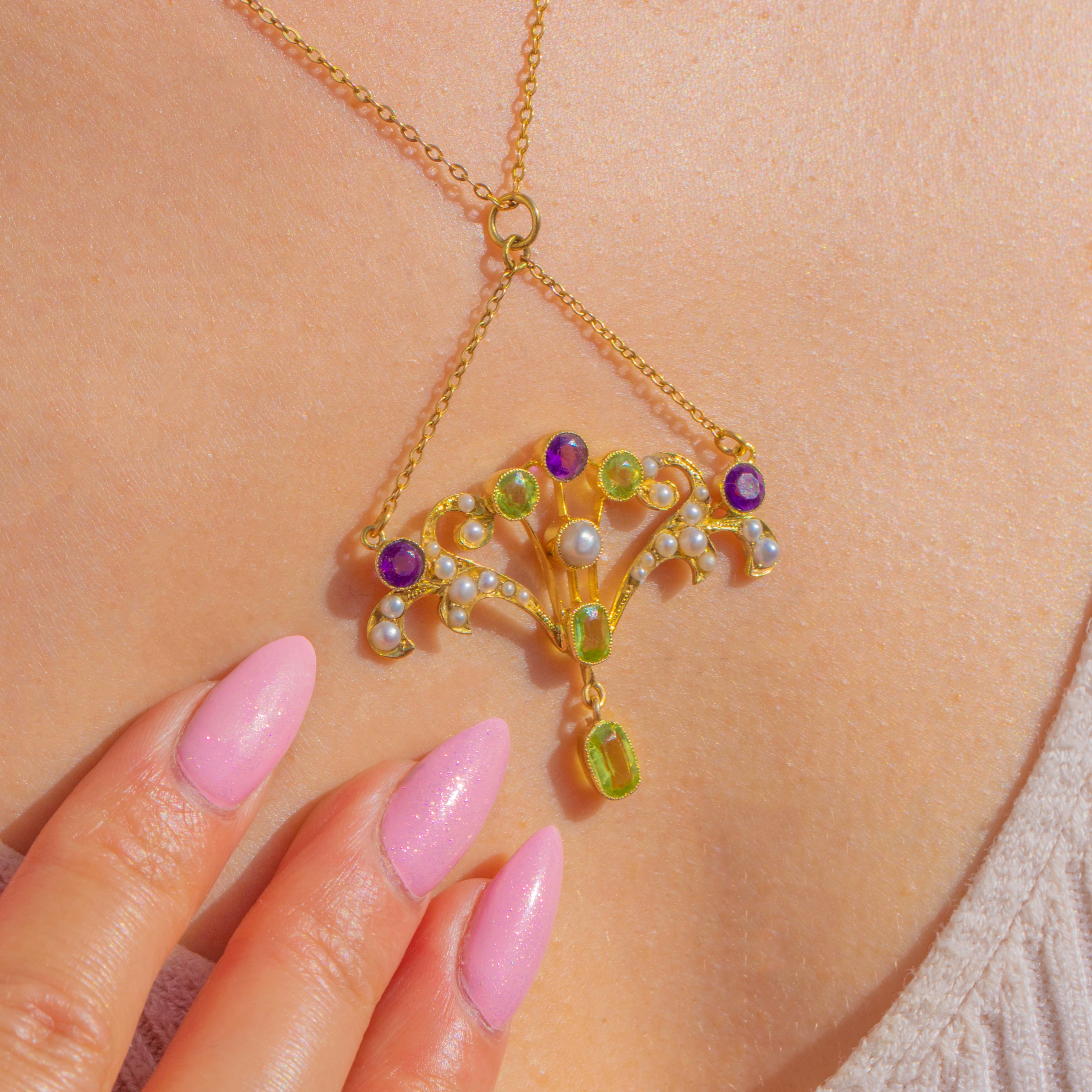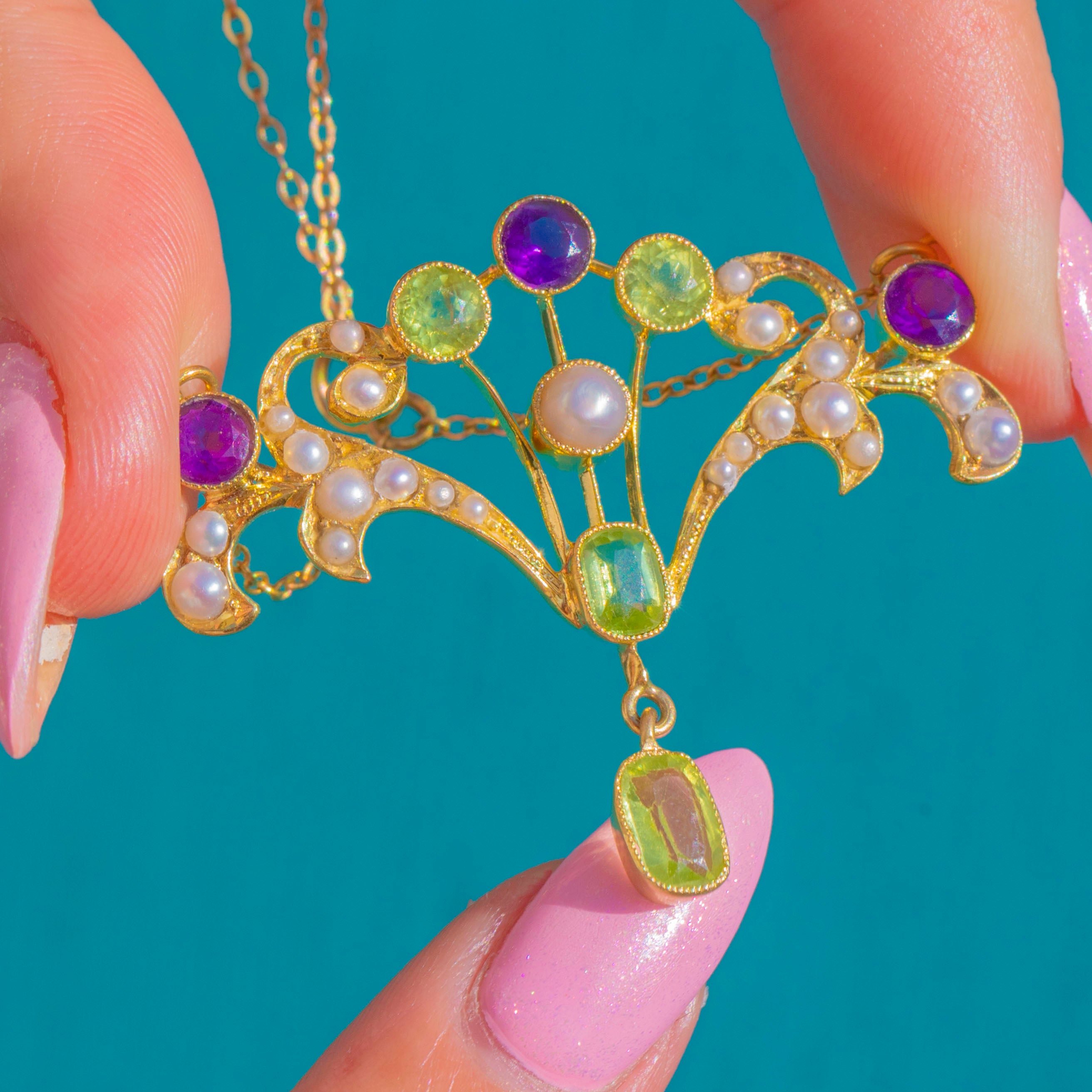 A lyrical Edwardian lavalier pendant in 15ct Gold showcasing the classic Suffragette palette of Amethyst, Peridot and Pearl. The openwork foliate motif unfurls with graceful scrolls and fine milgrain accents, set with bright round Amethysts, fresh green Peridots and lustrous Pearls. An articulated rectangular Peridot drop adds a final, elegant flourish, and the pendant is presented on a fine 16" 9ct Gold chain.