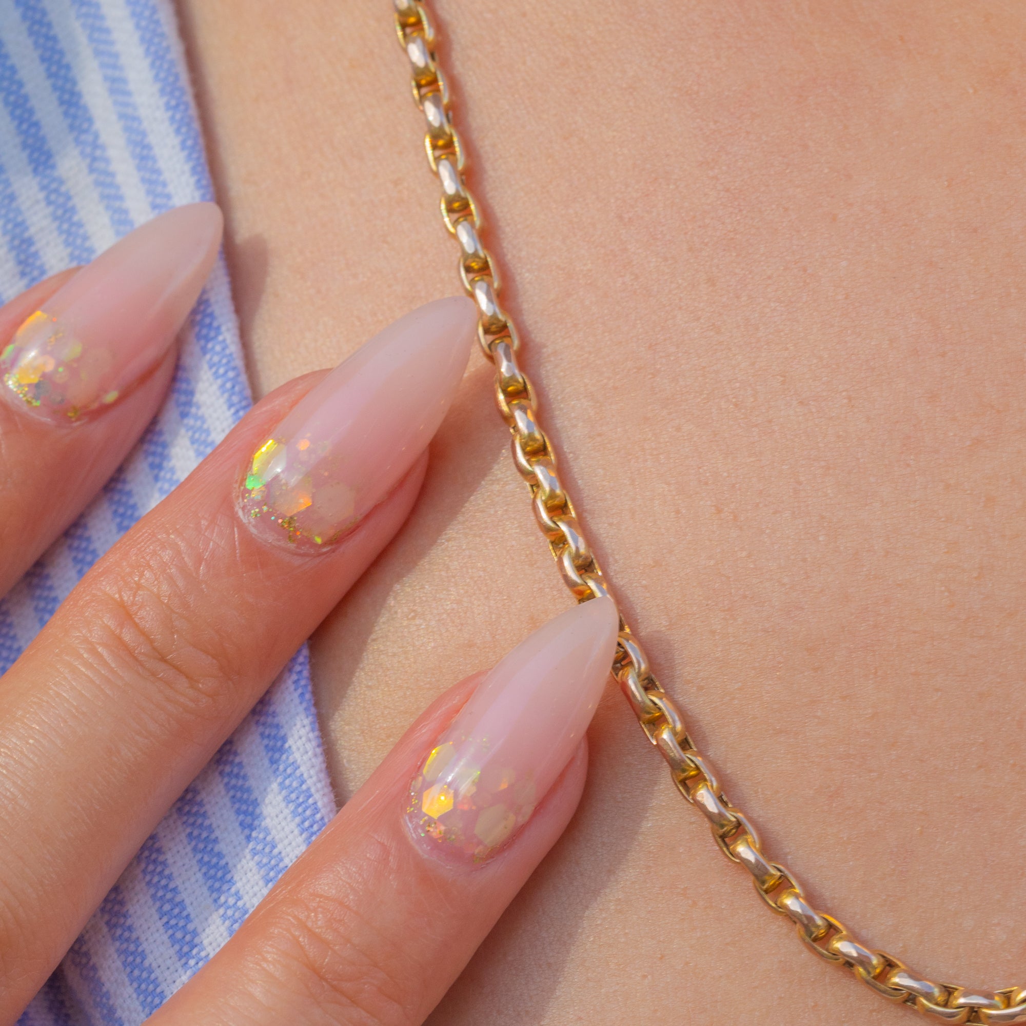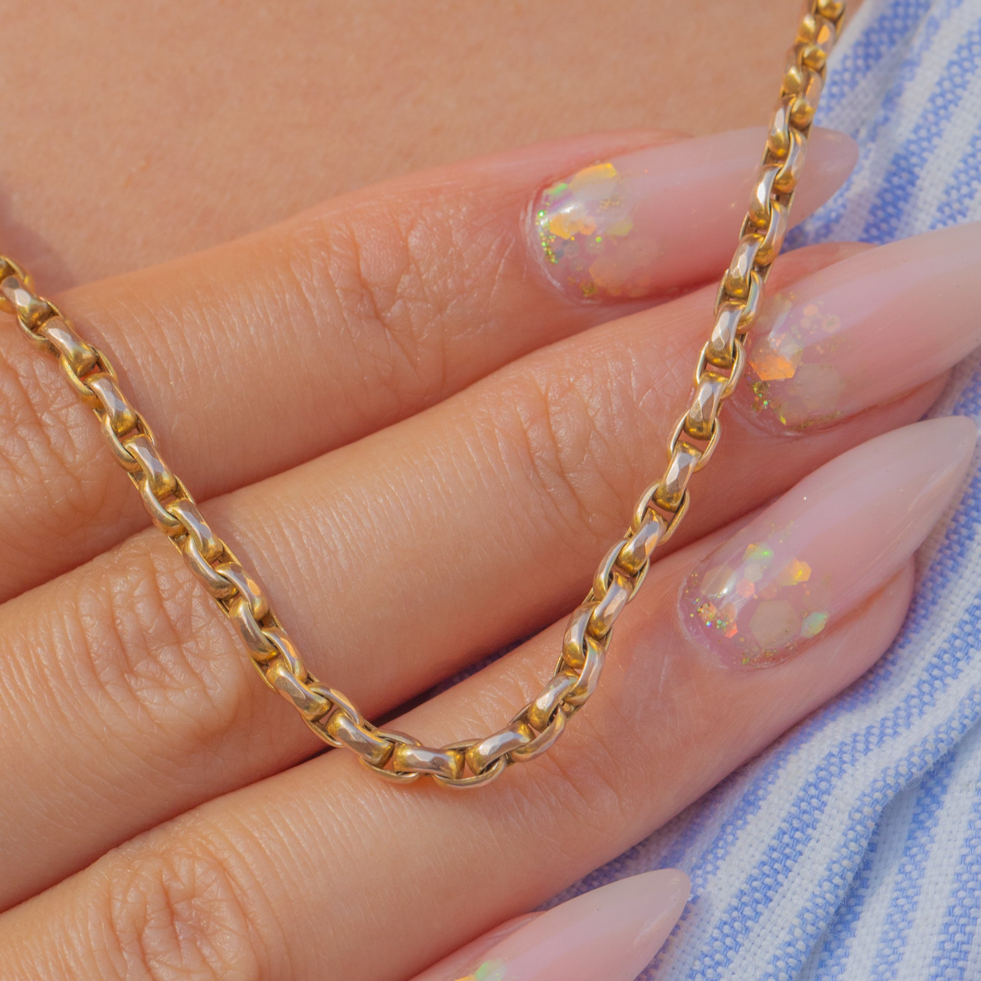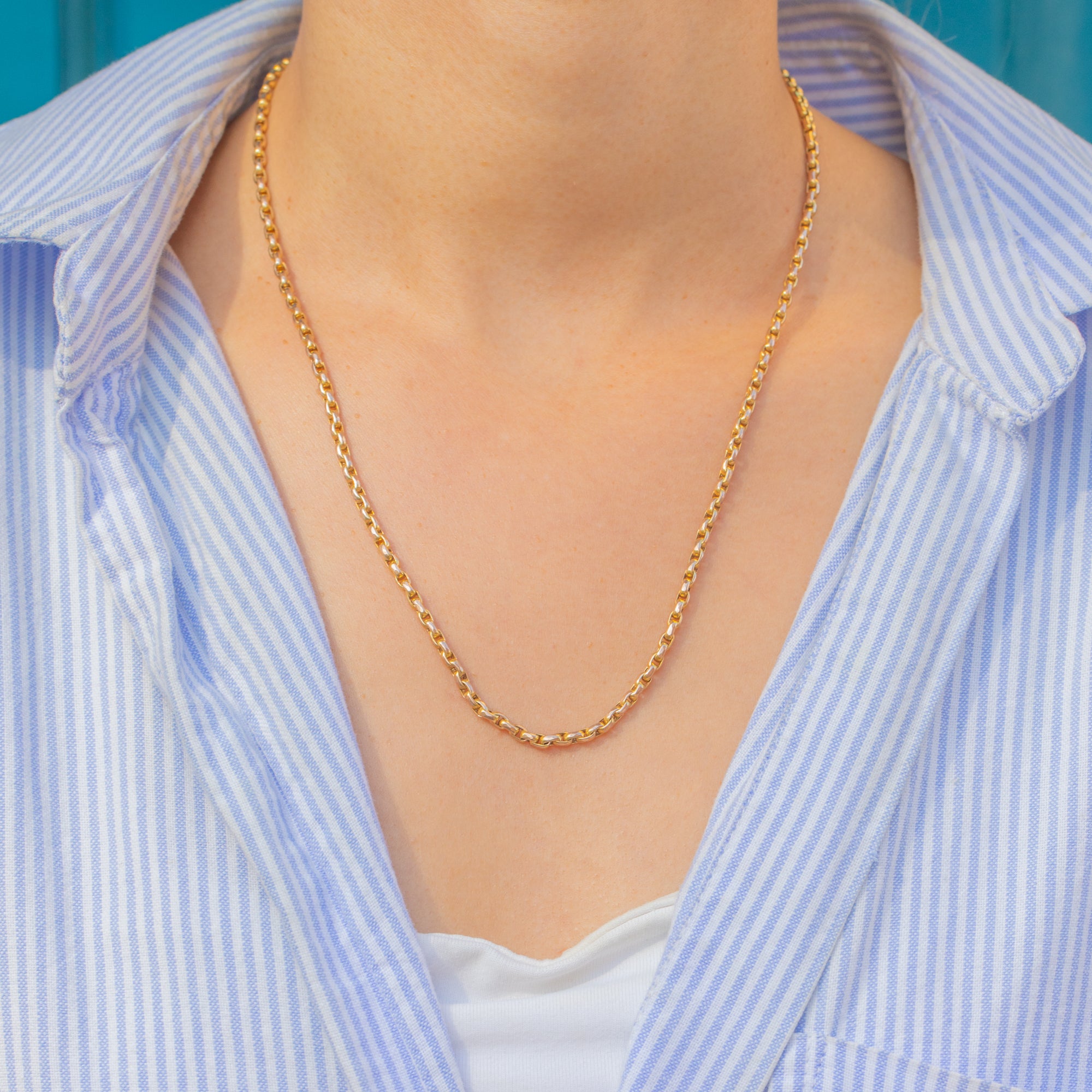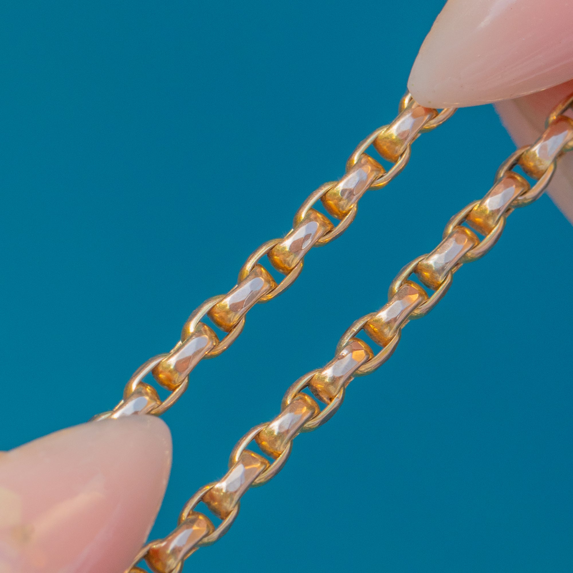 Measuring 19" in length, this antique Gold chain is the perfect everyday piece, whether worn alone, stacked with other chains and necklaces, or utilising the dog-clip to suspend a charm for a personal touch.