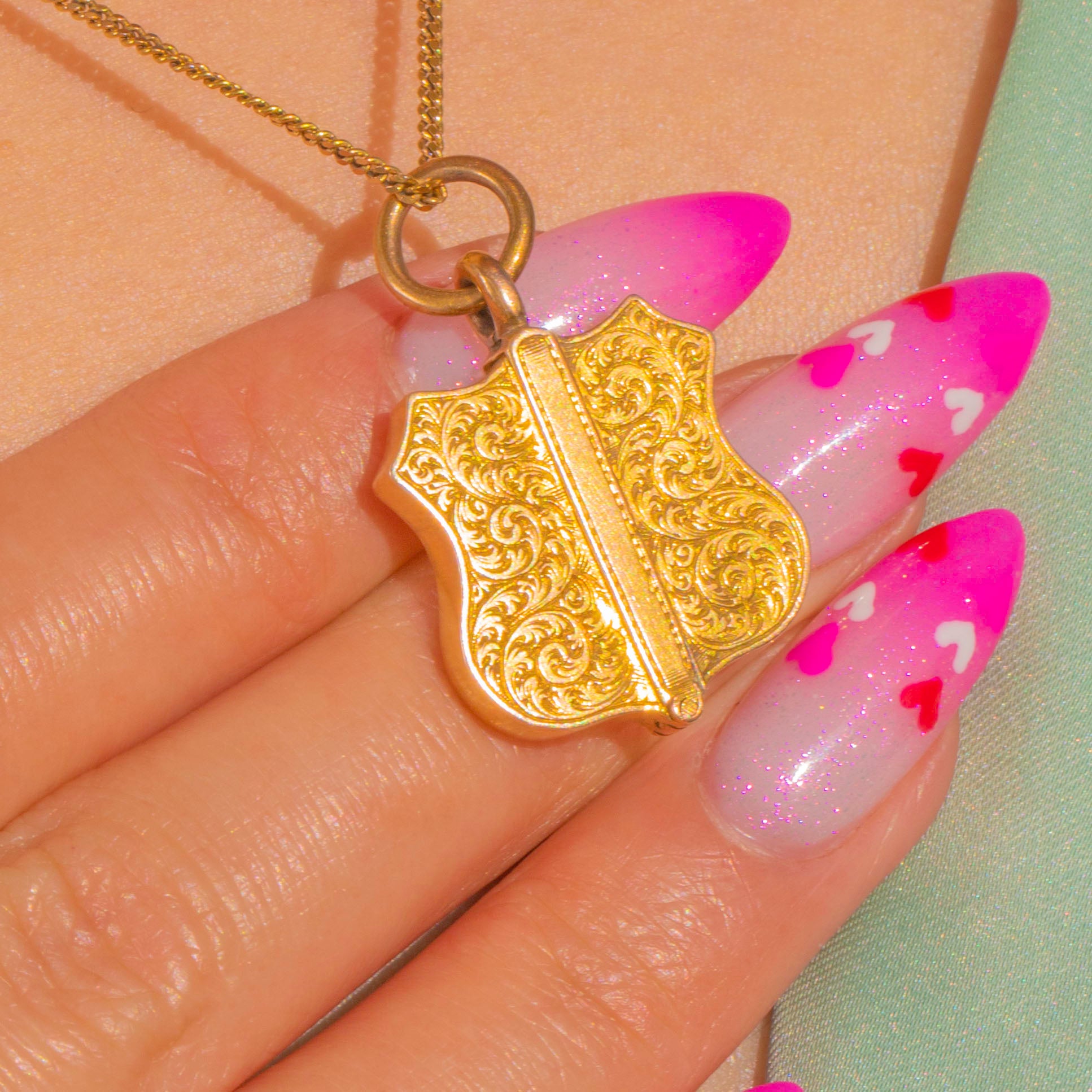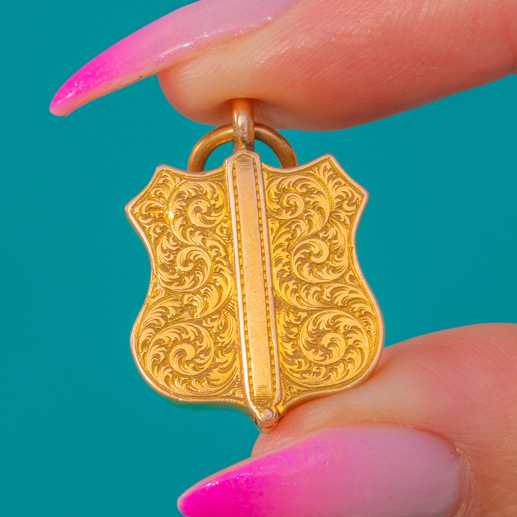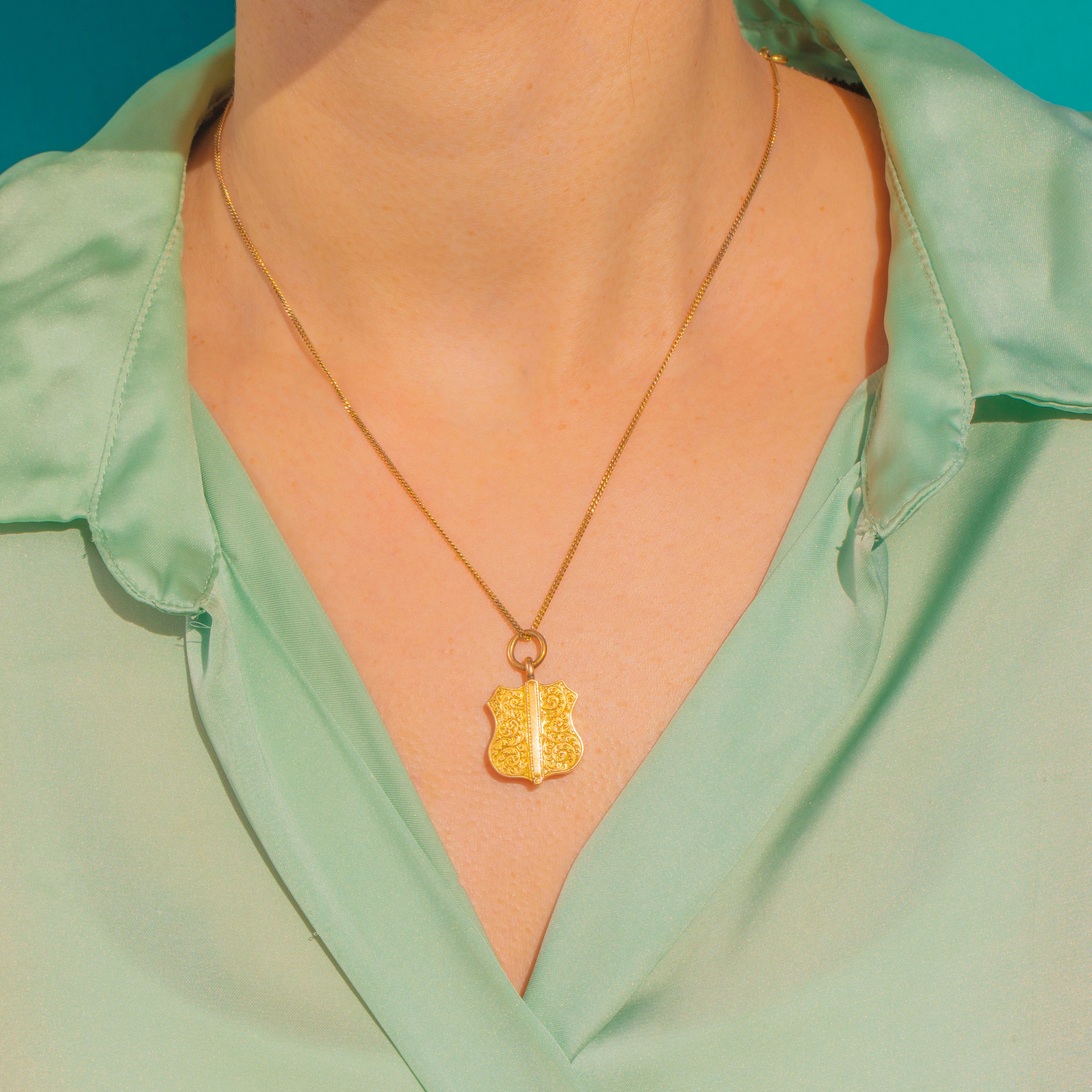 Romantic and refined, this Victorian shield locket is crafted in rich 15ct Gold and lavished with crisp, symmetrical foliate and scroll engravings. A raised central rib lends architectural poise to the warmly gleaming surface, while the petite shield silhouette captures the era’s love of cherished keepsakes and intricate ornament.