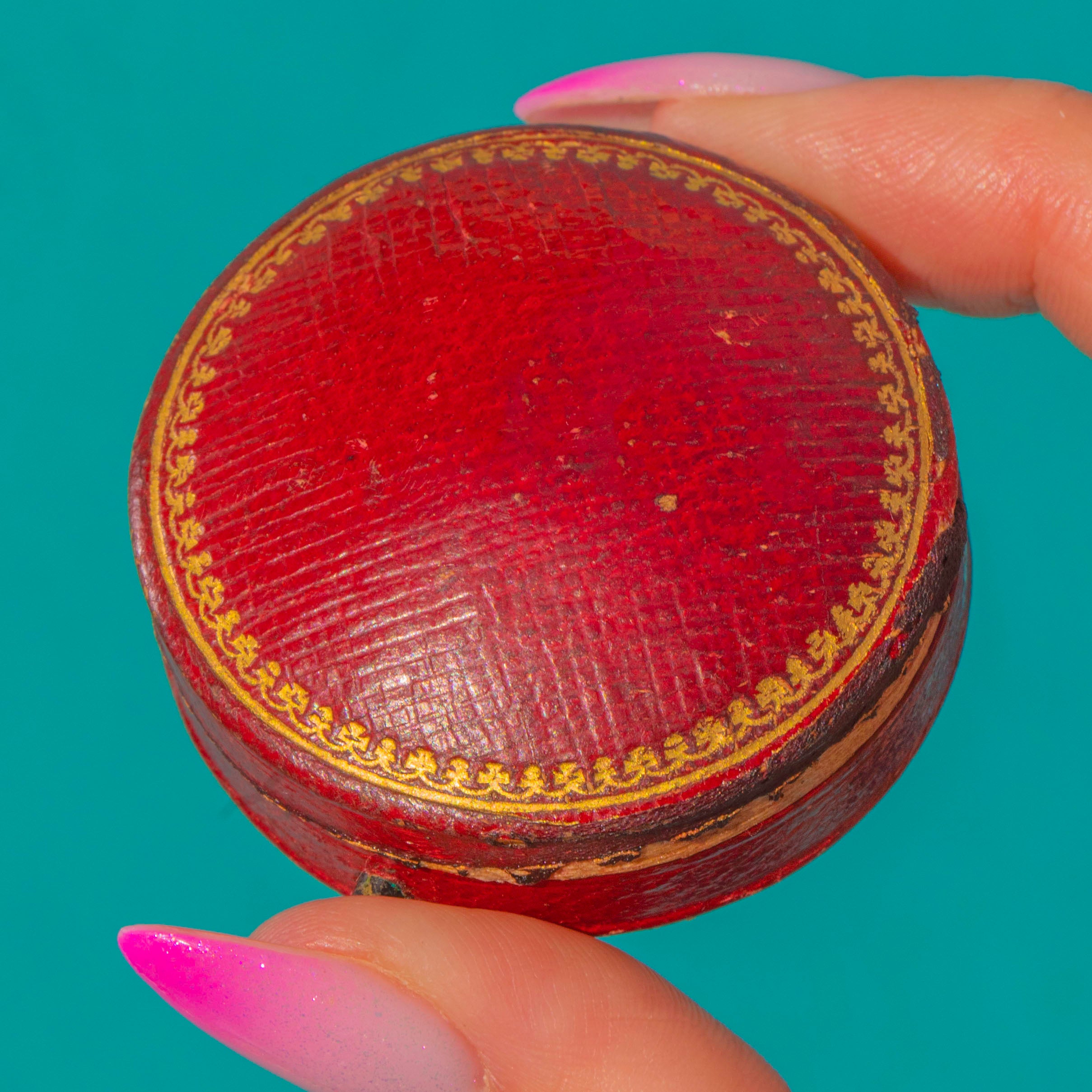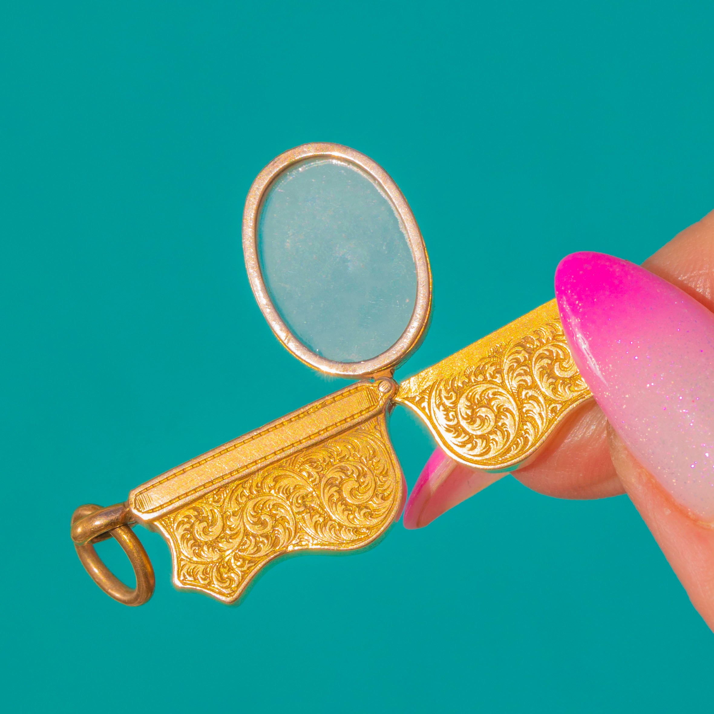 Beautifully hinged, it opens to reveal a charming concealed oval lens—a rare touch of Victorian ingenuity tucked within an ornate form. A delightful jewel of subtle drama and fine detail, it comes accompanied by an antique tooled leather presentation box for a dash of period theatre when gifting or storing.