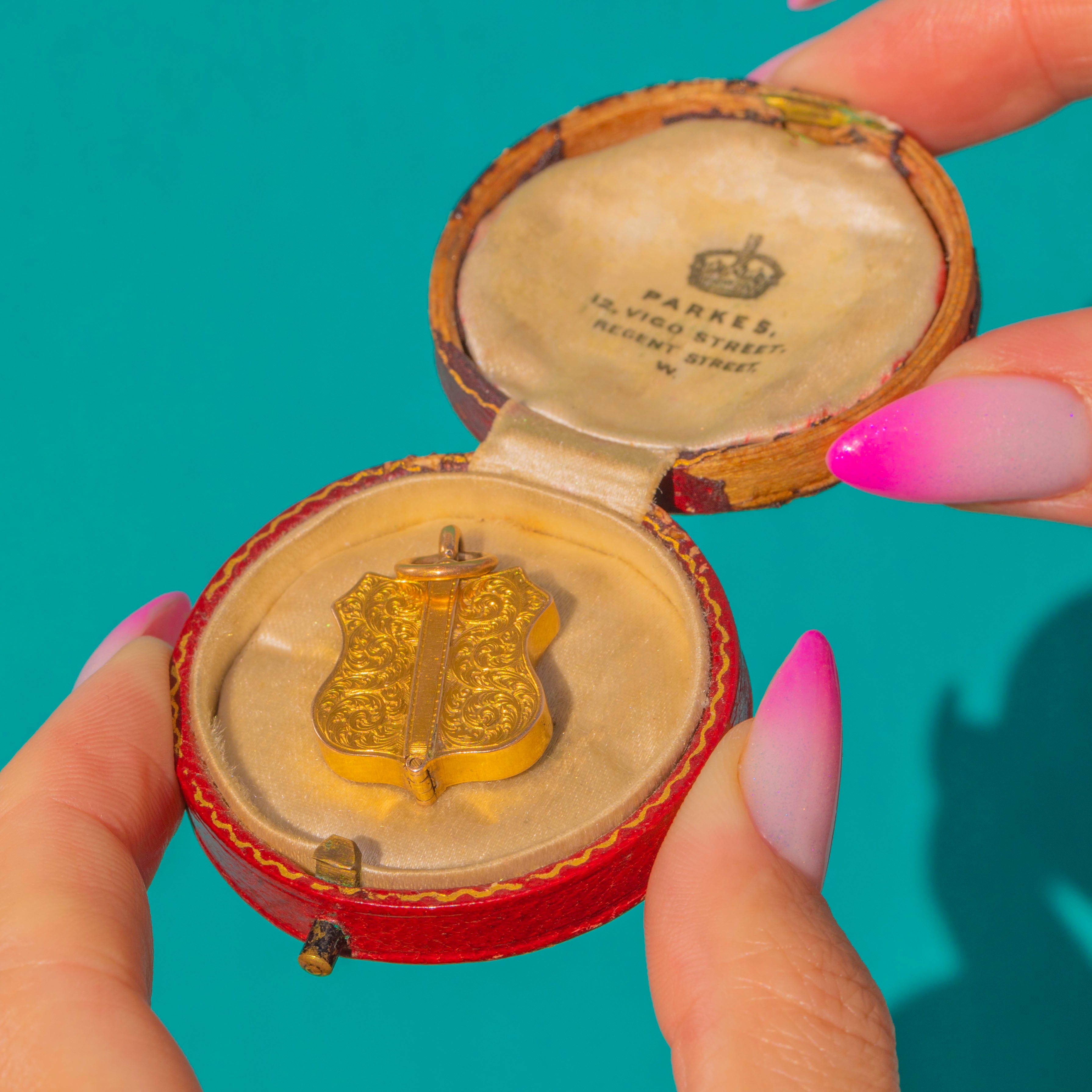RARE Victorian 15ct Gold Engraved Shield Locket BOXED- Antique Tooled Leather Box