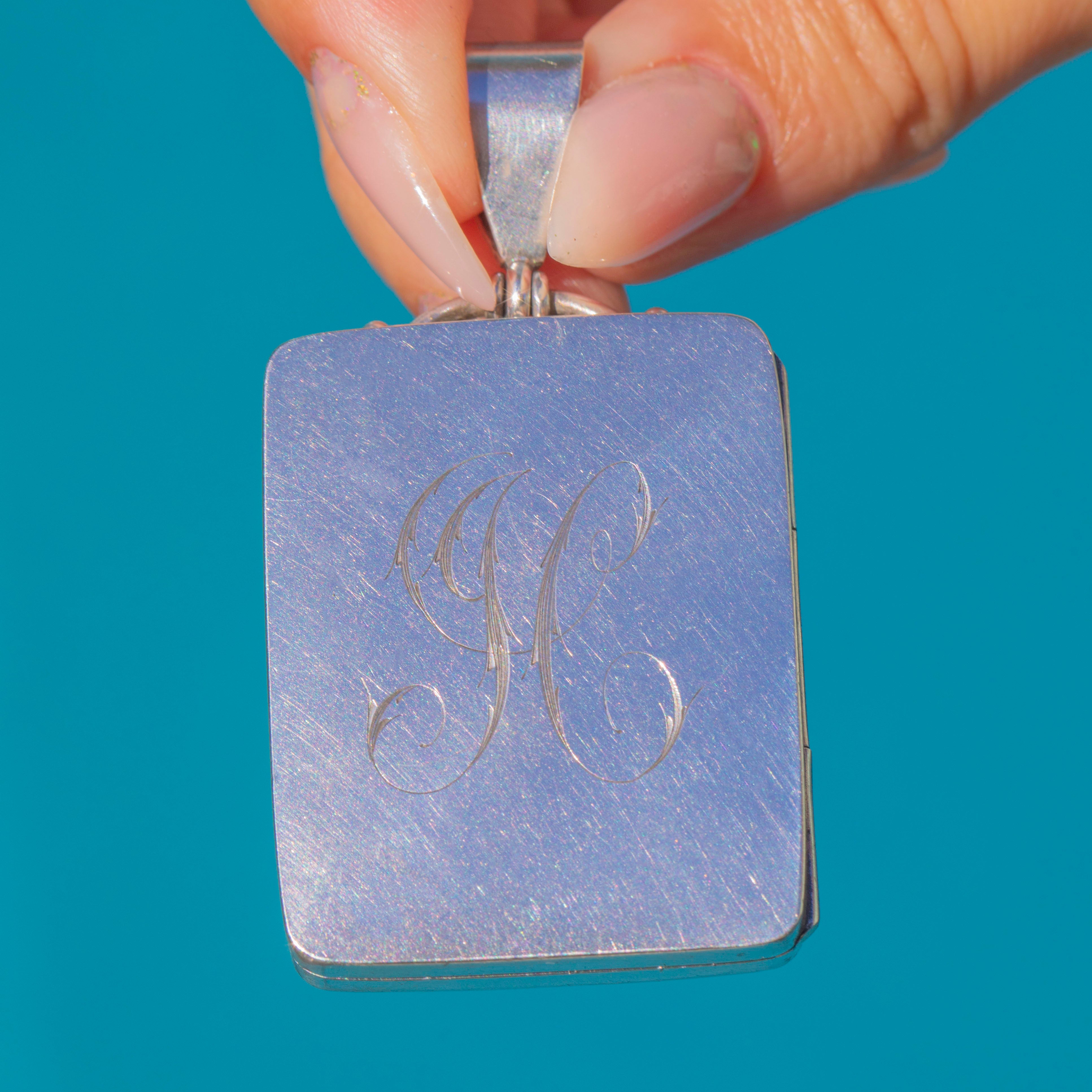 Inside are two metal frames with perspex windows, ready for cherished photographs. The reverse is engraved with the letter “H”. A registered design lozenge on the bale confirms the design registration date of 2 October 1881, placing this piece firmly in the late 19th century.
