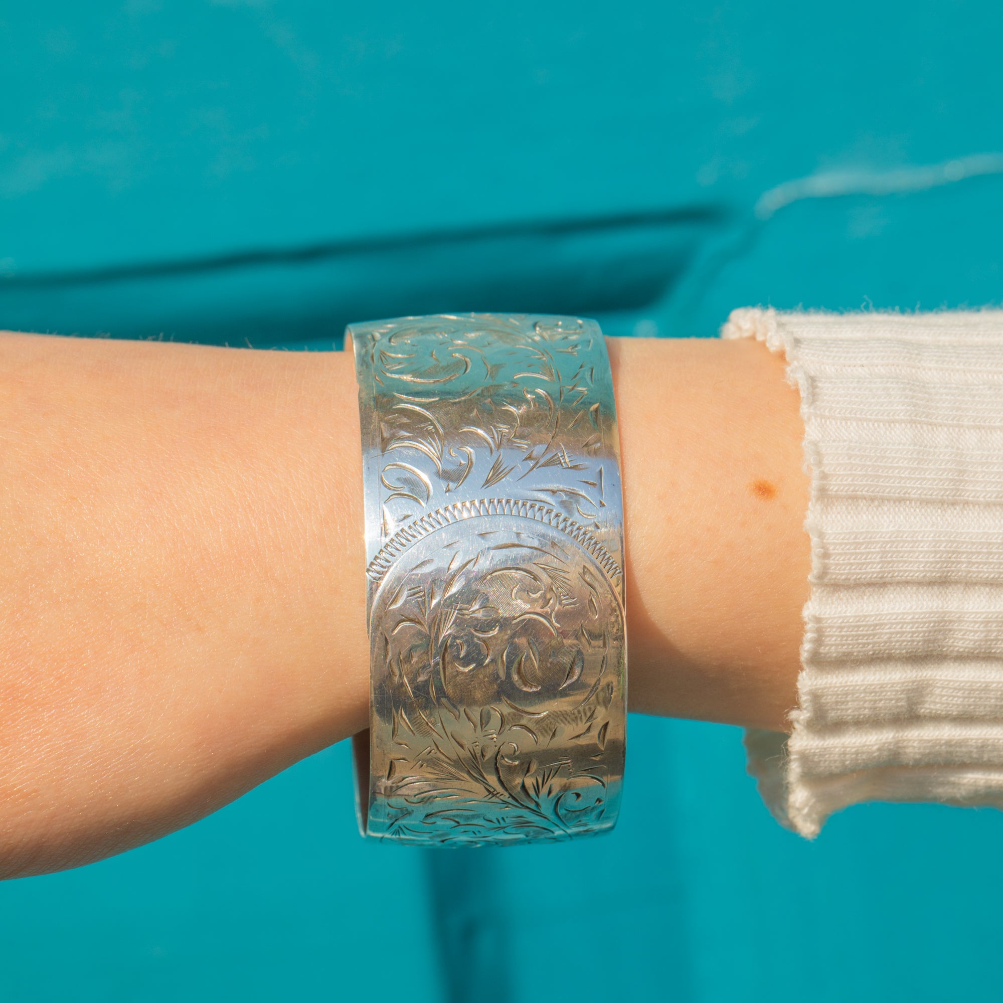 Rare Wrap-Around Chunky Silver Engraved Cuff Bangle
