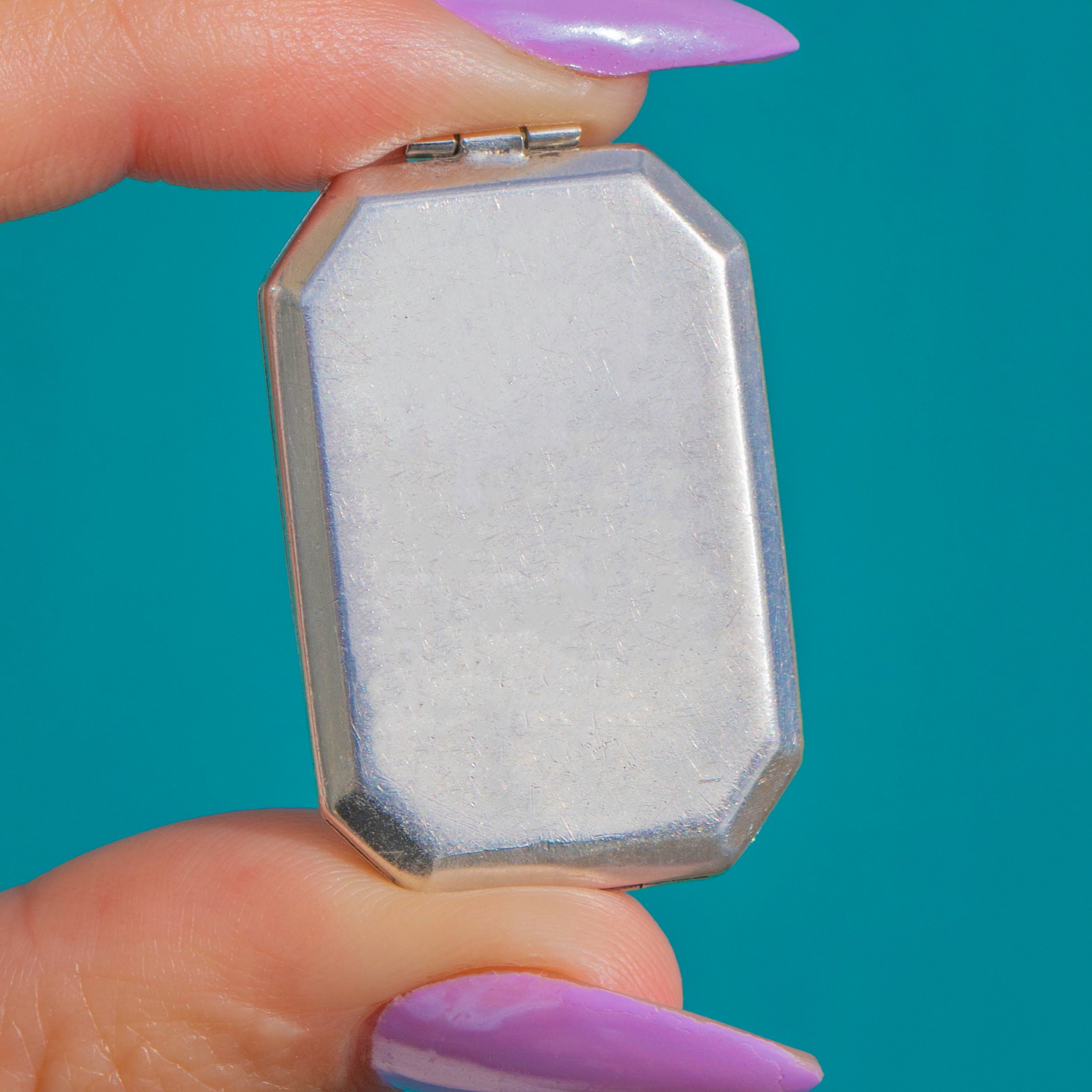 EXCELLENT: Enamel is bright and glossy with a tiny area of light abrasion near the top of the panel visible on close inspection. Silver shows only light surface scratches with a gentle, even patina; the hinge is secure and the locket closes well.