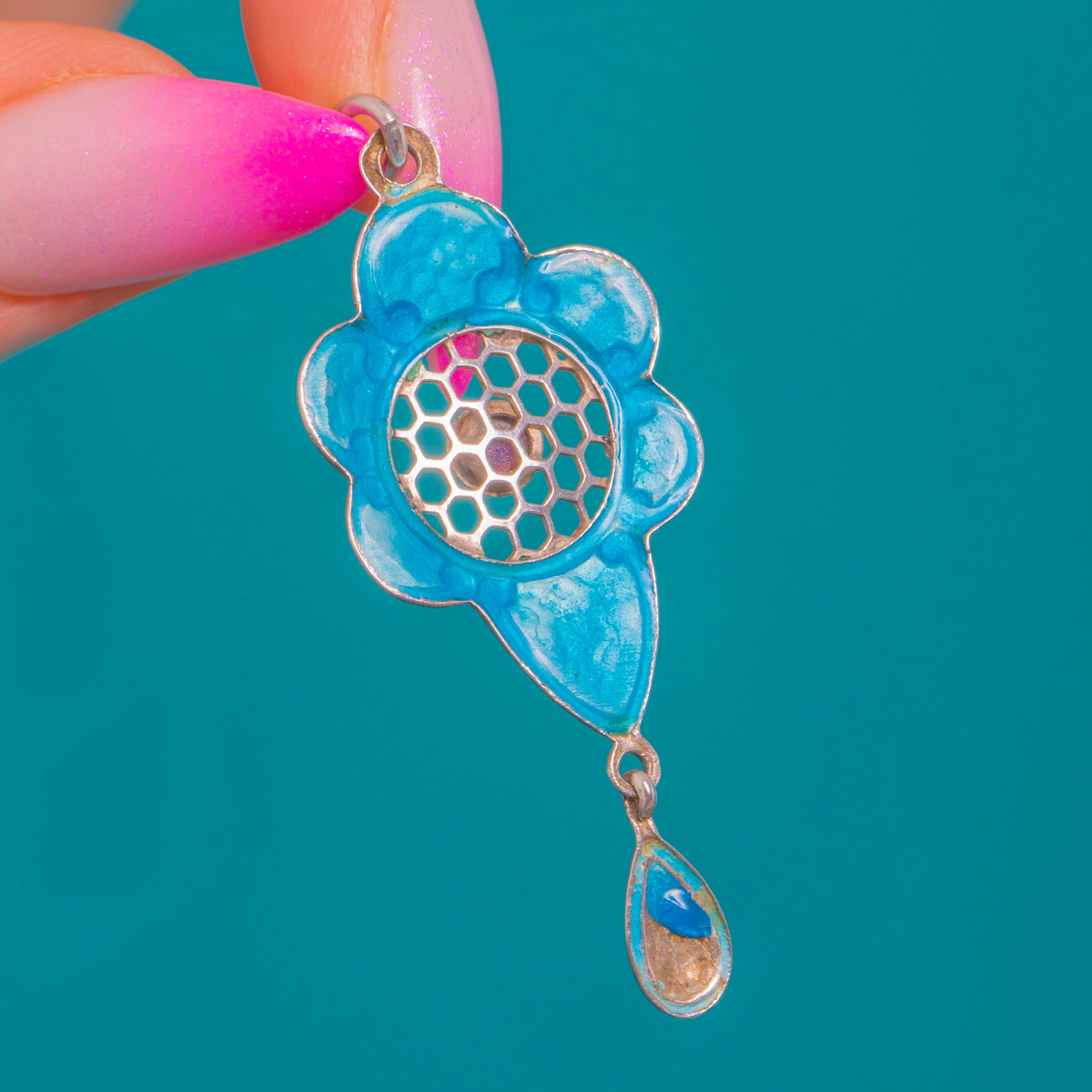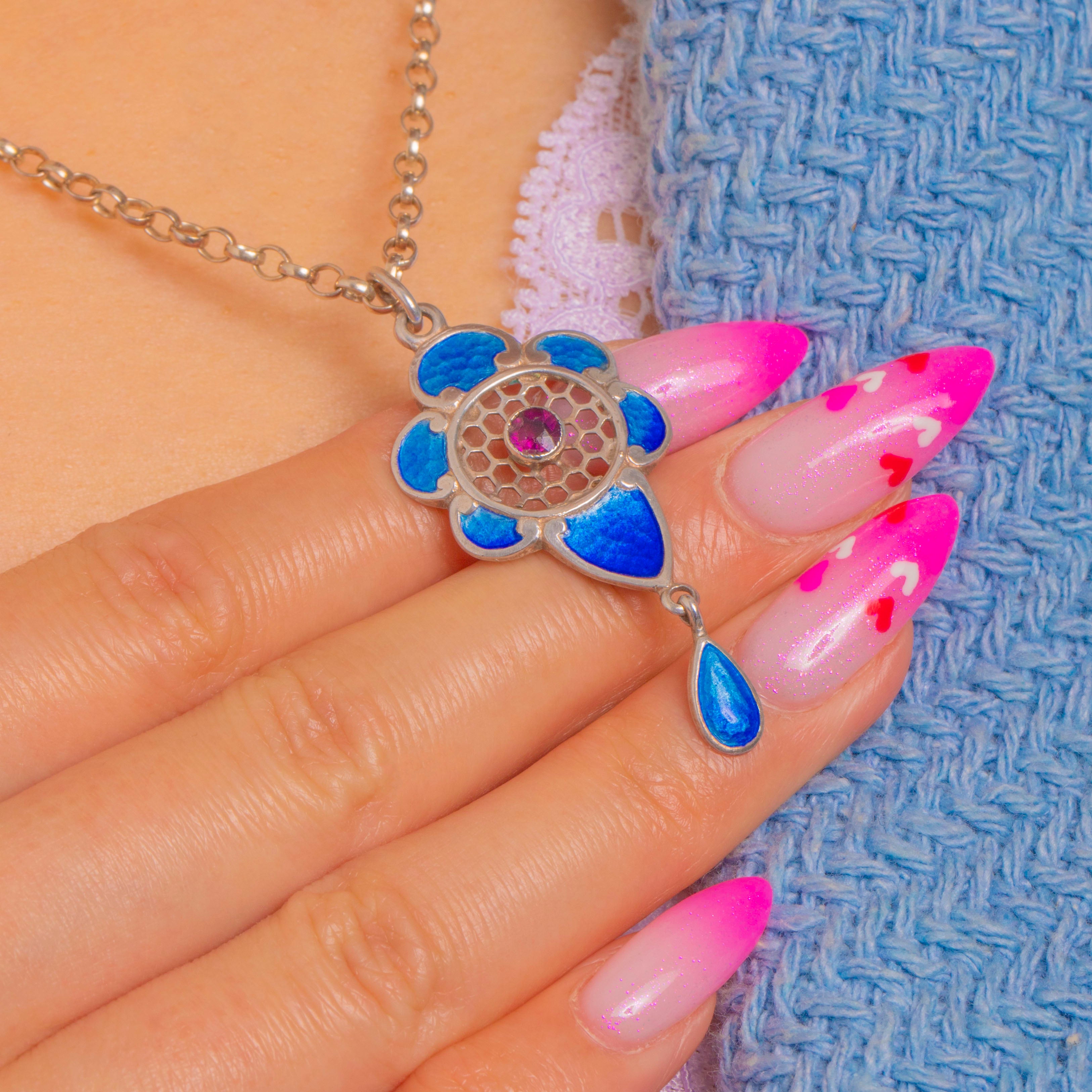 This charming Arts & Crafts pendant captures the movement and romance of the era in Sterling Silver and hand-painted blue Enamel. A stylised floral rosette frames a “honeycomb” openwork centre, graduating from deep cobalt to lighter sky tones across the petals and articulated teardrop for a vivid play of colour.