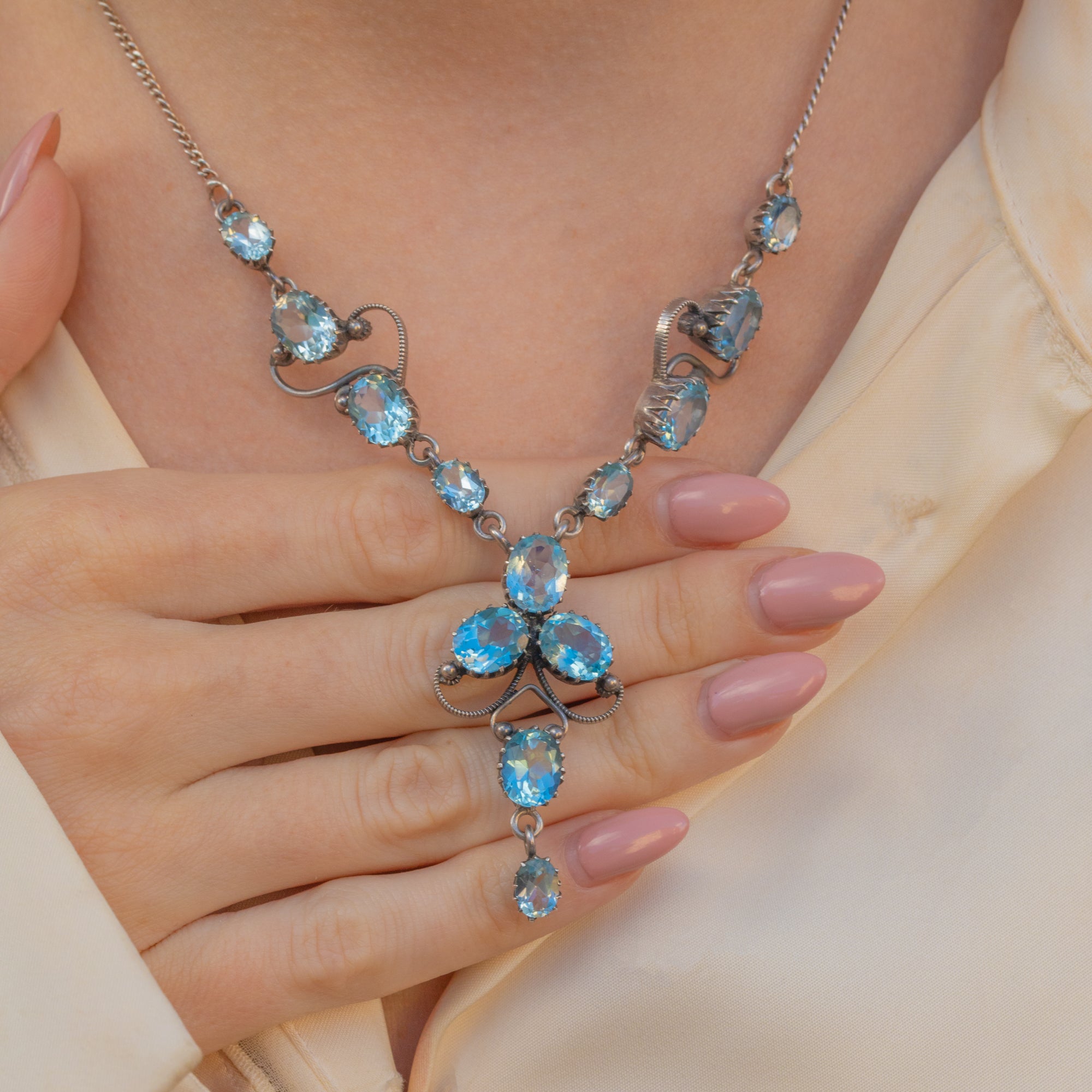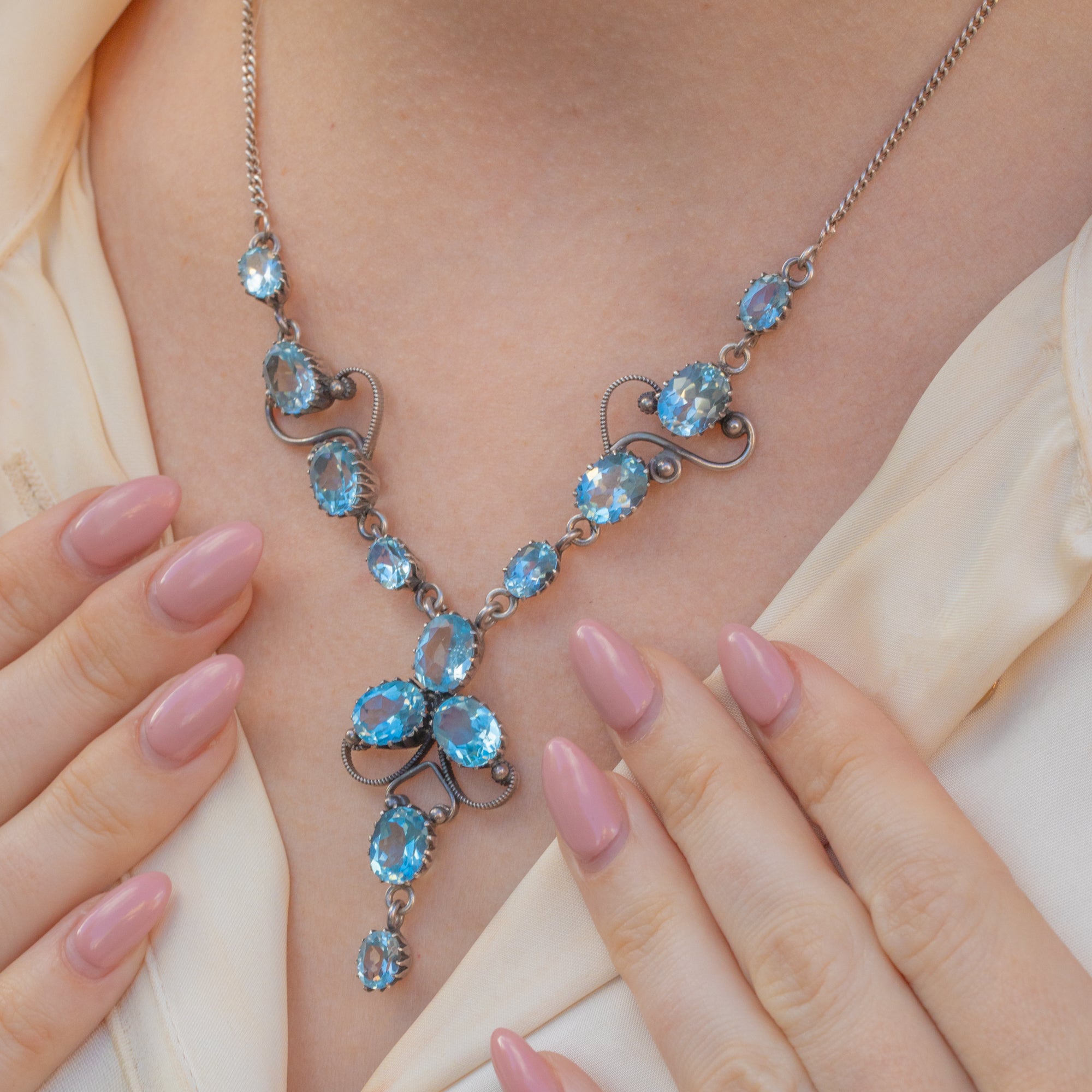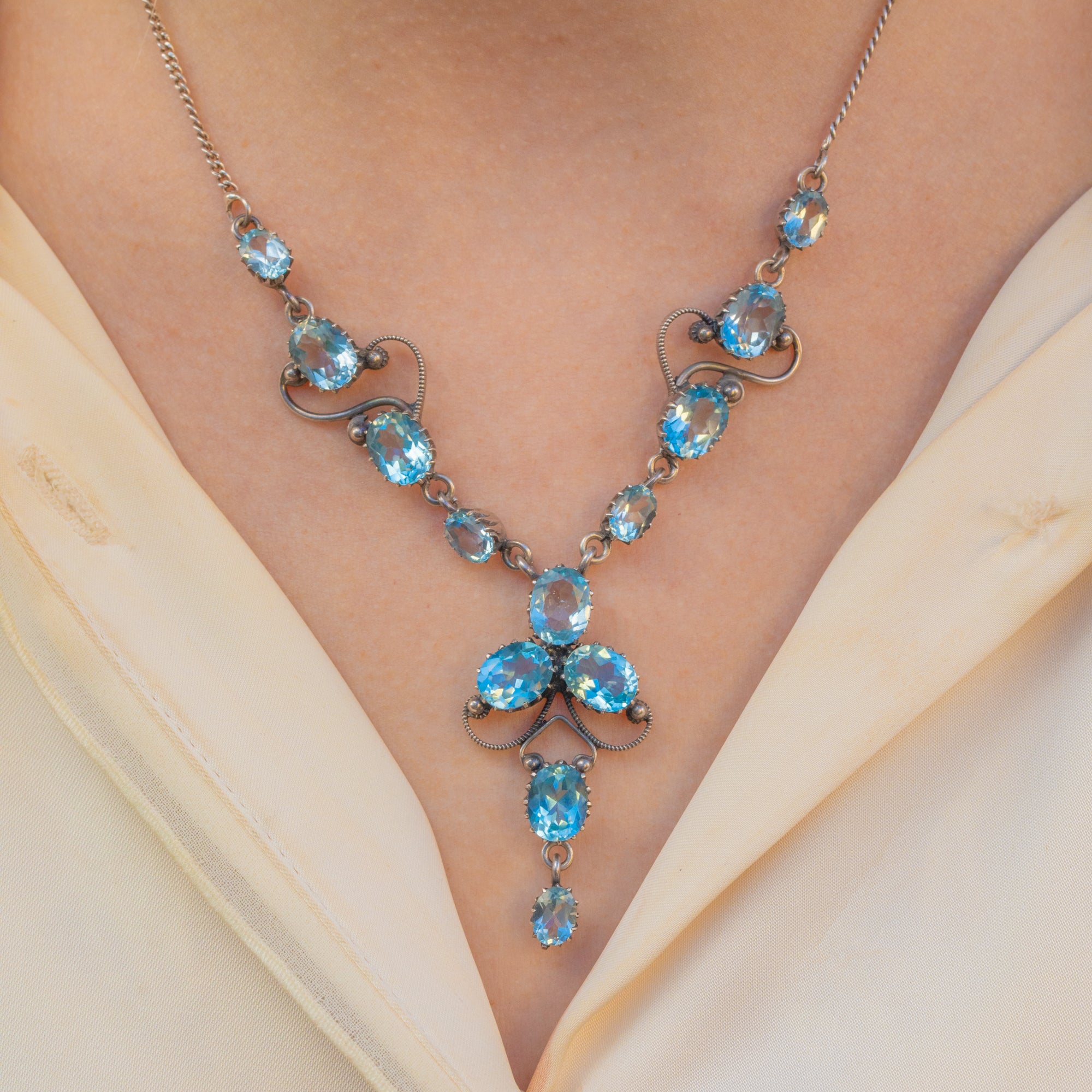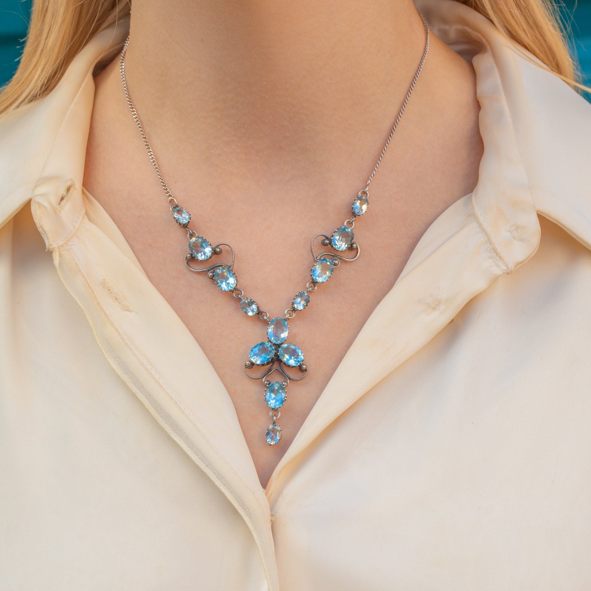 Add timeless elegance to your collection with this stunning Silver Edwardian blue Topaz drop necklace! Boasting thirteen radiant blue Topaz gemstones, this antique necklace is the perfect sophisticated occasion piece.