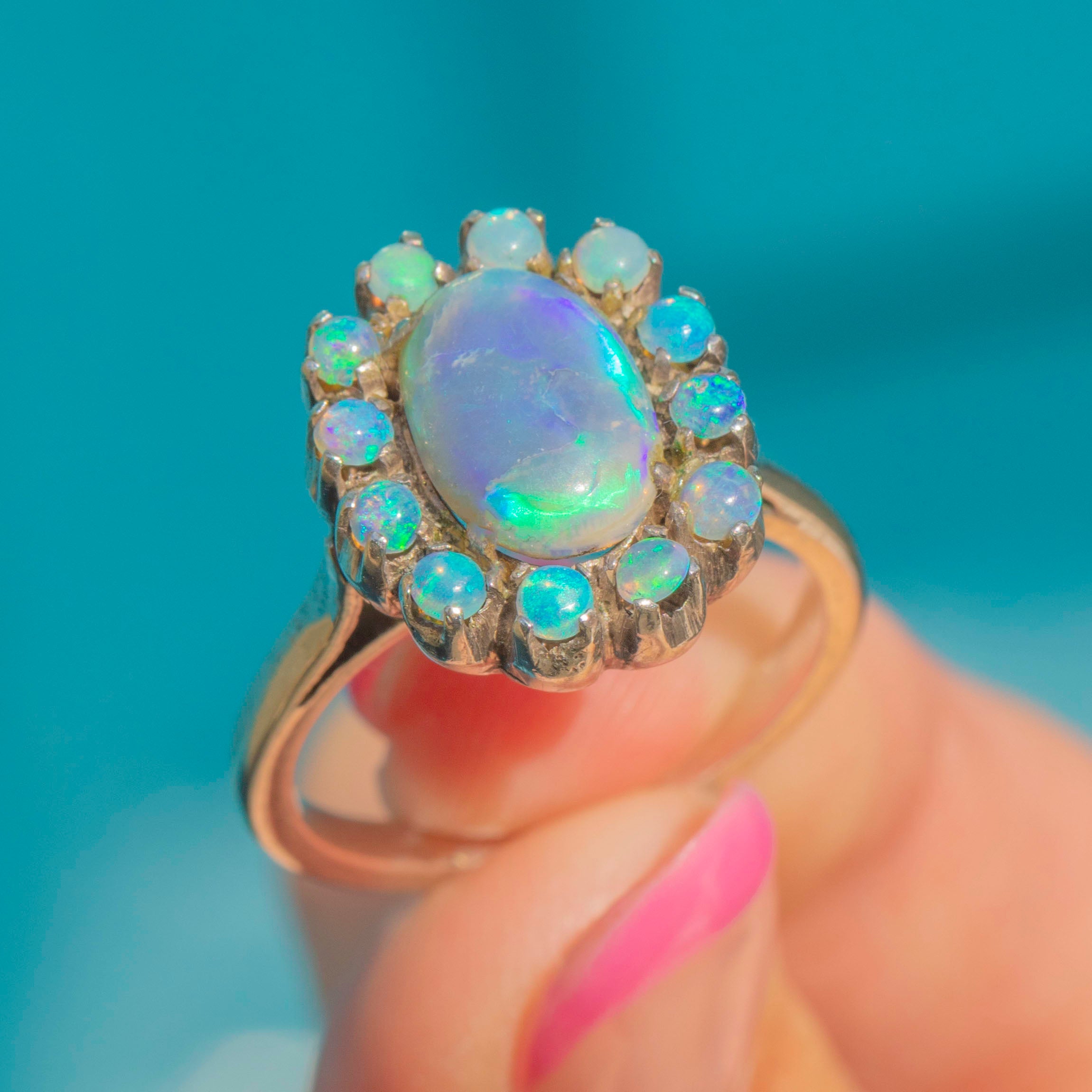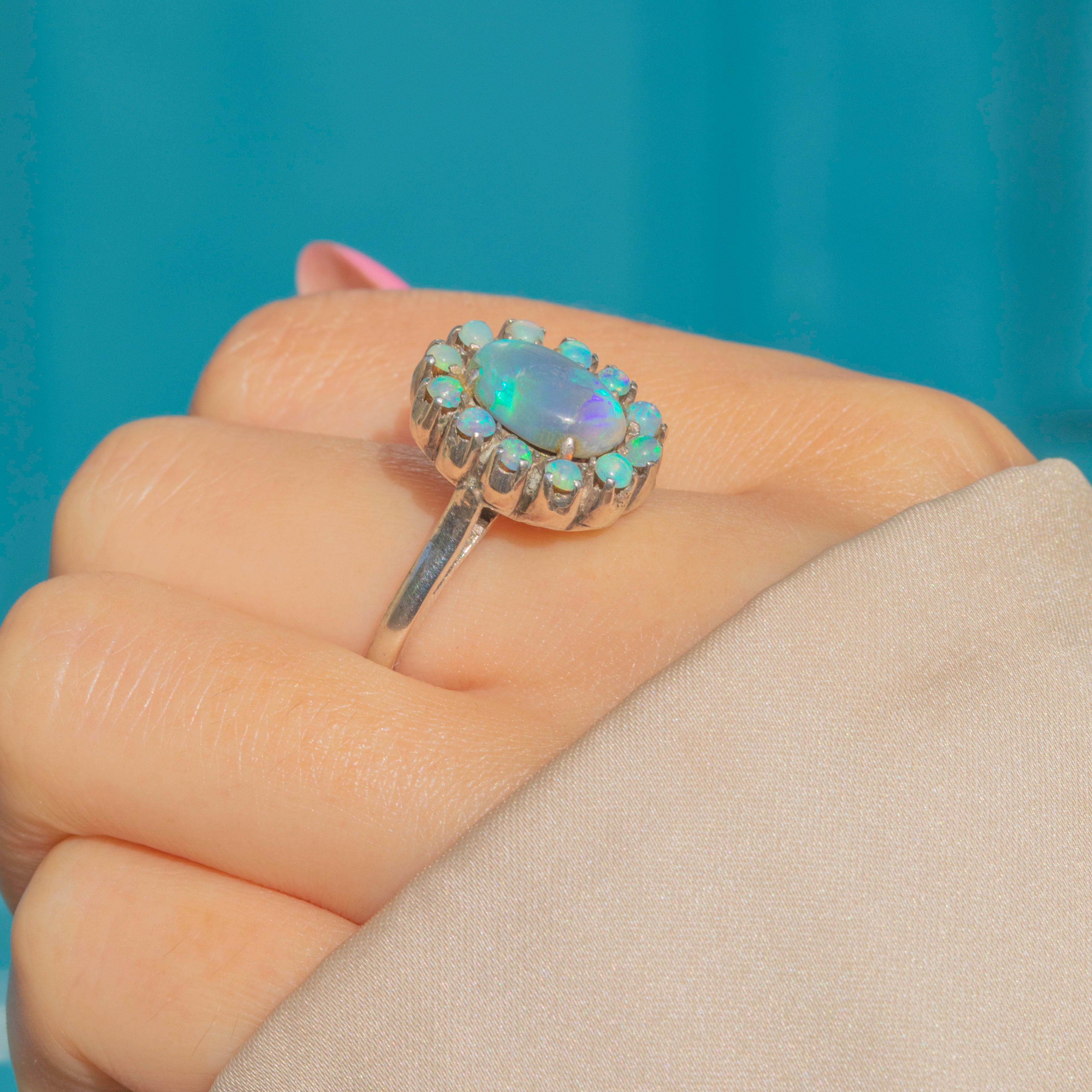This unique Black Opal flower cluster ring presents an array of vibrant solid Opal cabochons, each one bursting with electric green and flashes of orange across their sky blue cores.