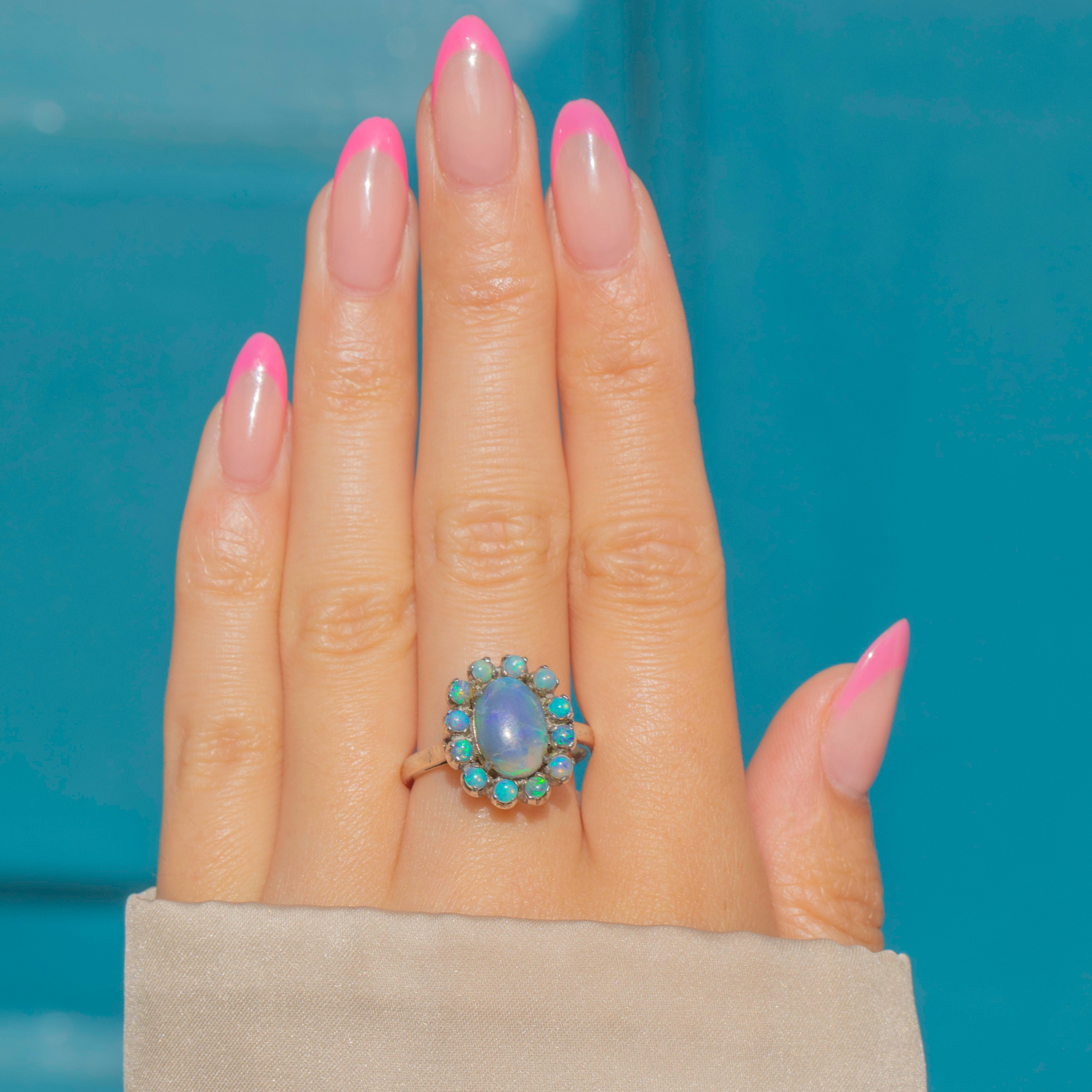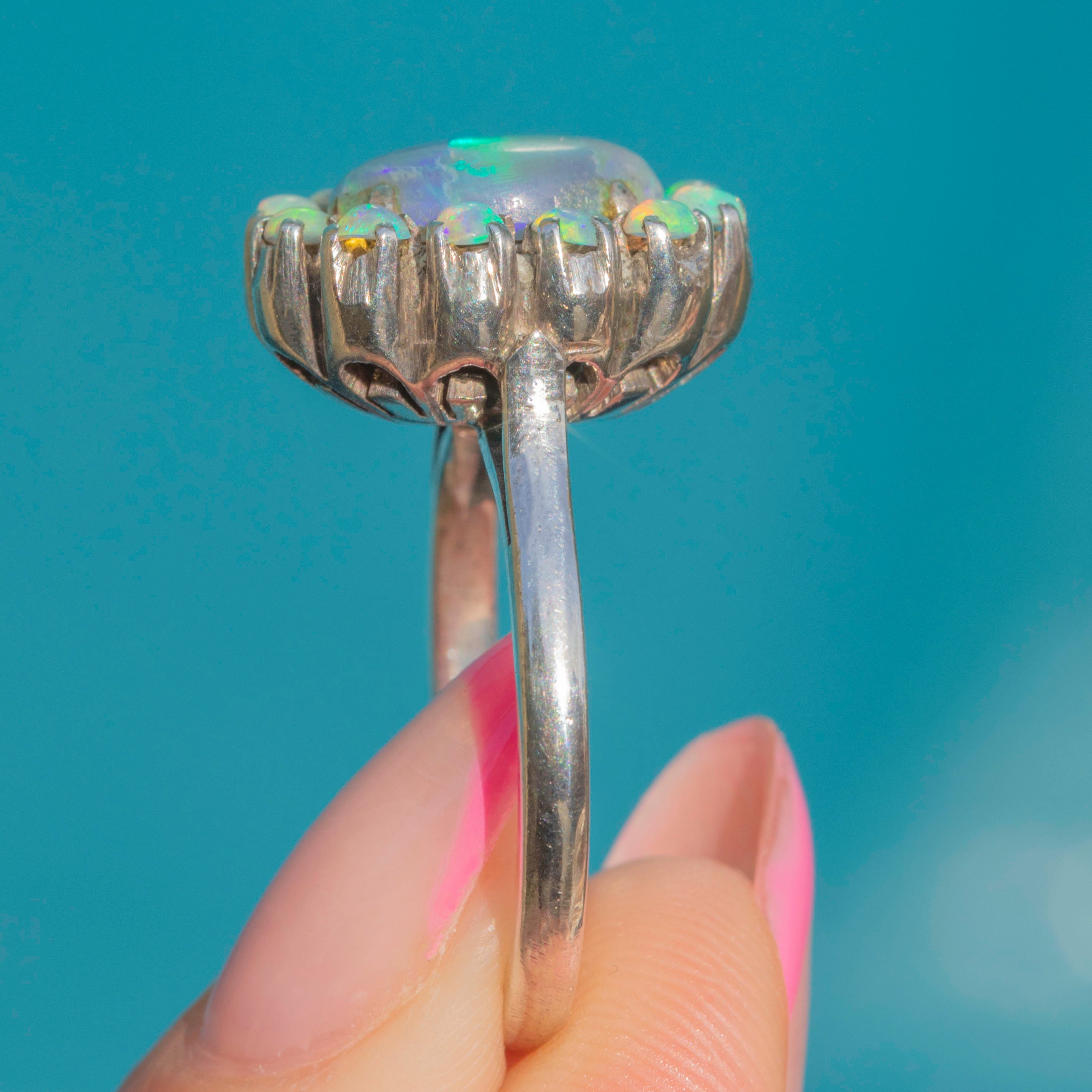 Arranged into a striking flower cluster, the Opals are displayed within a deep and ornately formed gallery, allowing you to appreciate the exquisite craftsmanship from every angle. This mid-century Opal ring provides exceptional finger coverage and has great presence on the hand!