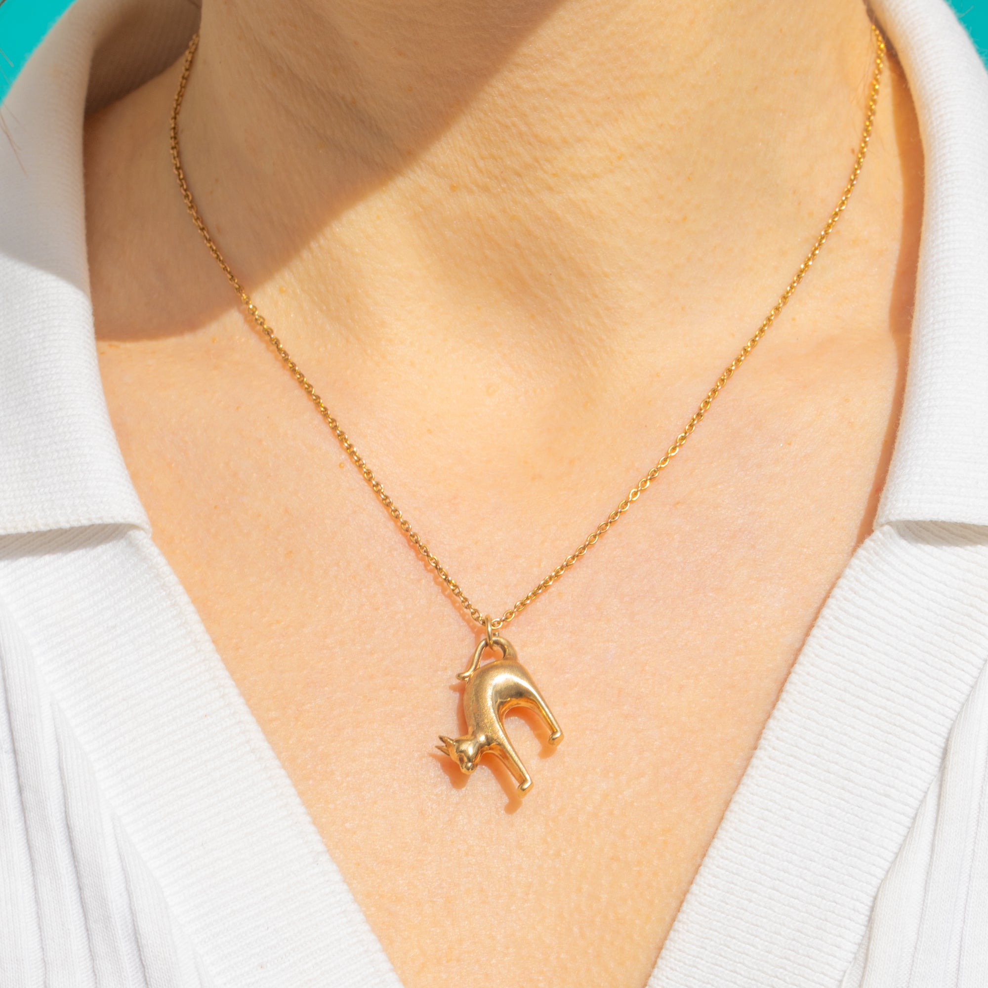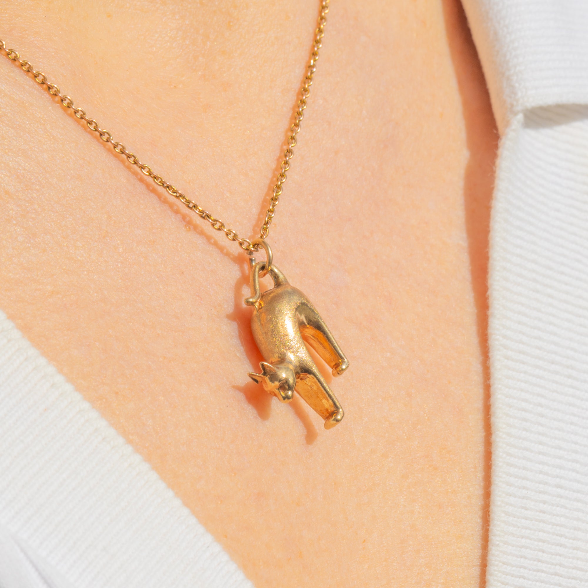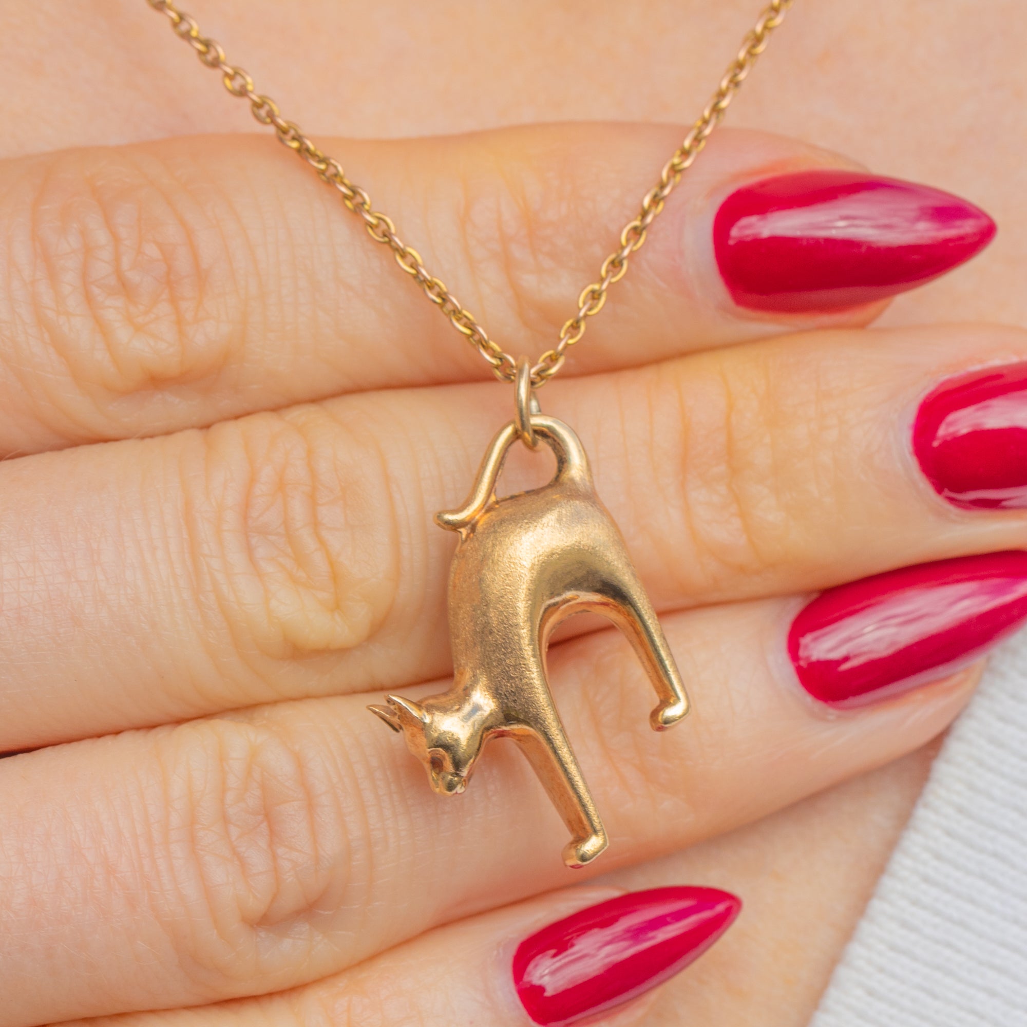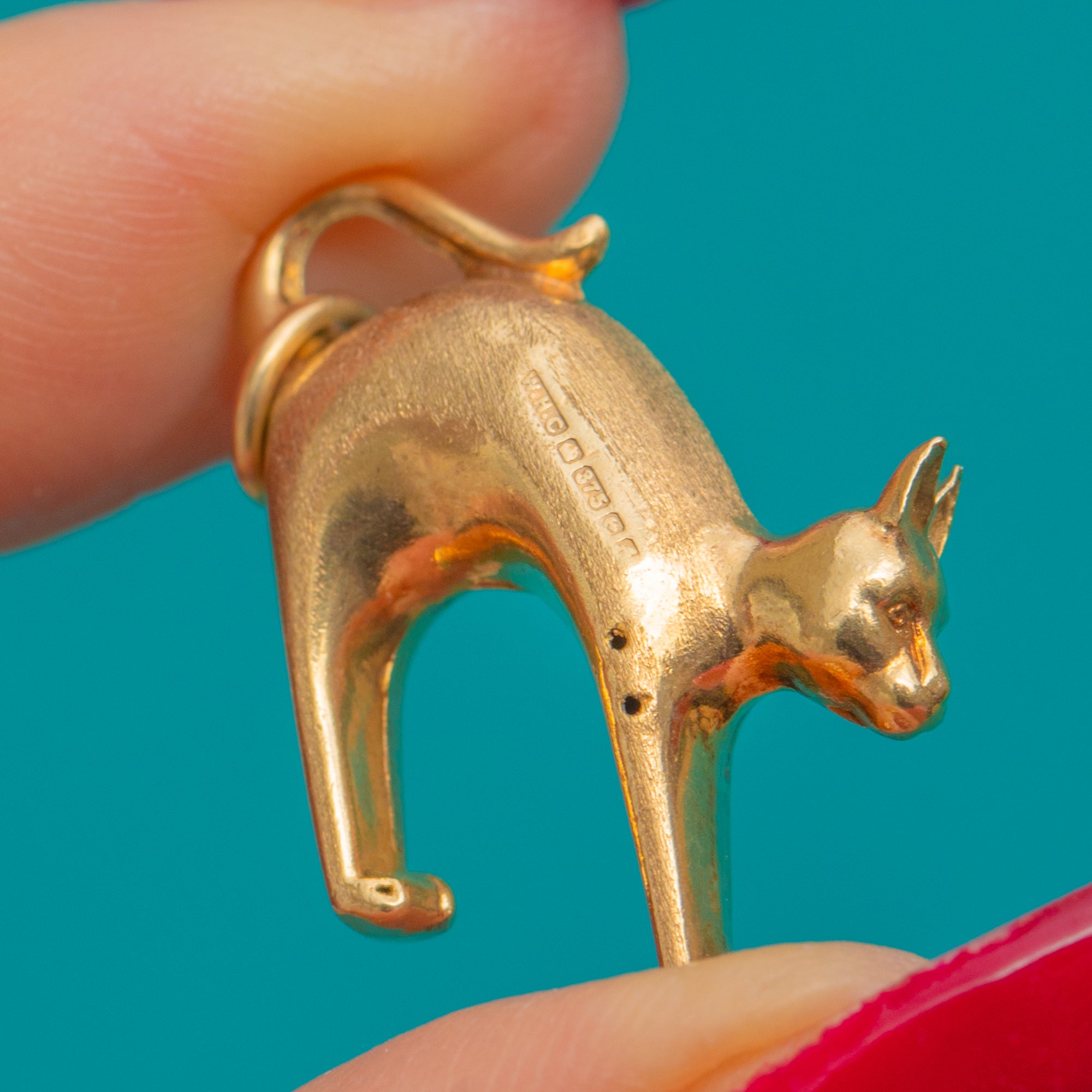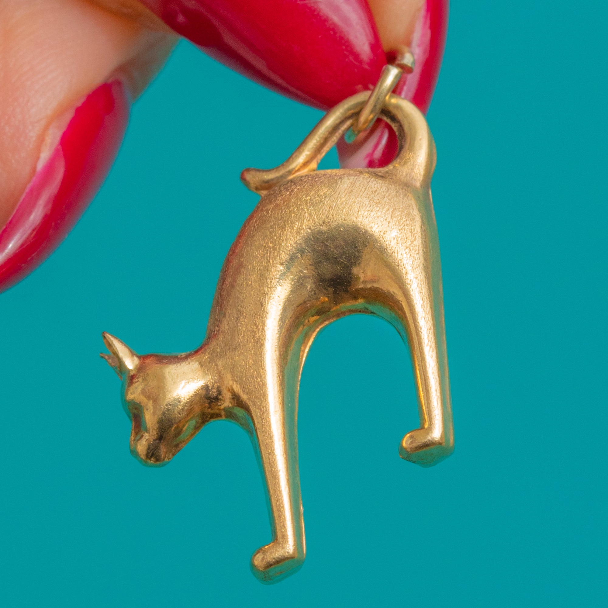 A playful, sculptural cat pendant in 9ct Gold, this Vintage treasure captures a sleek, minimalist silhouette in three dimensions. The arched feline form is smooth and tactile, with an integrated tail loop that flows seamlessly into a petite jump ring for easy wear. Its softly polished surfaces and gentle patina give it that perfect lived-in glow.