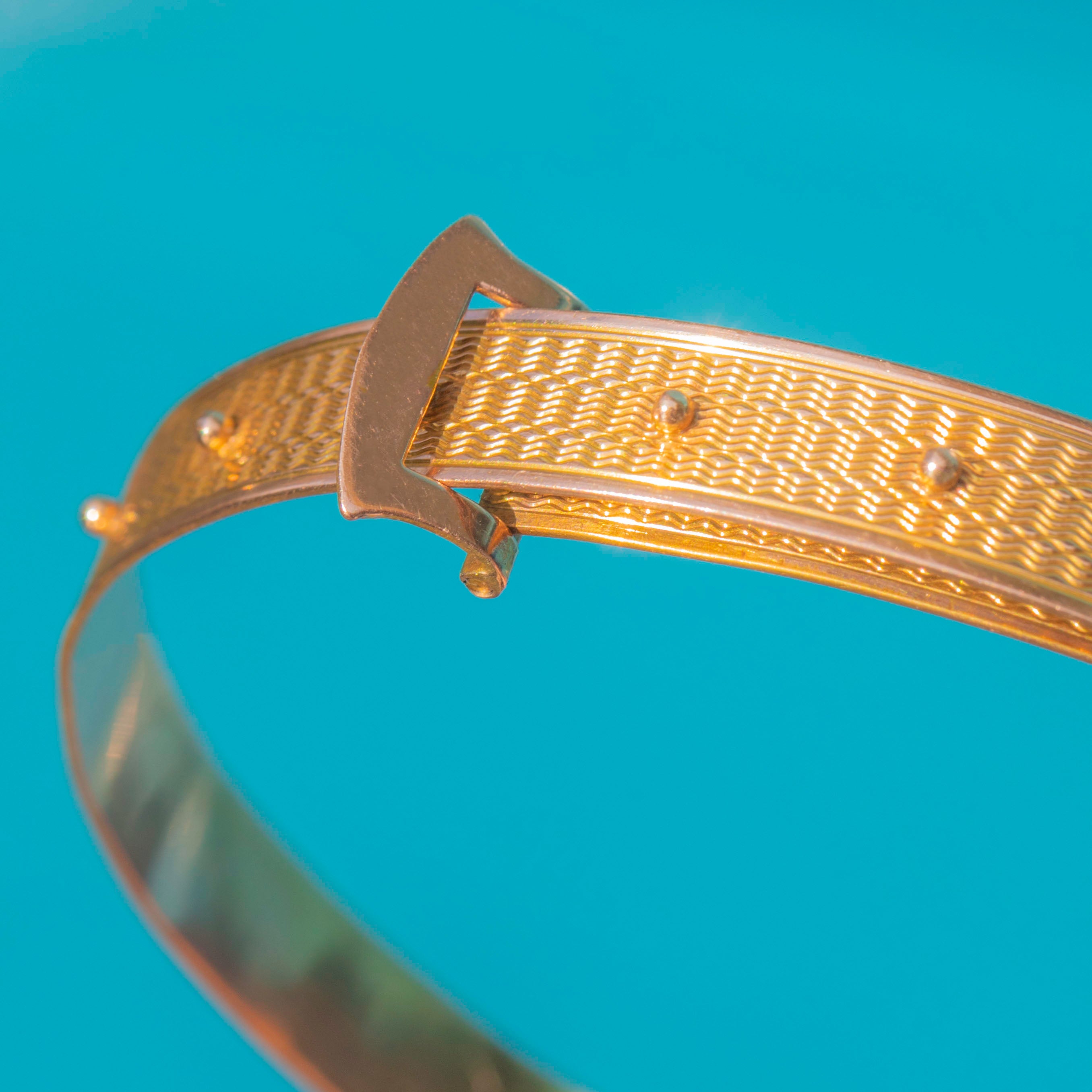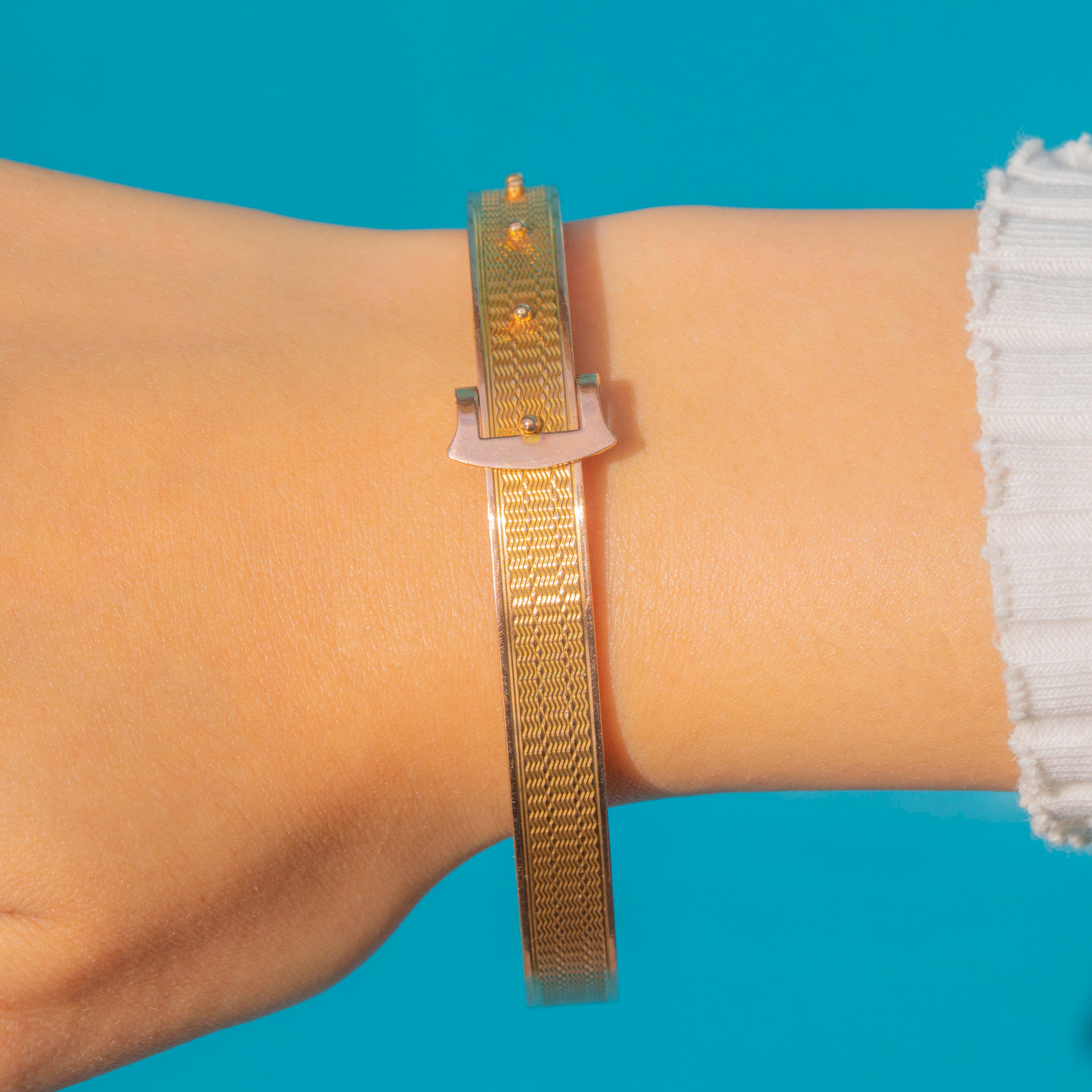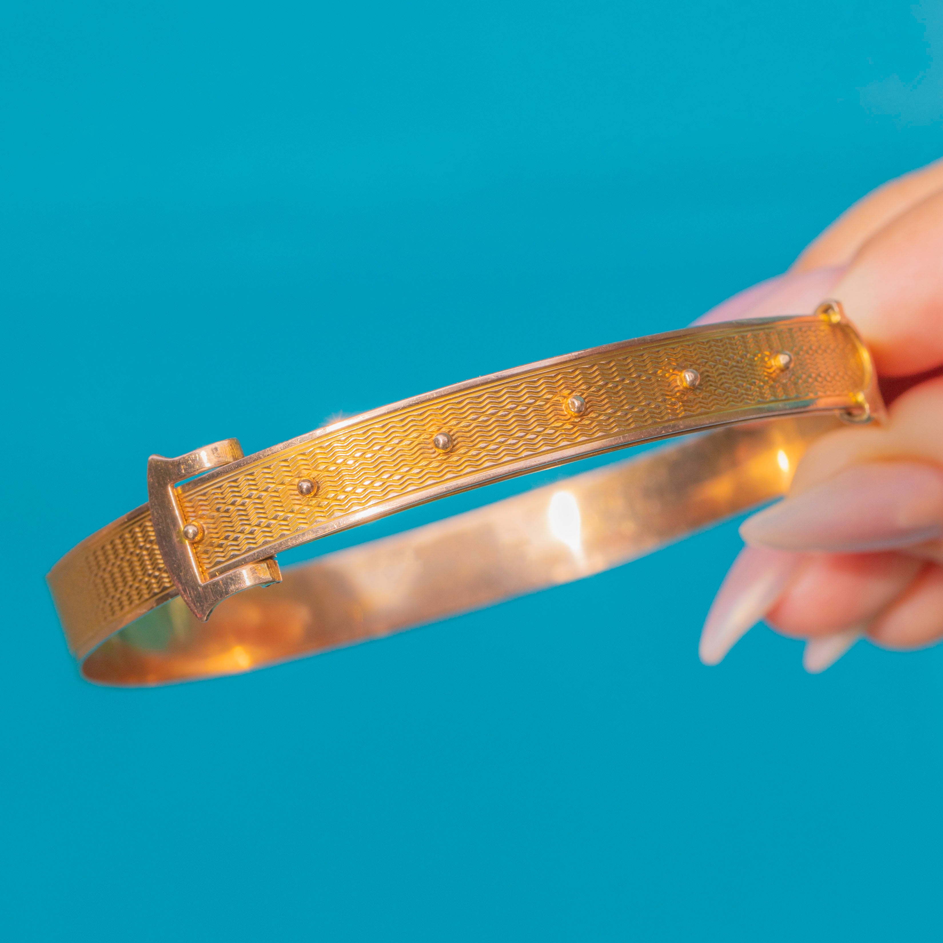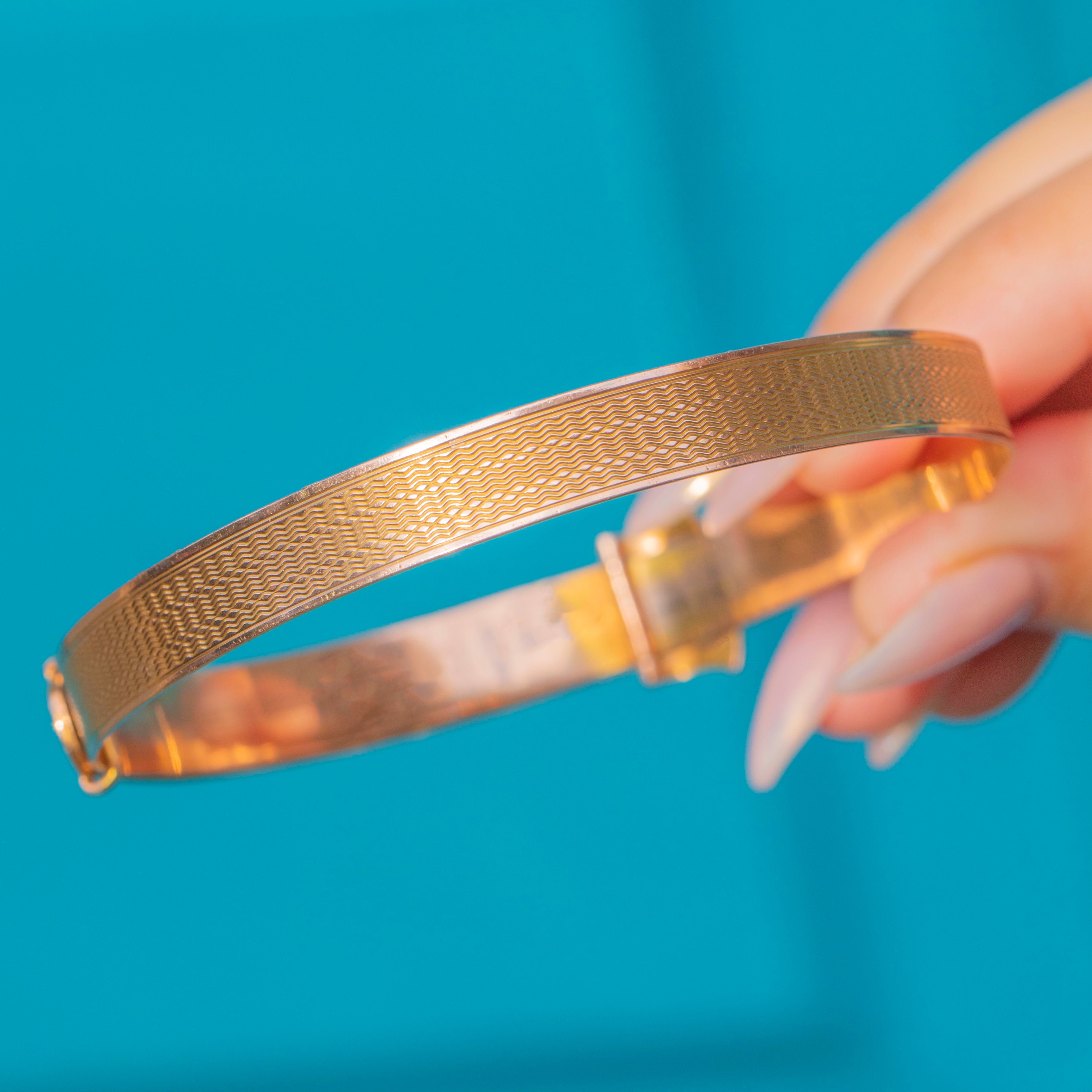 This striking Art Deco buckle bangle, hallmarked 1919, is crafted in solid 9ct Gold and beautifully engraved with a engine-turned pattern across its surface and the size is ingeniously adjustable!
