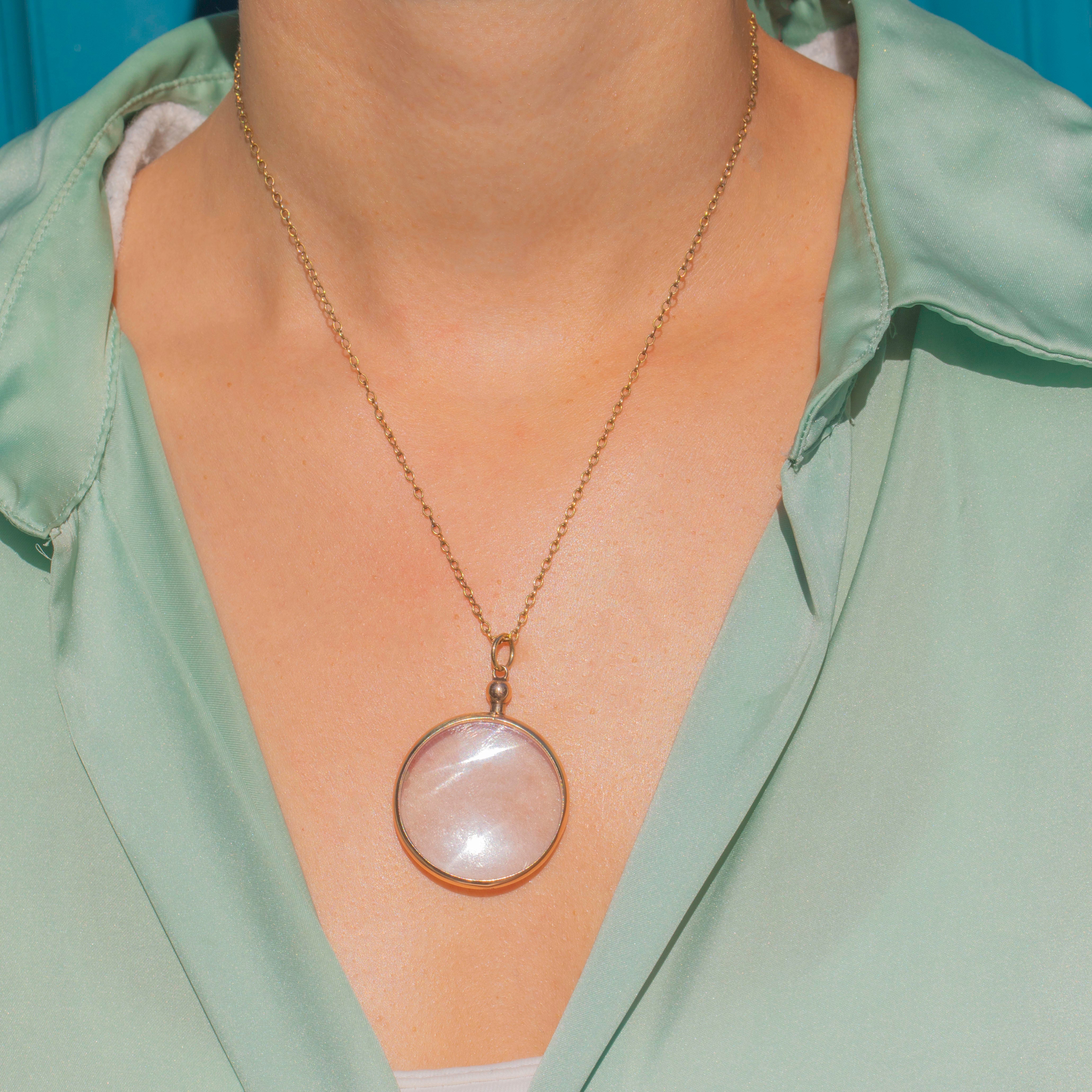 A striking Vintage round locket in 9ct Gold, fitted with clear Perspex panels. This oversized piece is designed to hold and display photographs, pressed flowers or tiny keepsakes, with a simple yet bold Gold bezel that keeps the focus on what’s inside.