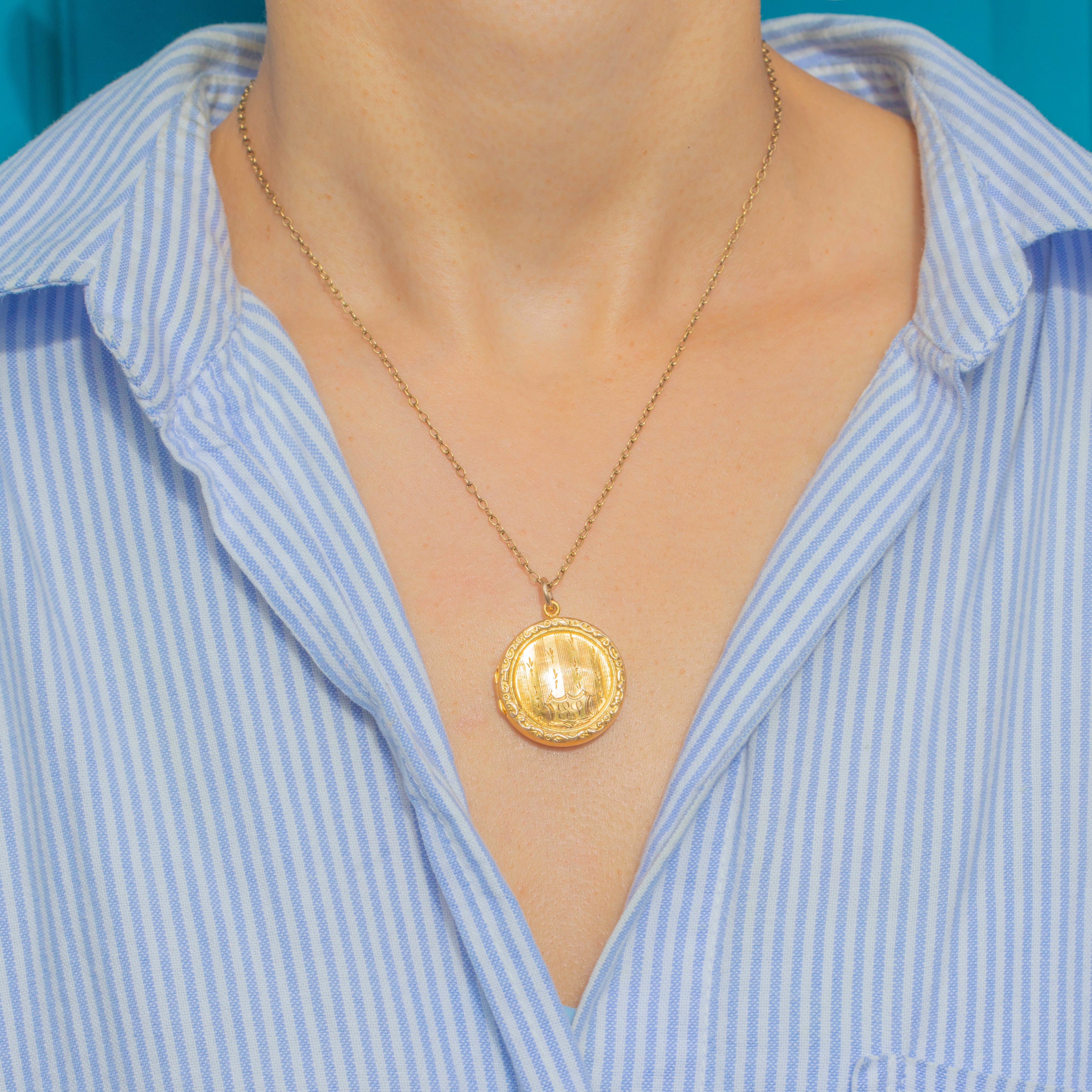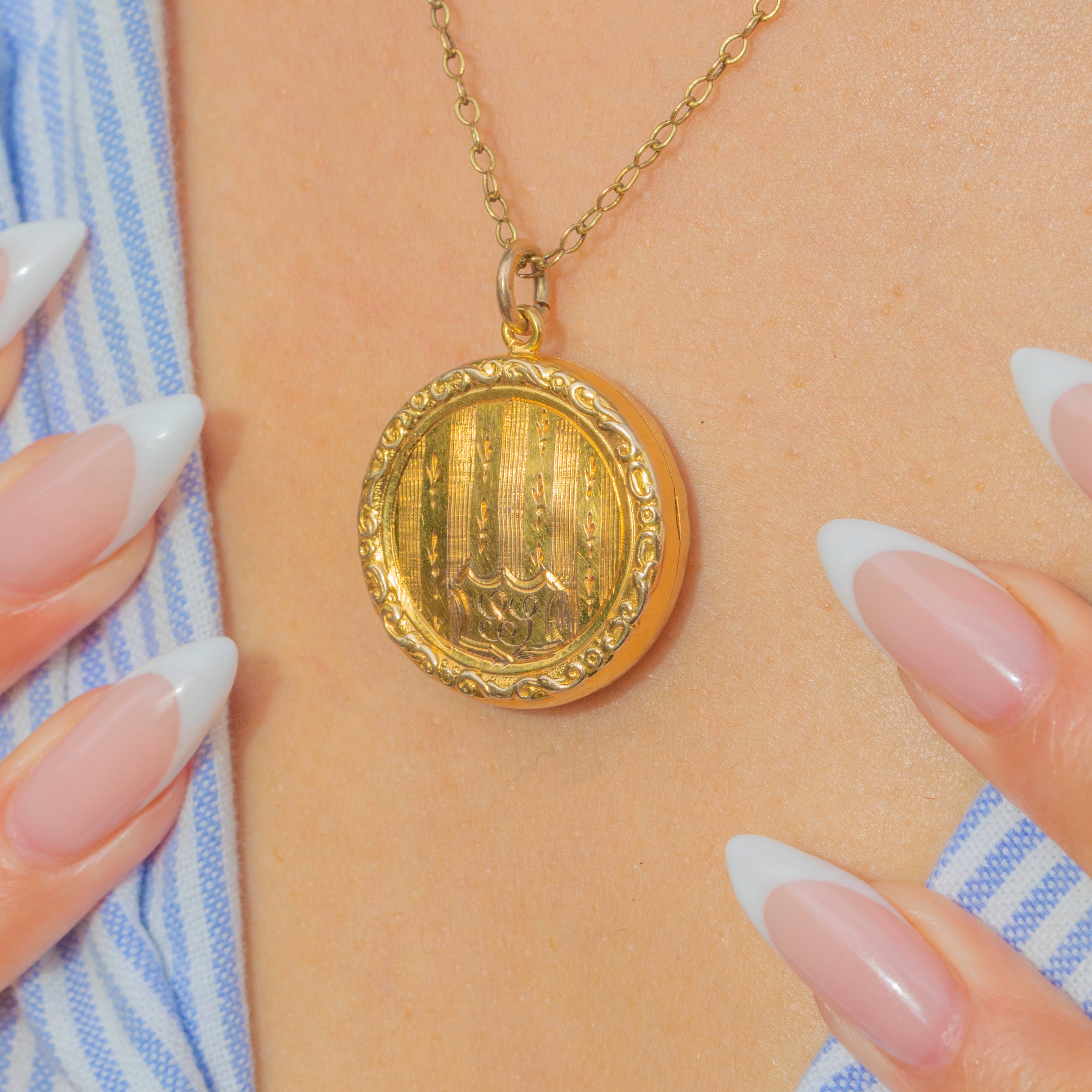 This Edwardian locket is a beautifully preserved example of early 20th-century design. Crafted in solid 9ct Gold, the round face is adorned with a wreath of finely embossed flowers and foliage, framing the uniquely engraved centre.