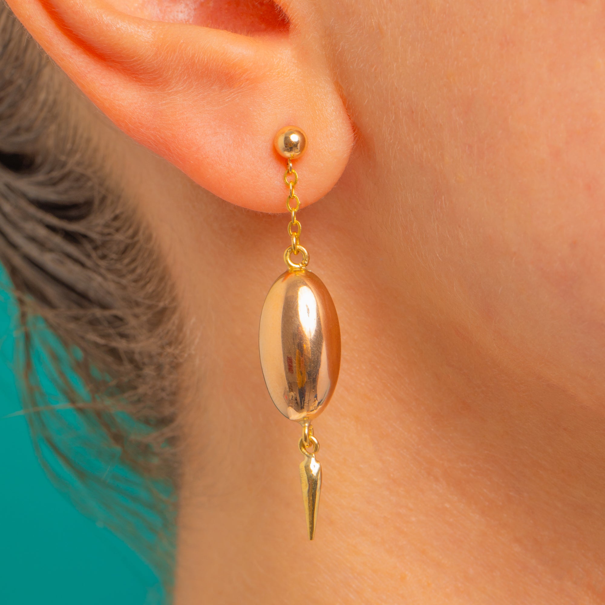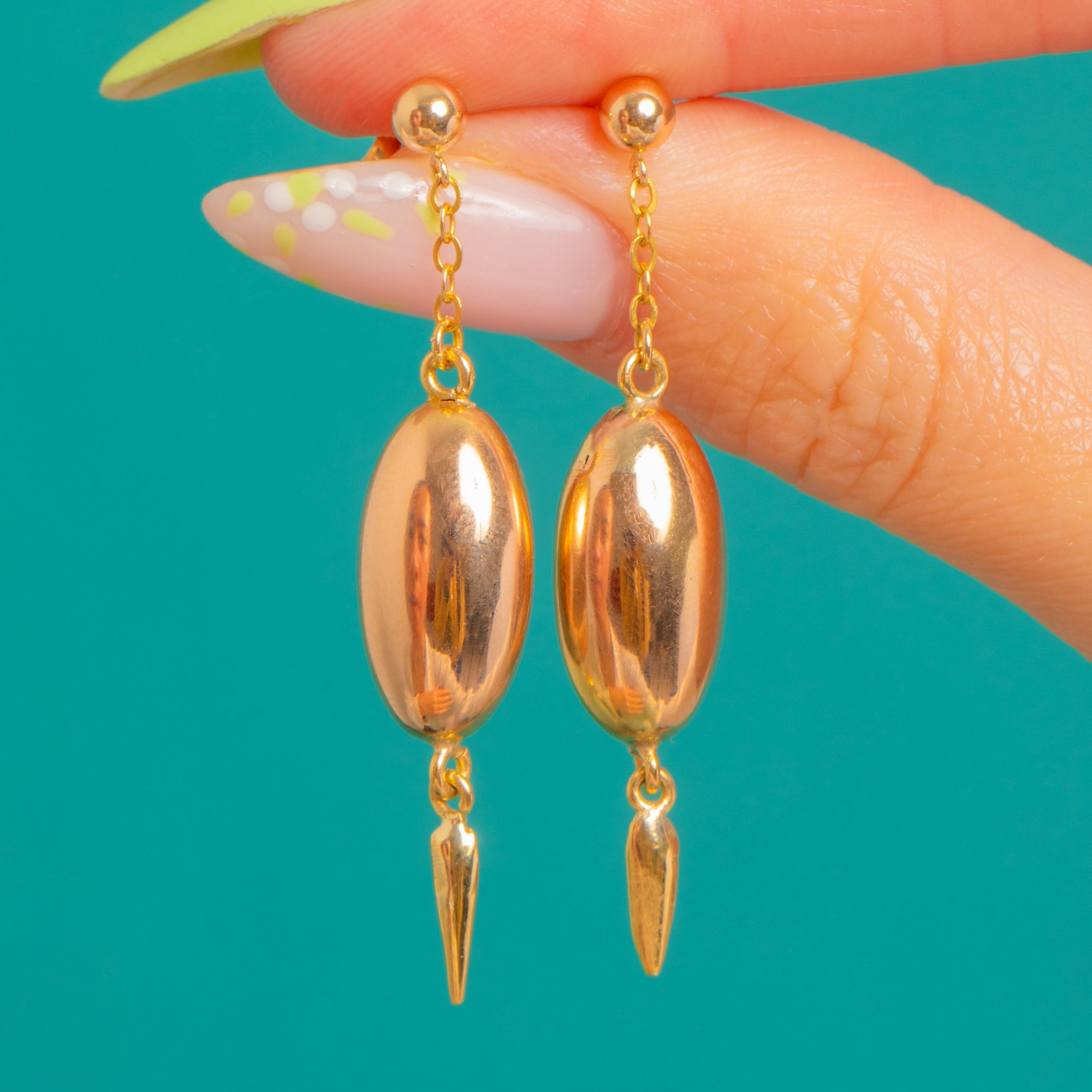 Sleek, sculptural and undeniably elegant, these Victorian torpedo drop earrings are beautifully rendered in glowing 15ct Gold. From a polished ball stud, a short length of chain leads the eye to a smooth elongated oval and a tapering finial, creating that classic torpedo silhouette with delicious, mirror-bright shine and graceful movement.