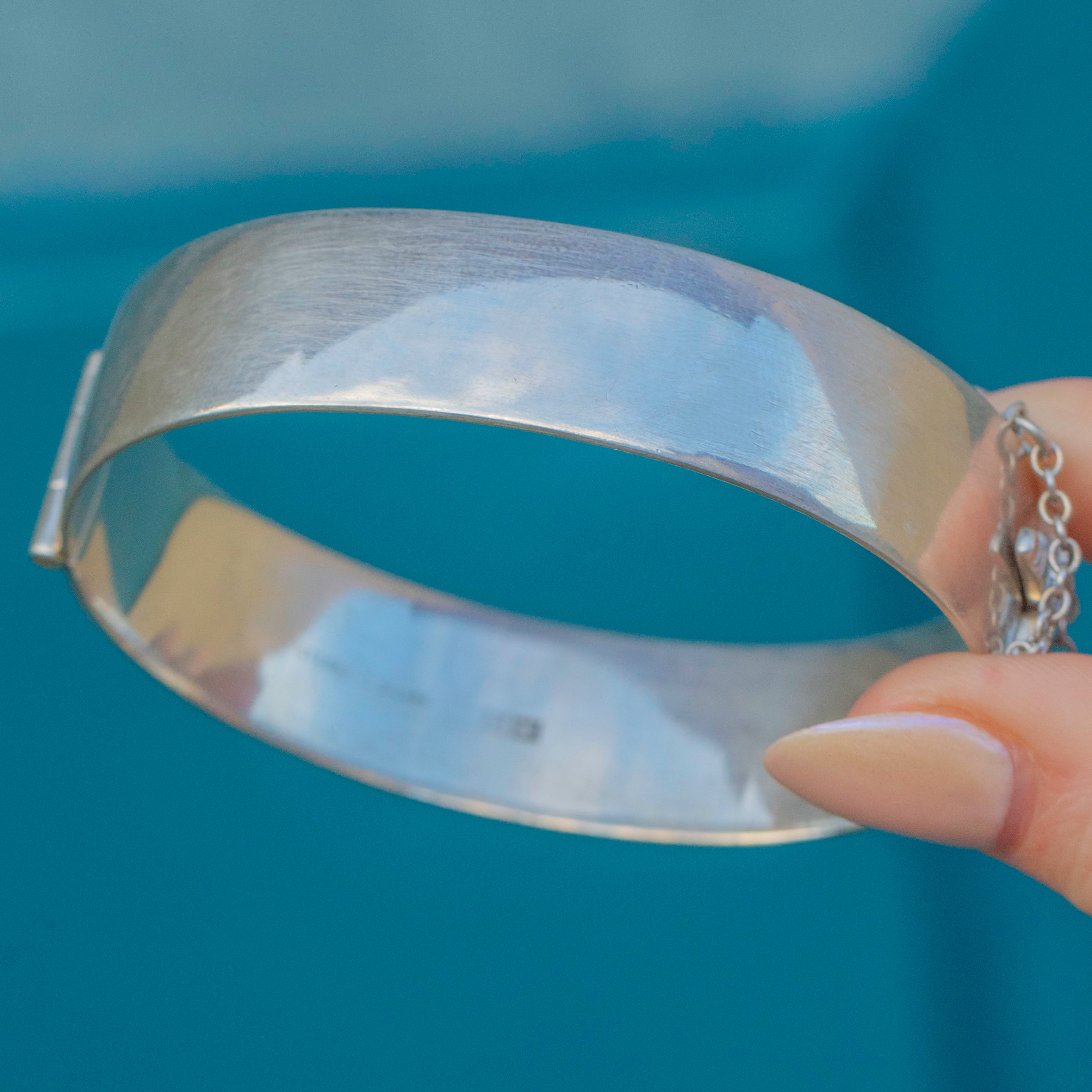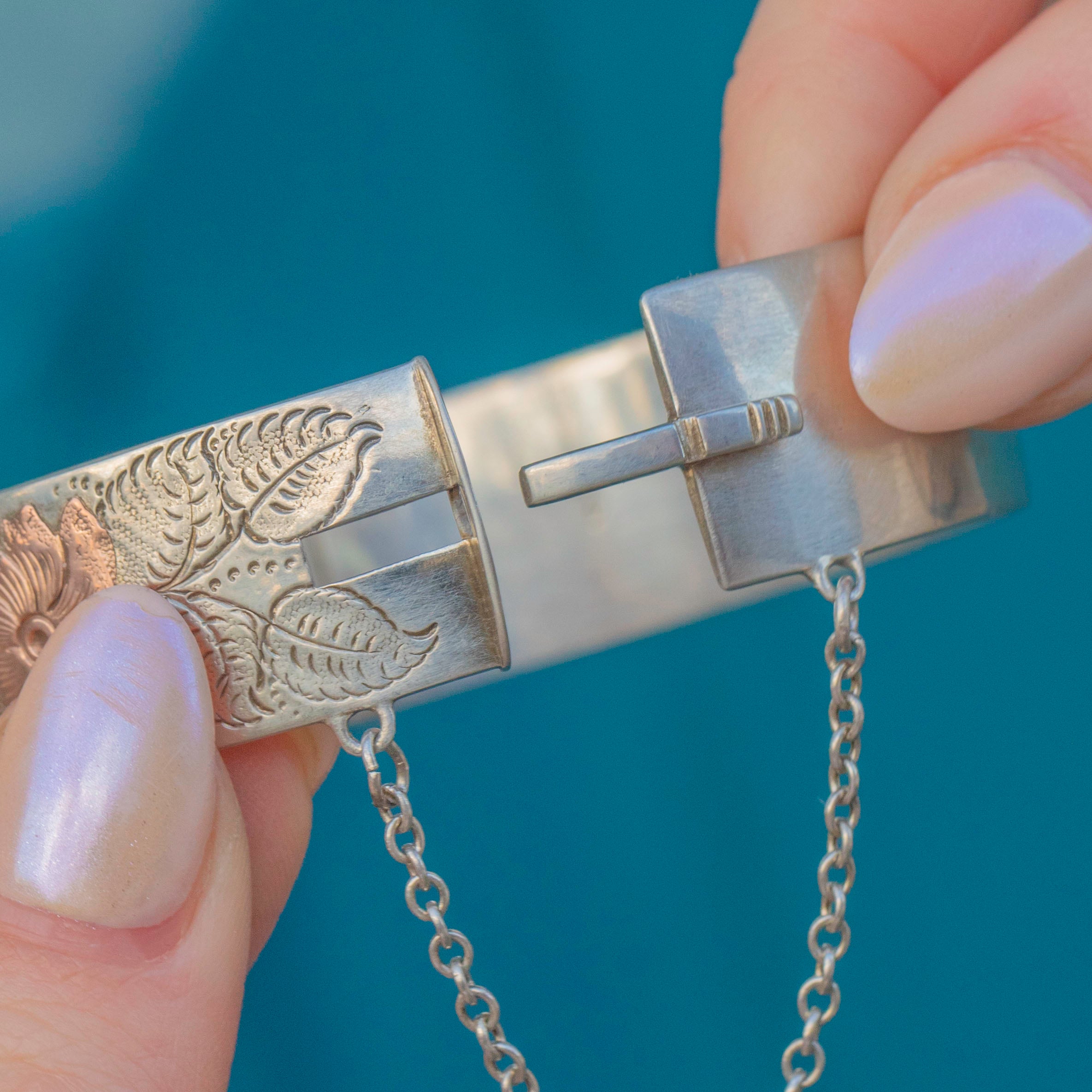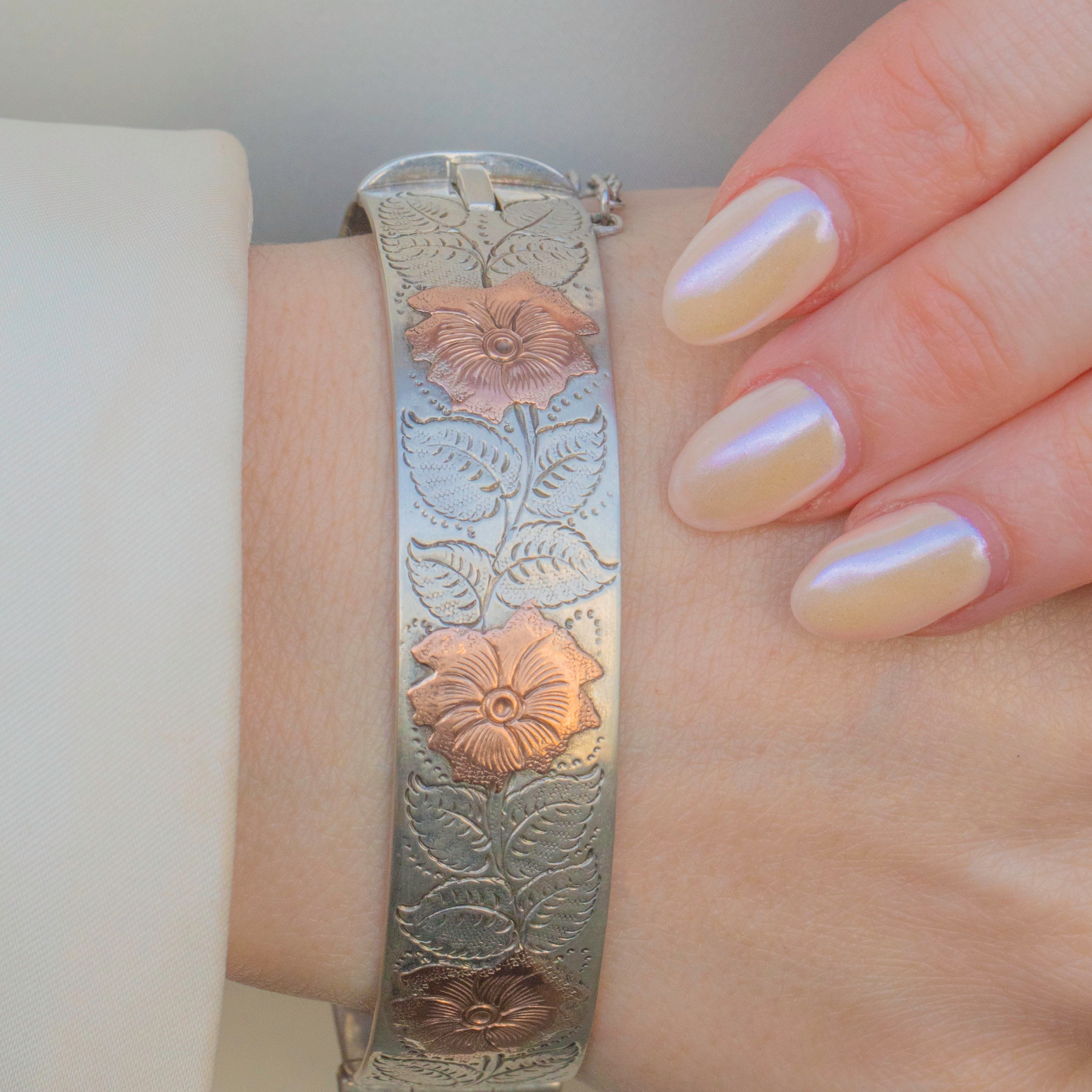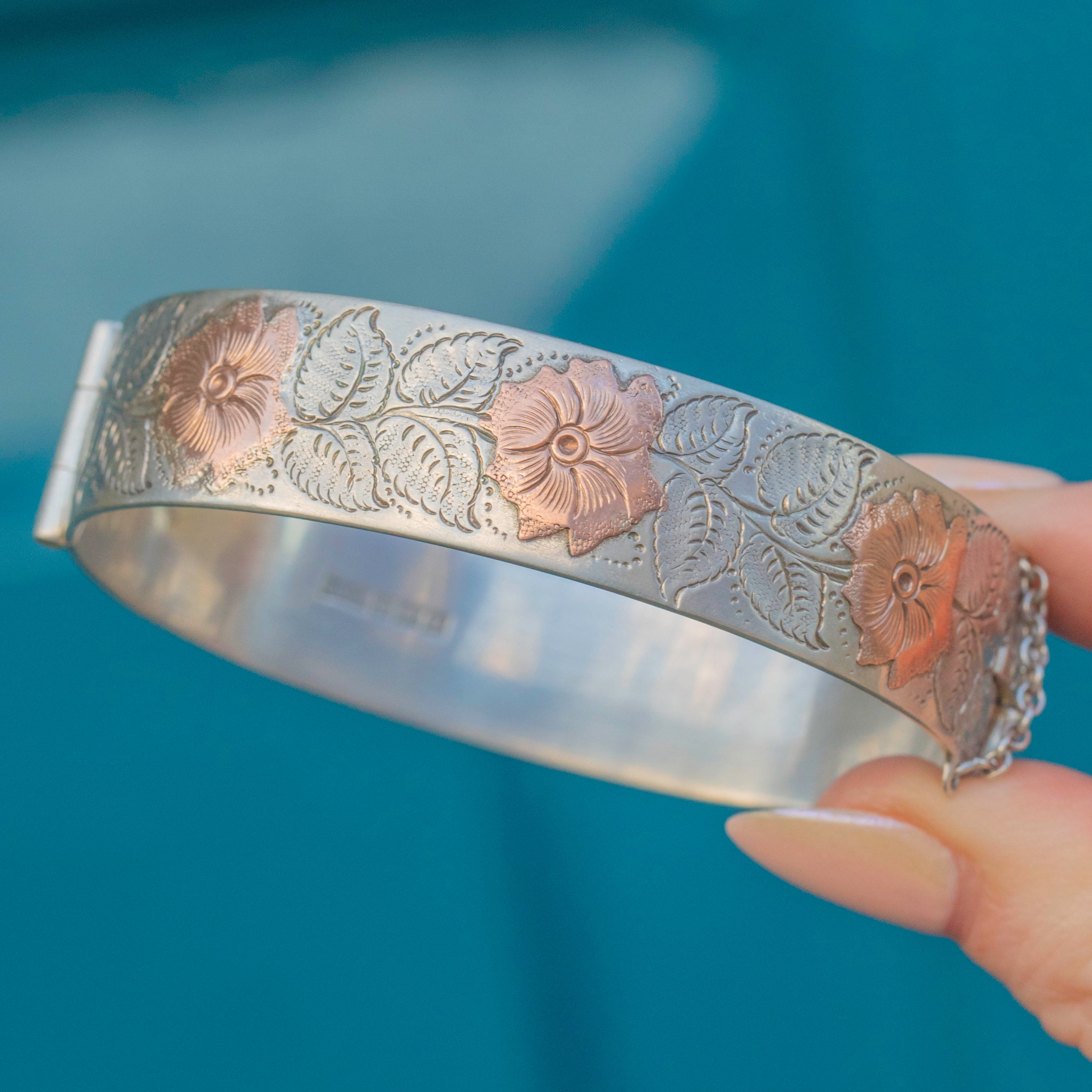 EXCELLENT. This Sterling Silver & 9ct Gold floral engraved bangle is in wonderful condition. The Sterling Silver is bright and glossy and the 9ct Gold accents are rich with rosy tones. She has retained her oval shape incredibly well and wears ever so comfortably. Her engraved details have remained crisp and clear, and she shuts with a satisfying 'click'! This mid-century cuff bangle will become your go-to piece!