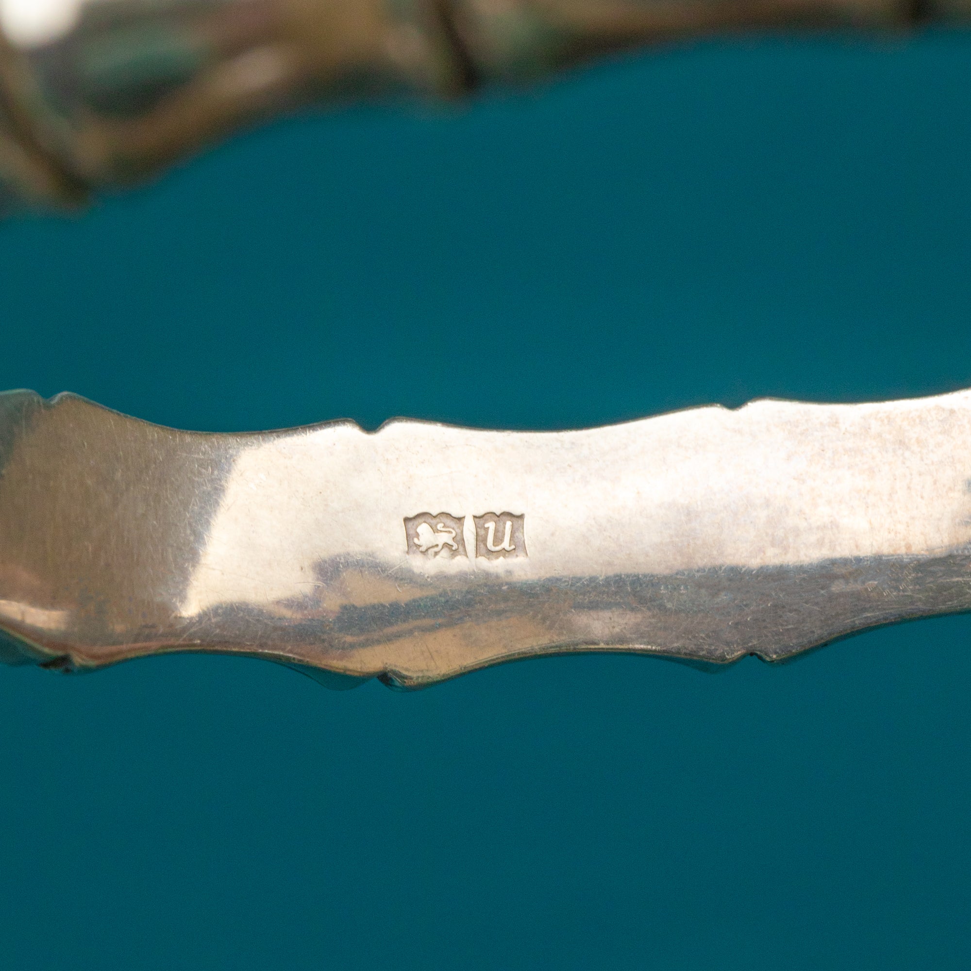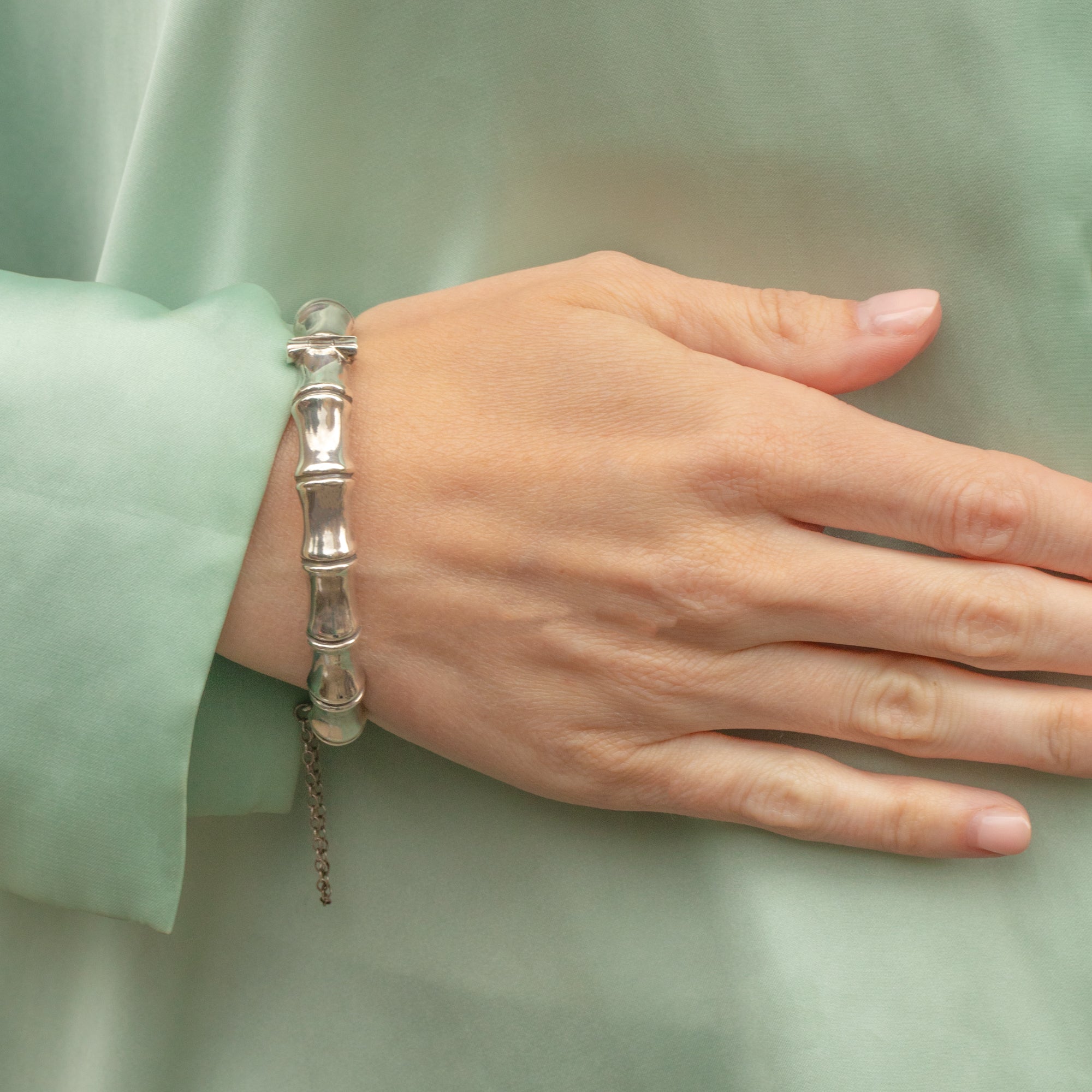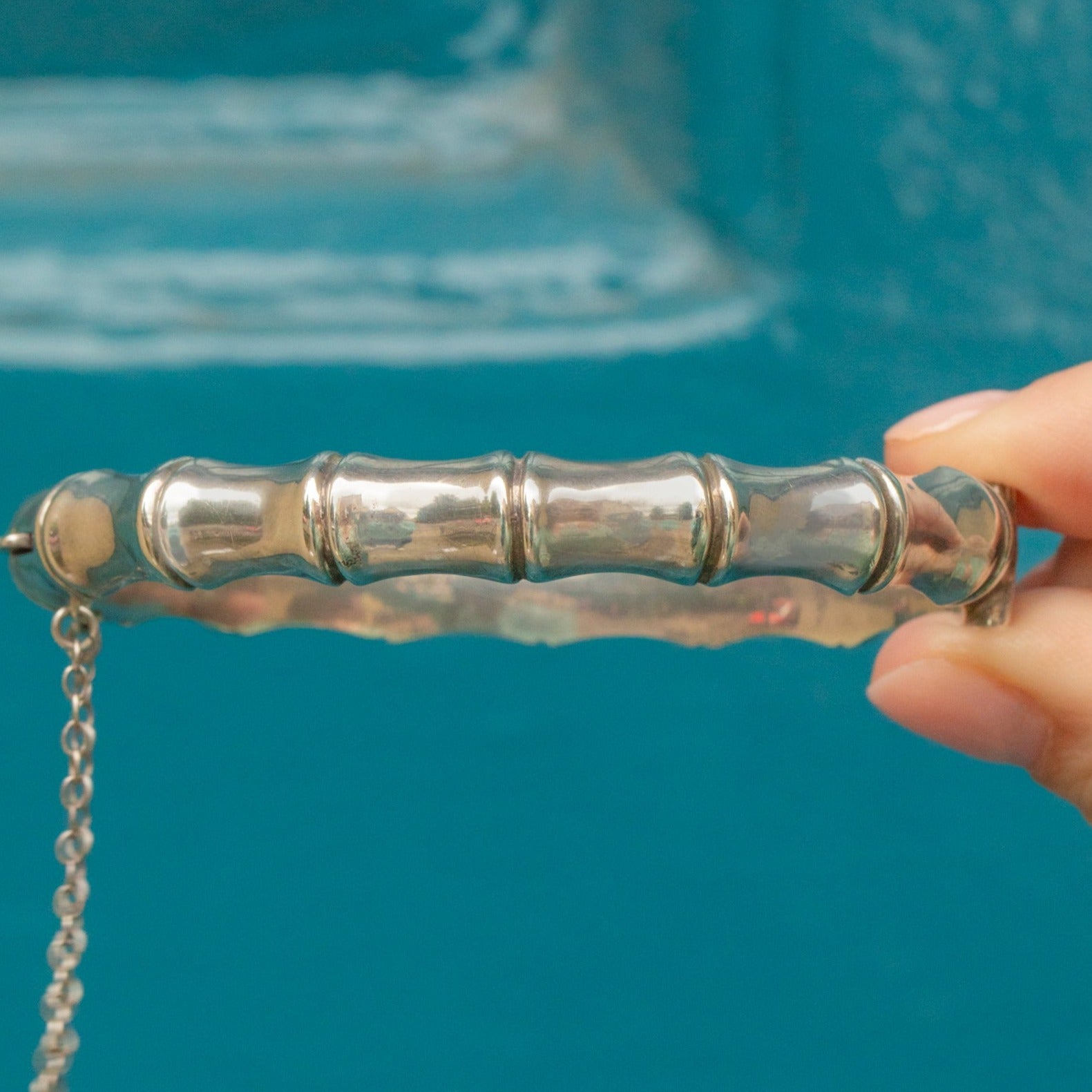 VERY GOOD-EXCELLENT. This Sterling Silver bamboo bangle is in wonderful condition. Aside from a few light dings around her circumference, the Silver is bright and lustrous, and she closes securely with a safety chain for extra peace of mind. The hallmarks are crisp and date this piece to 1969.
