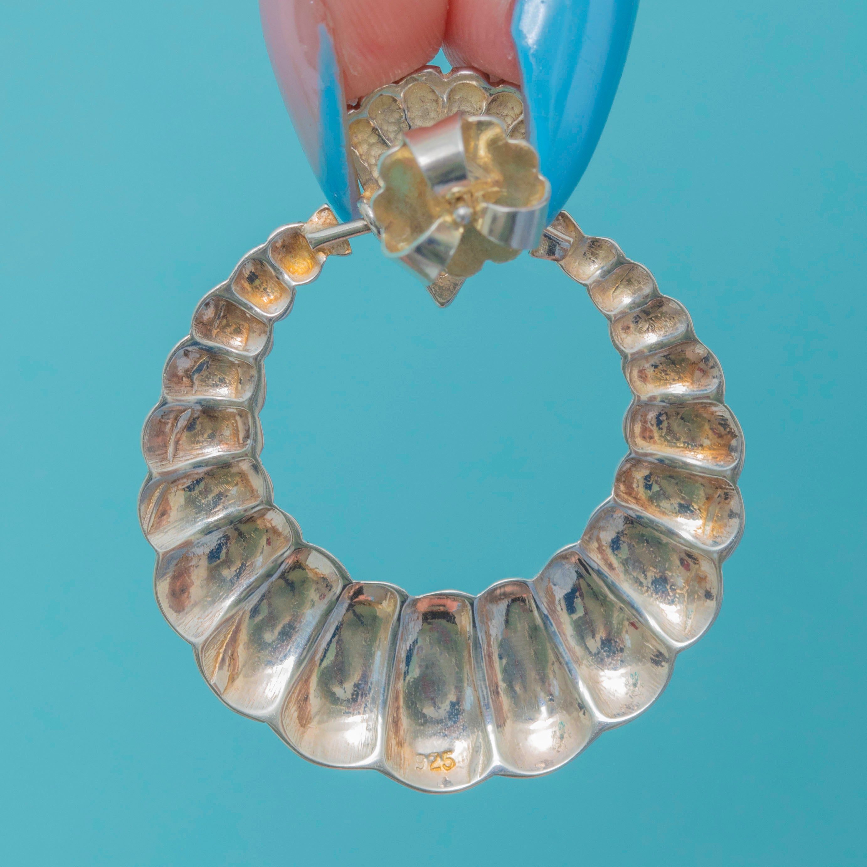 Boasting character, these large vintage earrings are crafted from bright and glossy Sterling Silver, formed into an ornate scalloped edge design, providing a wonderful that catches the light beautifully.