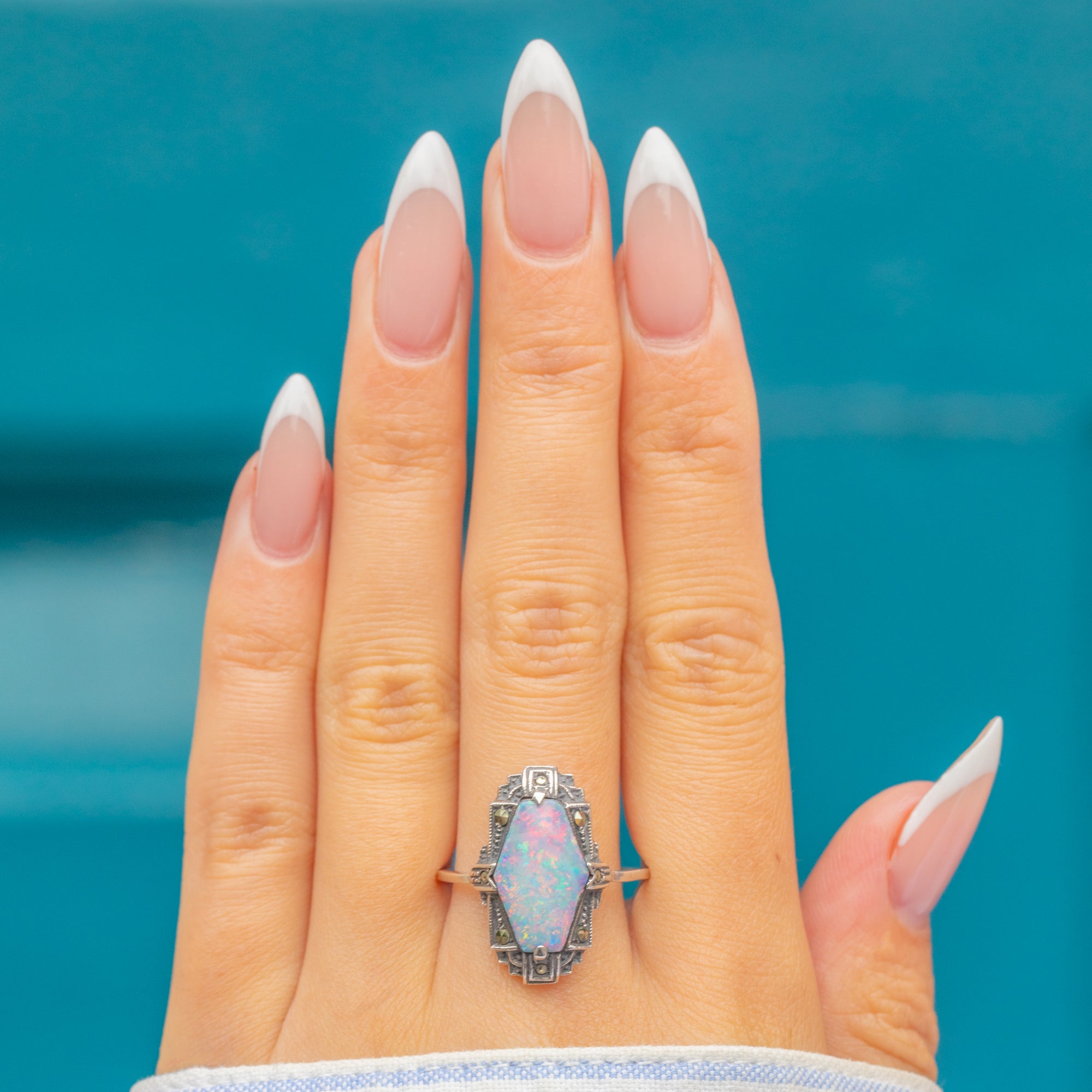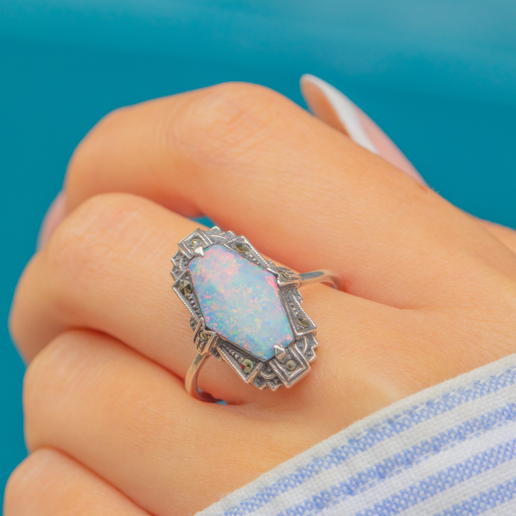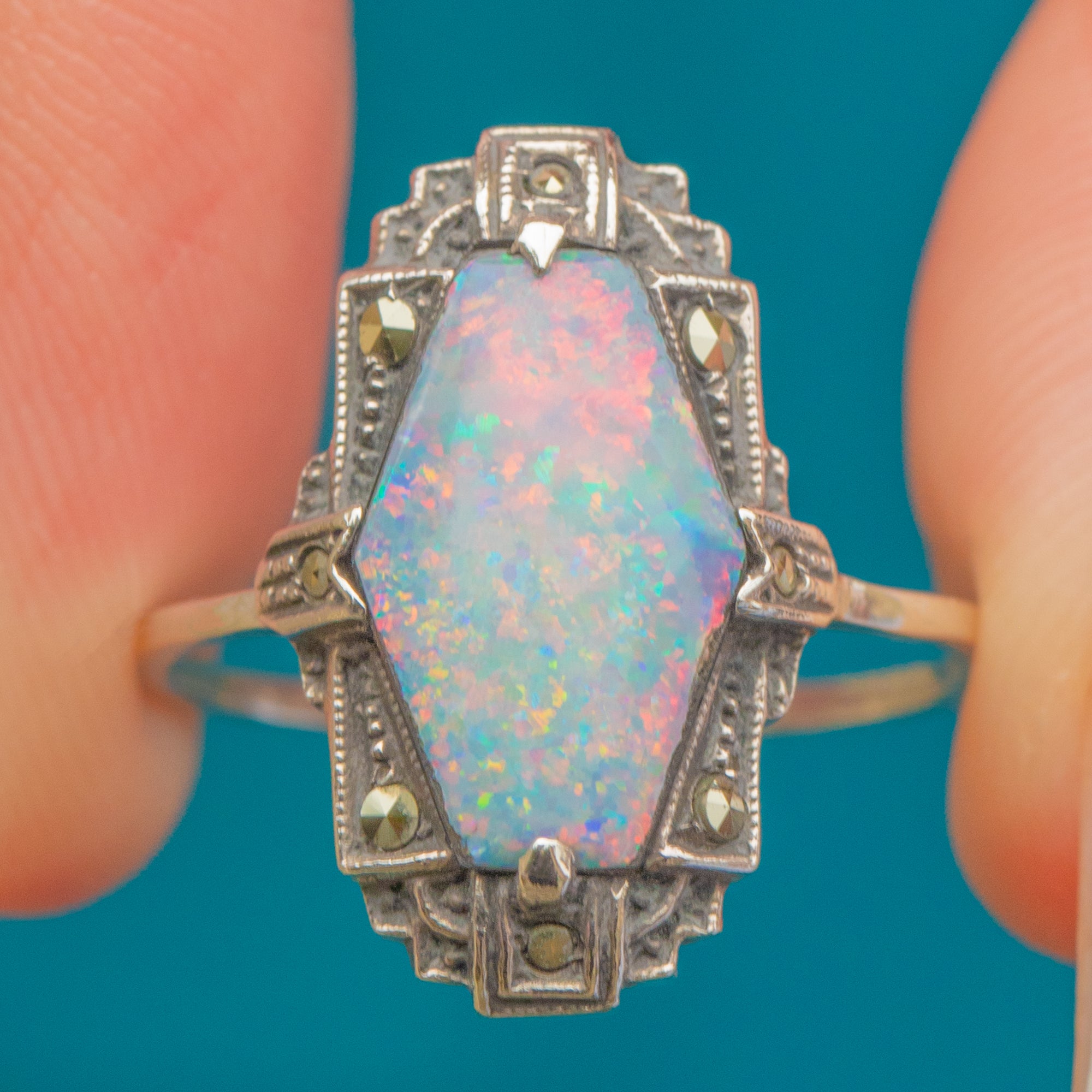 This striking Art Deco ring is crafted in Silver and set with a glowing Opal doublet framed by sparkling Marcasites. The Opal doublet displays beautiful flashes of colour that shift as the light moves across its surface. The Marcasites add a touch of shimmer, enhancing the bold geometric design typical of the period.