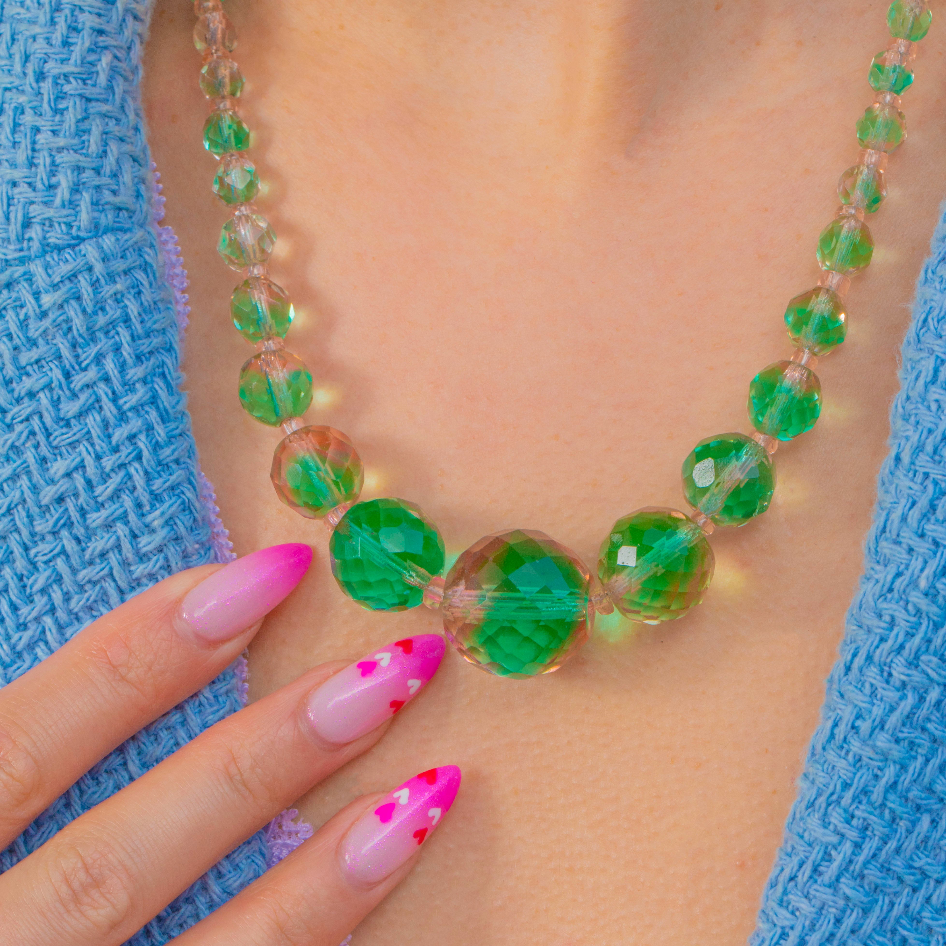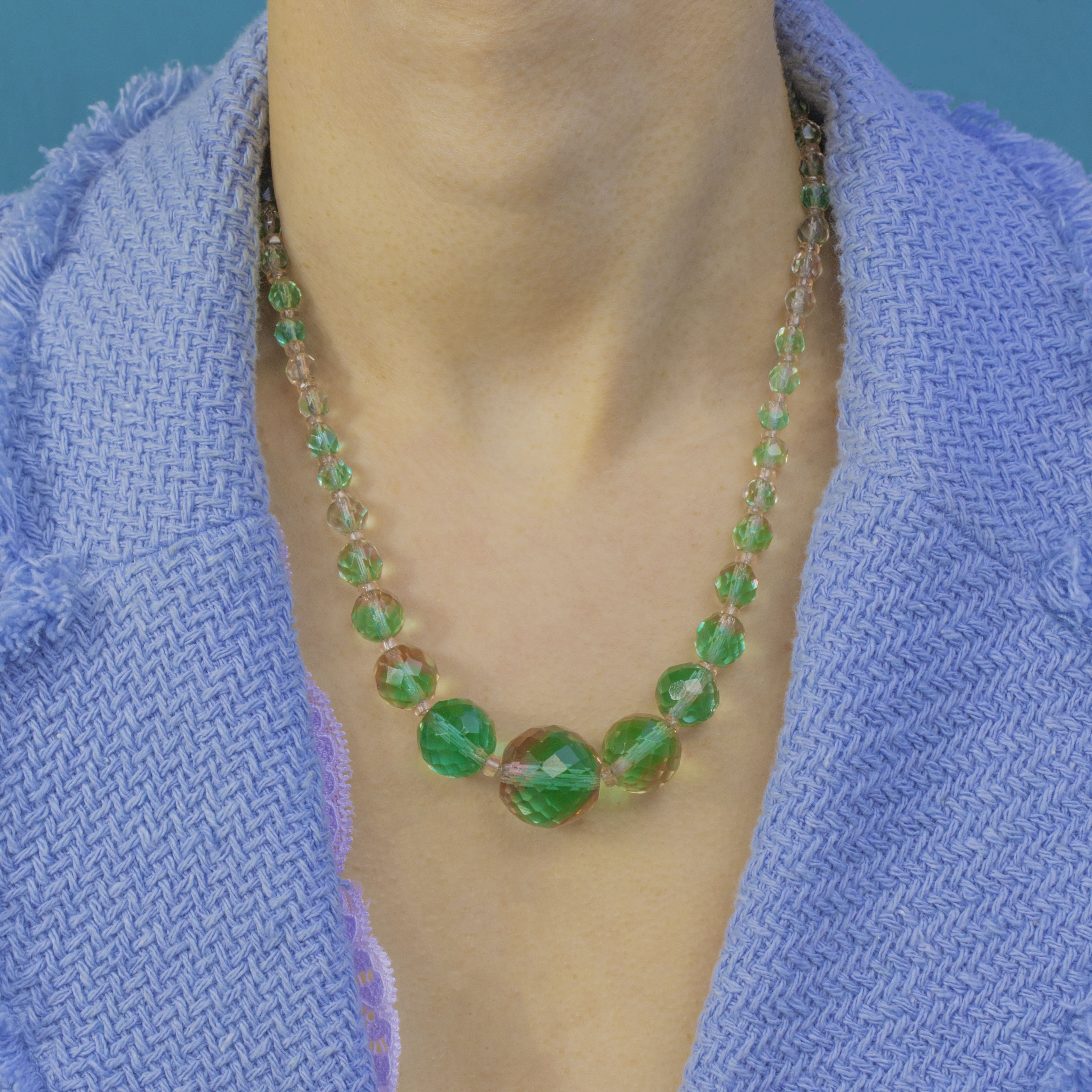 A vibrant sweep of colour and sparkle, this mid-century necklace is composed of bi‑coloured Peach and Bottle‑Green Uranium Glass (Vaseline Glass) beads in a classic graduated strand. Each round, multi‑faceted bead catches the light beautifully, with a delicate iridescent flash dancing across the surfaces for that unmistakable mid‑century glamour.