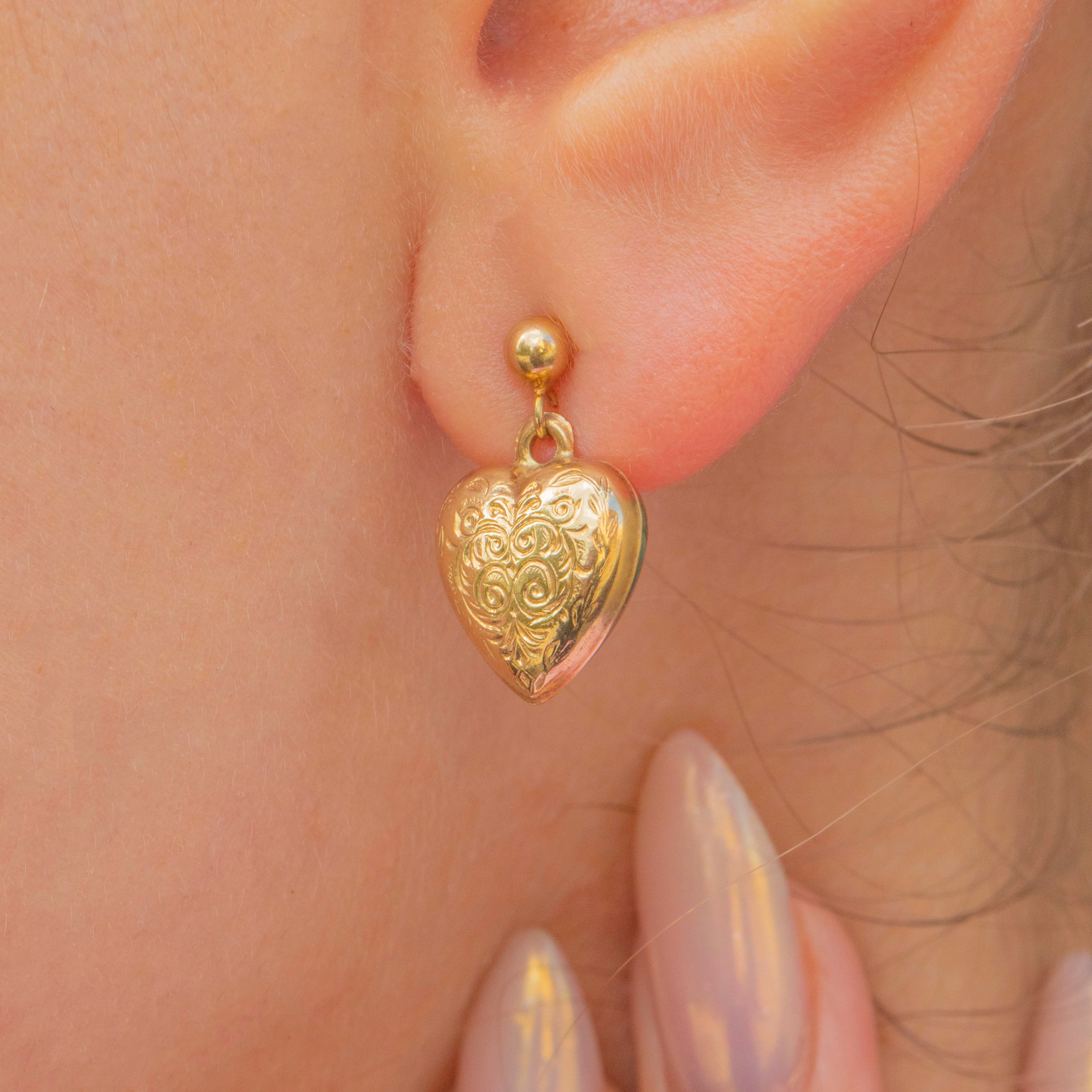Charming Mid-Century 9ct Gold Puffy Heart drop earrings, c.1972, featuring plump, smooth hearts that move gracefully in the ear.