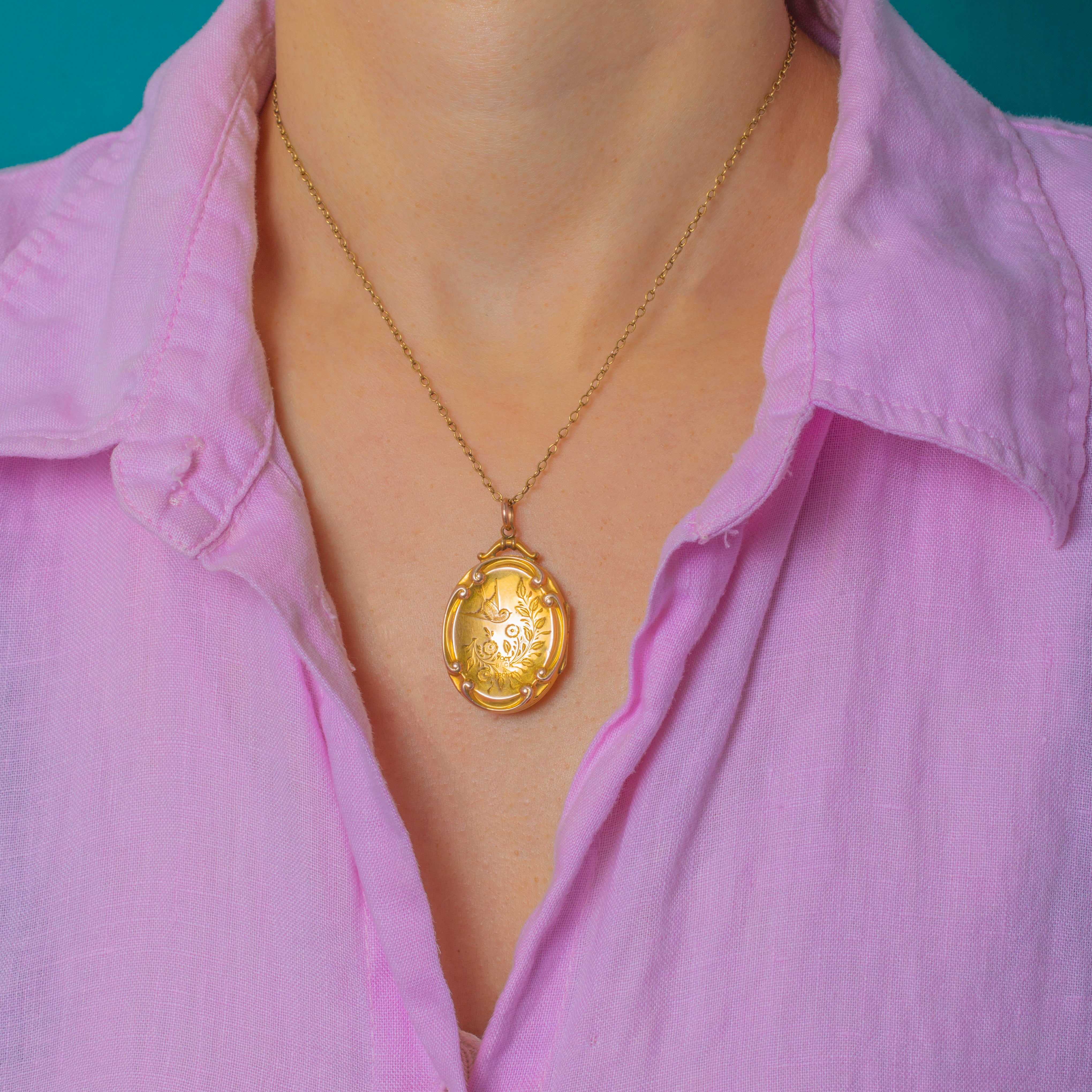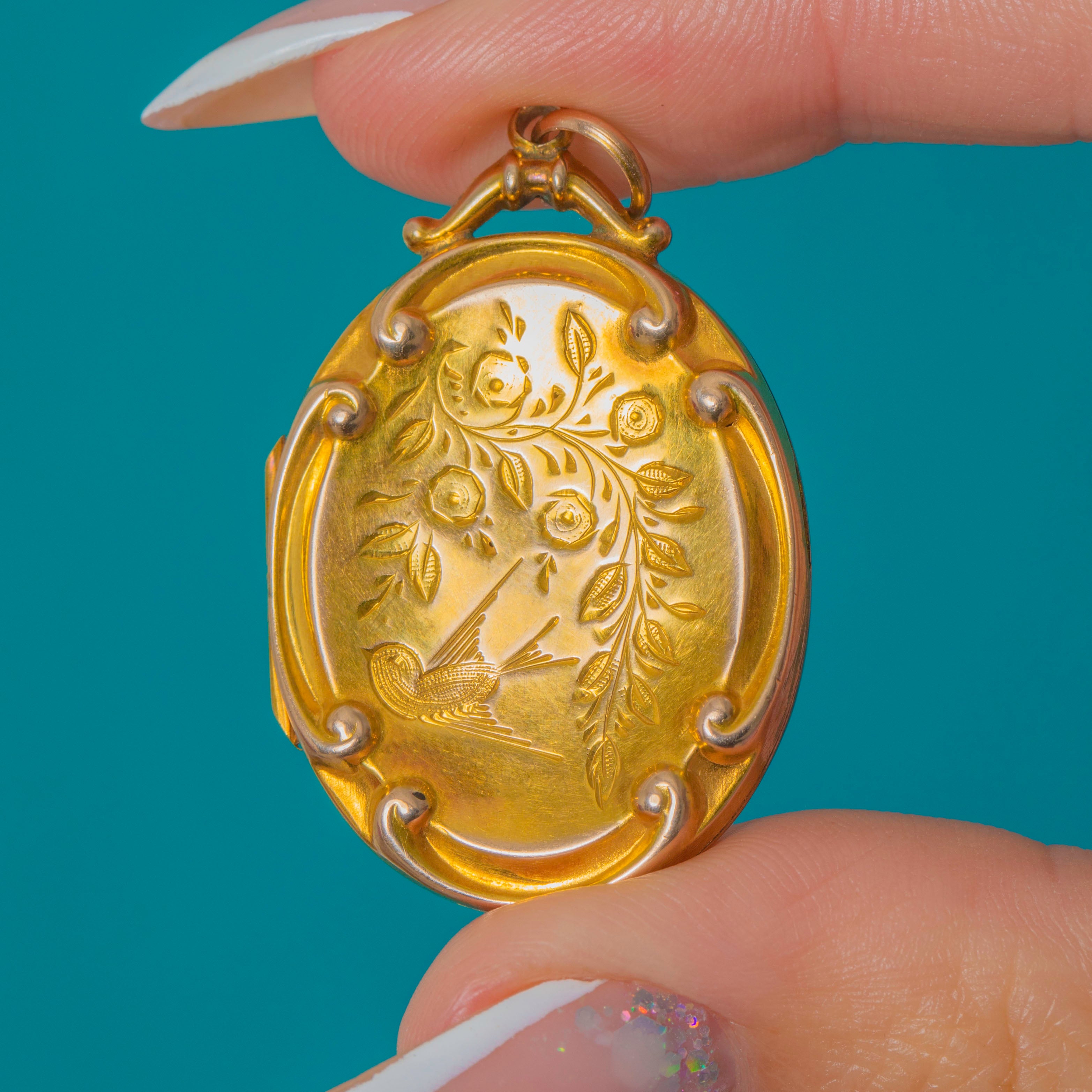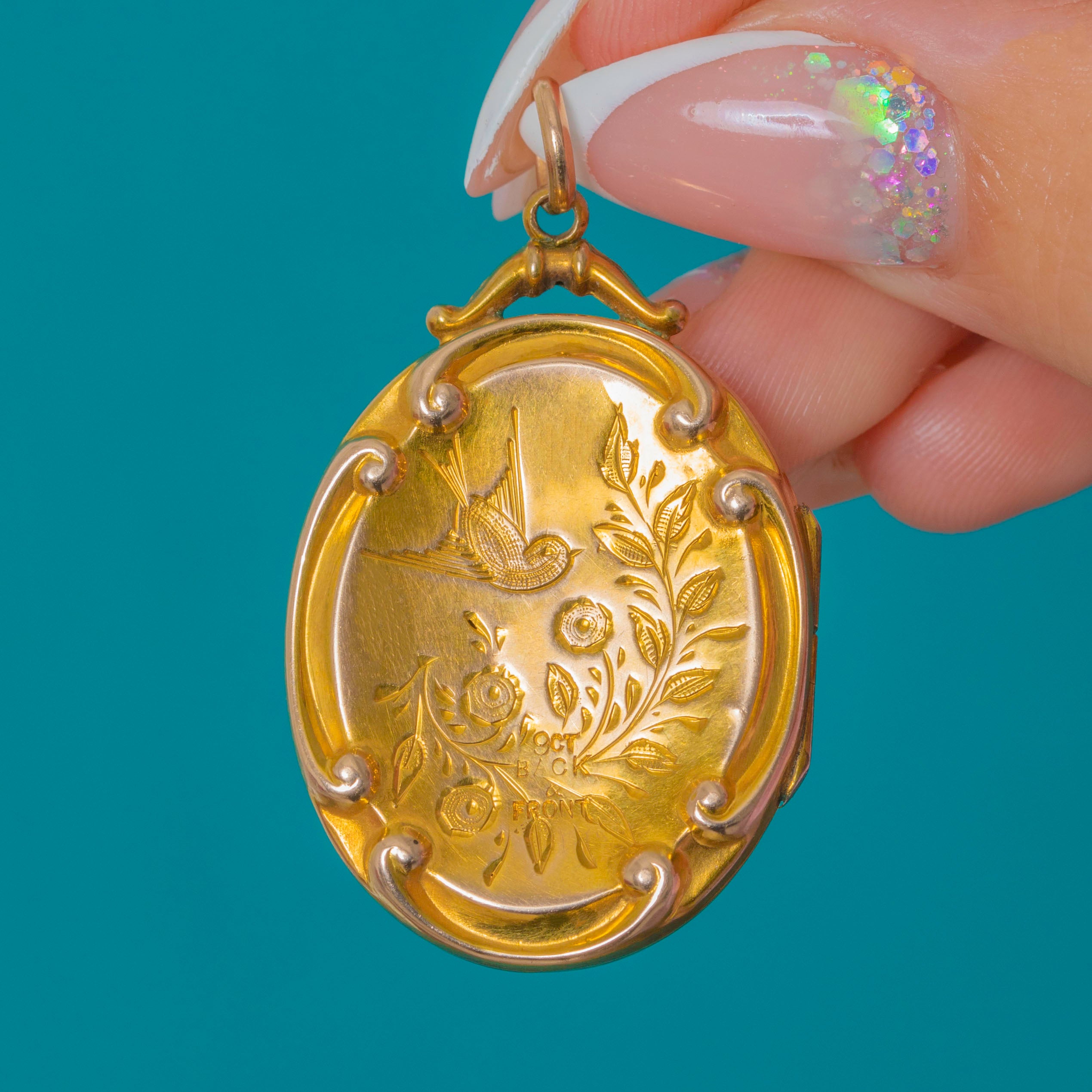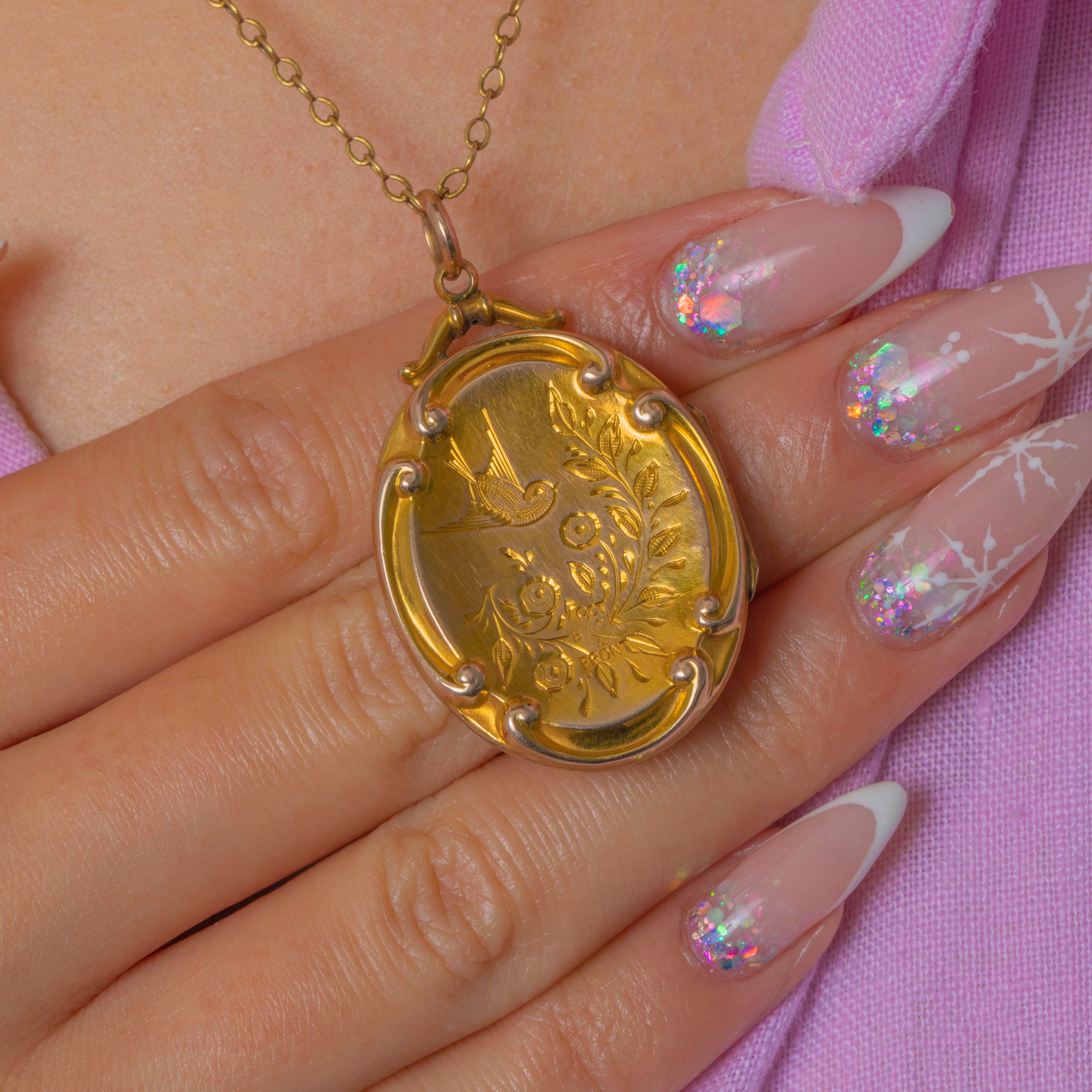 This sweet Edwardian locket features a beautifully engraved bird in flight surrounded by delicate floral motifs on both sides. The engravings remain wonderfully crisp even after more than a century, and the bright Yellow Gold back and front construction gives the piece a lovely warm glow.