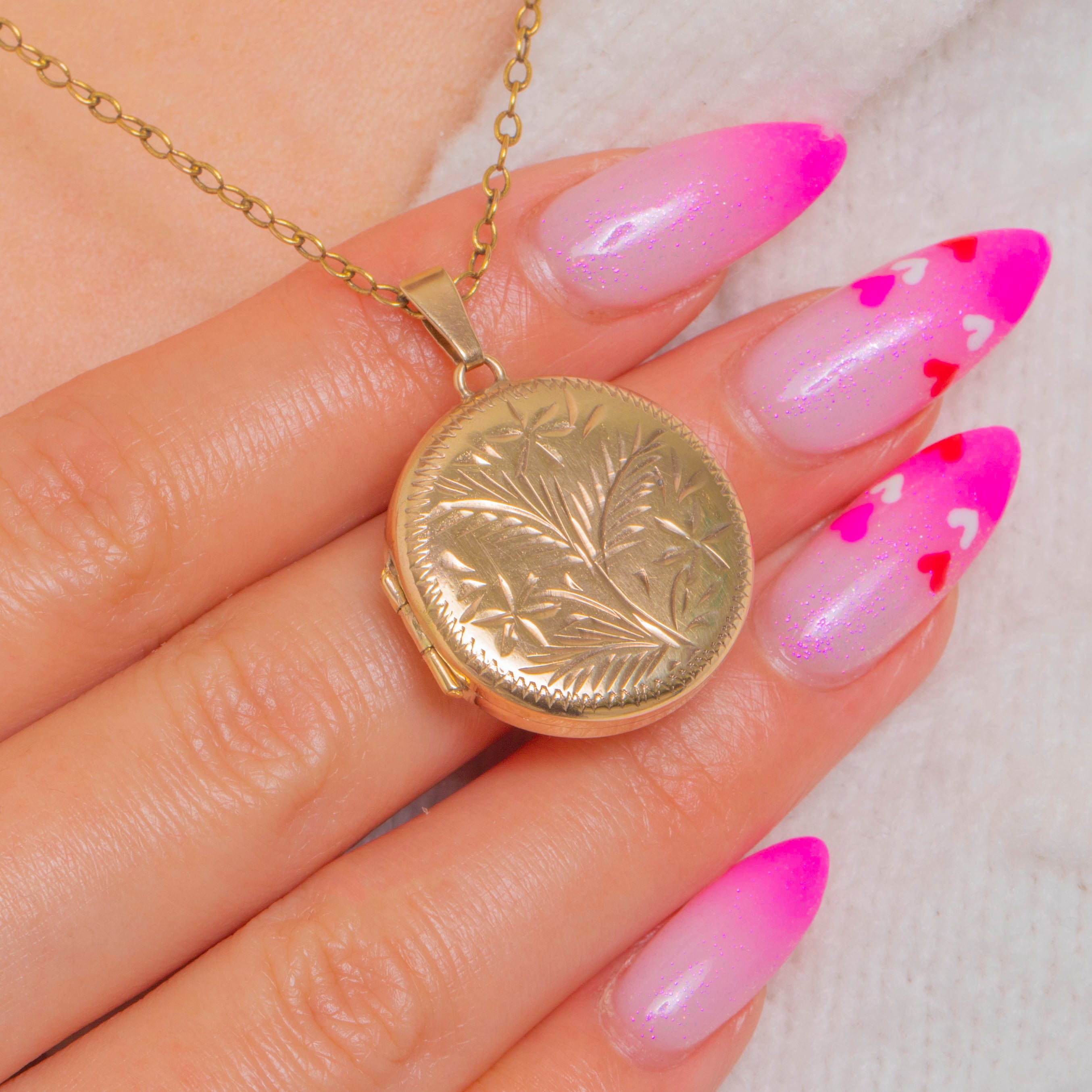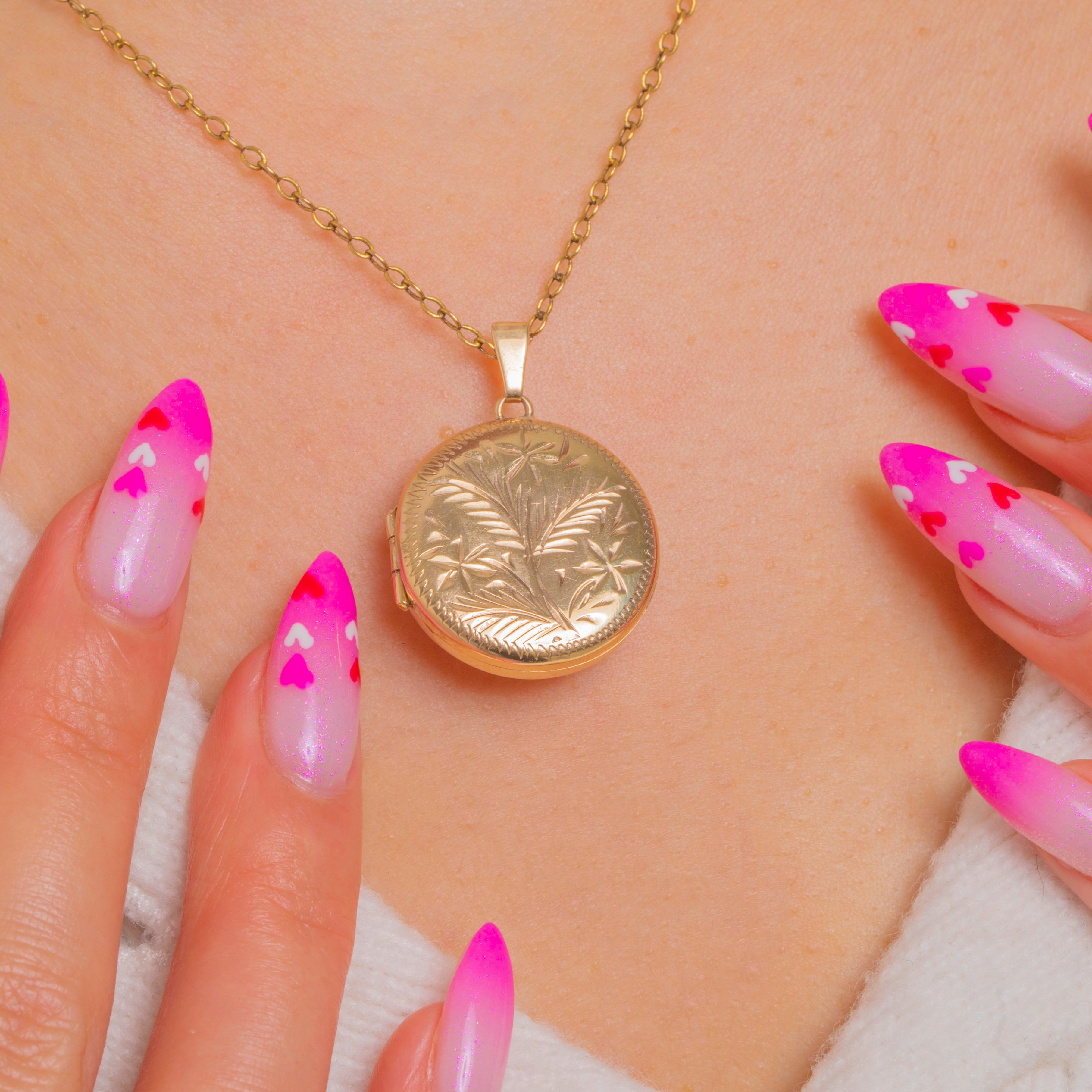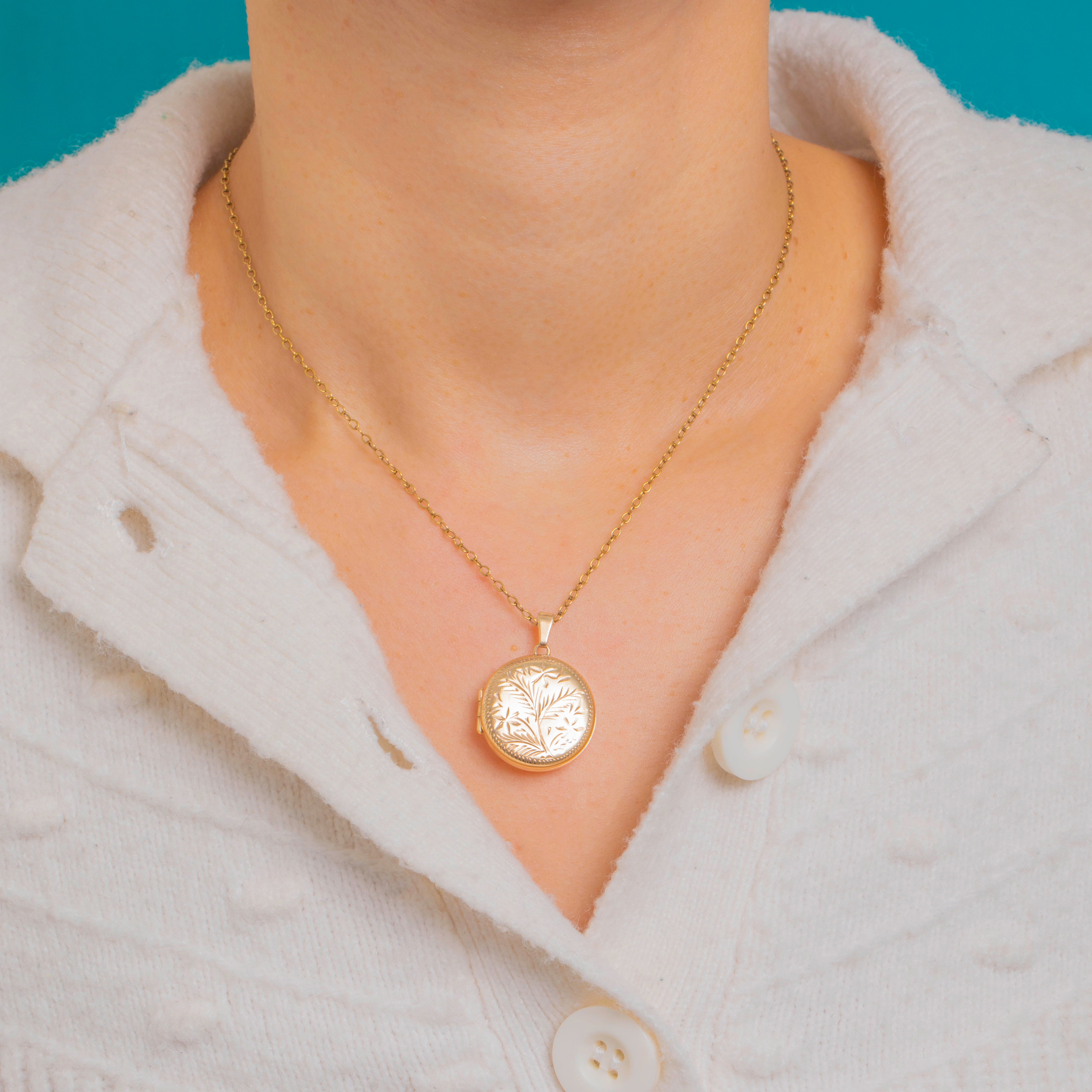Sweet and sentimental, this round Vintage 9ct Gold locket is adorned with a hand-engraved foliate spray framed by a crisp chevron border. The face shimmers softly with its detailed engravings, while the reverse is sleek and highly polished with a full set of hallmarks dating to 1978.