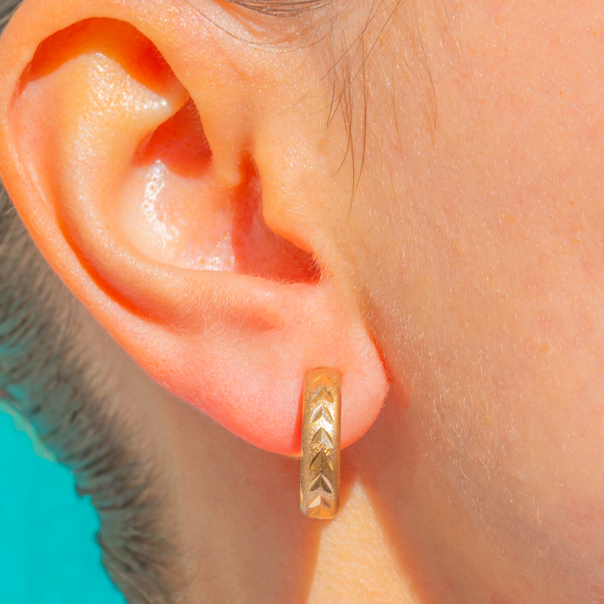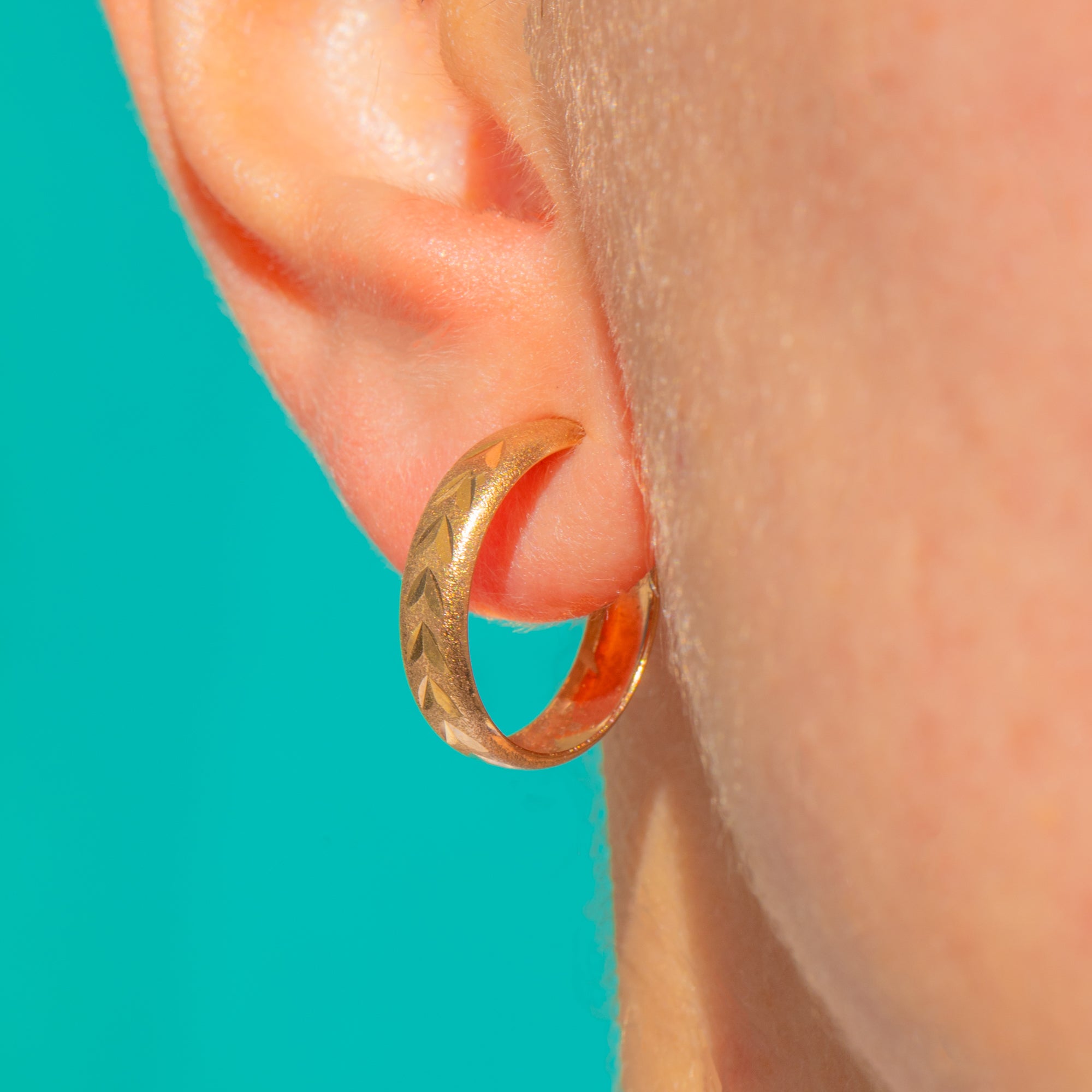 Petite yet perfectly poised, these textured 9ct Gold hoops capture the effortless elegance of the late 1970s. Their slim profile is adorned with a repeating chevron motif set against a soft satin ground, lending a subtle play of light and shade with every movement. Understated and timeless, they’re a beautifully wearable staple that pairs as easily with crisp tailoring as with weekend knits.