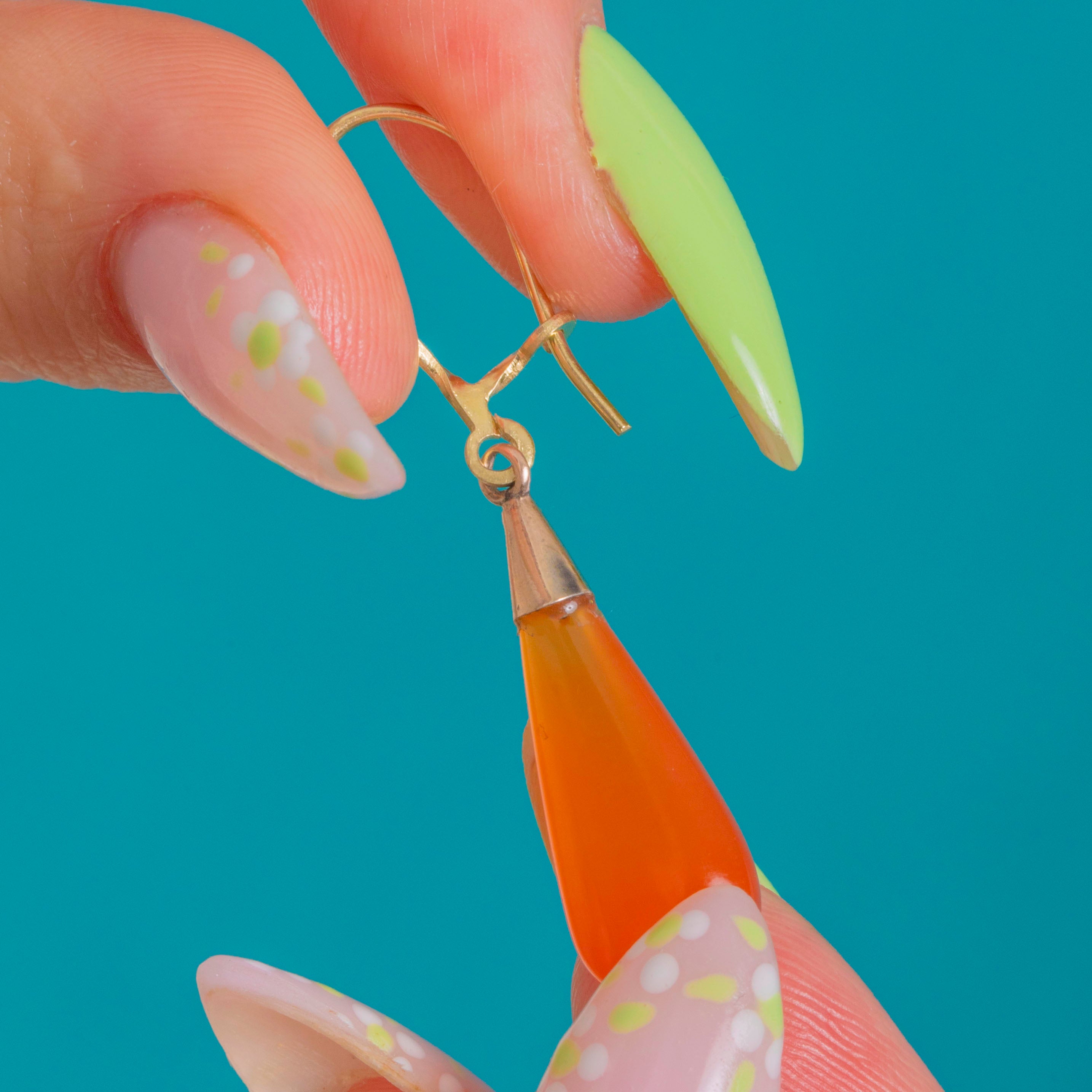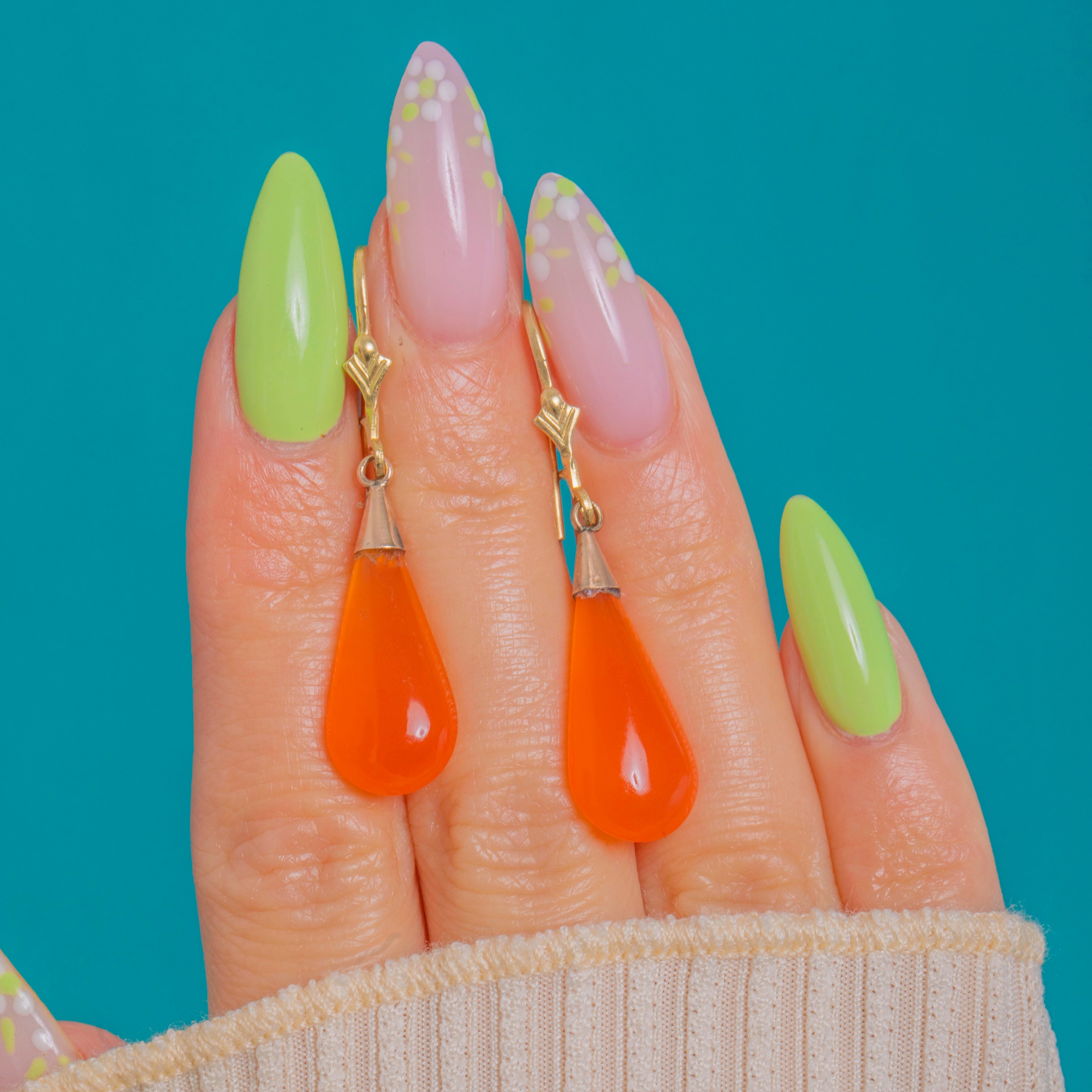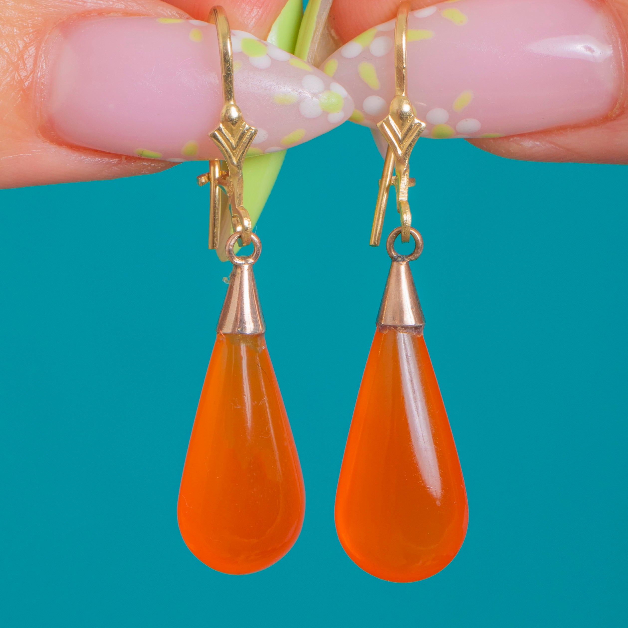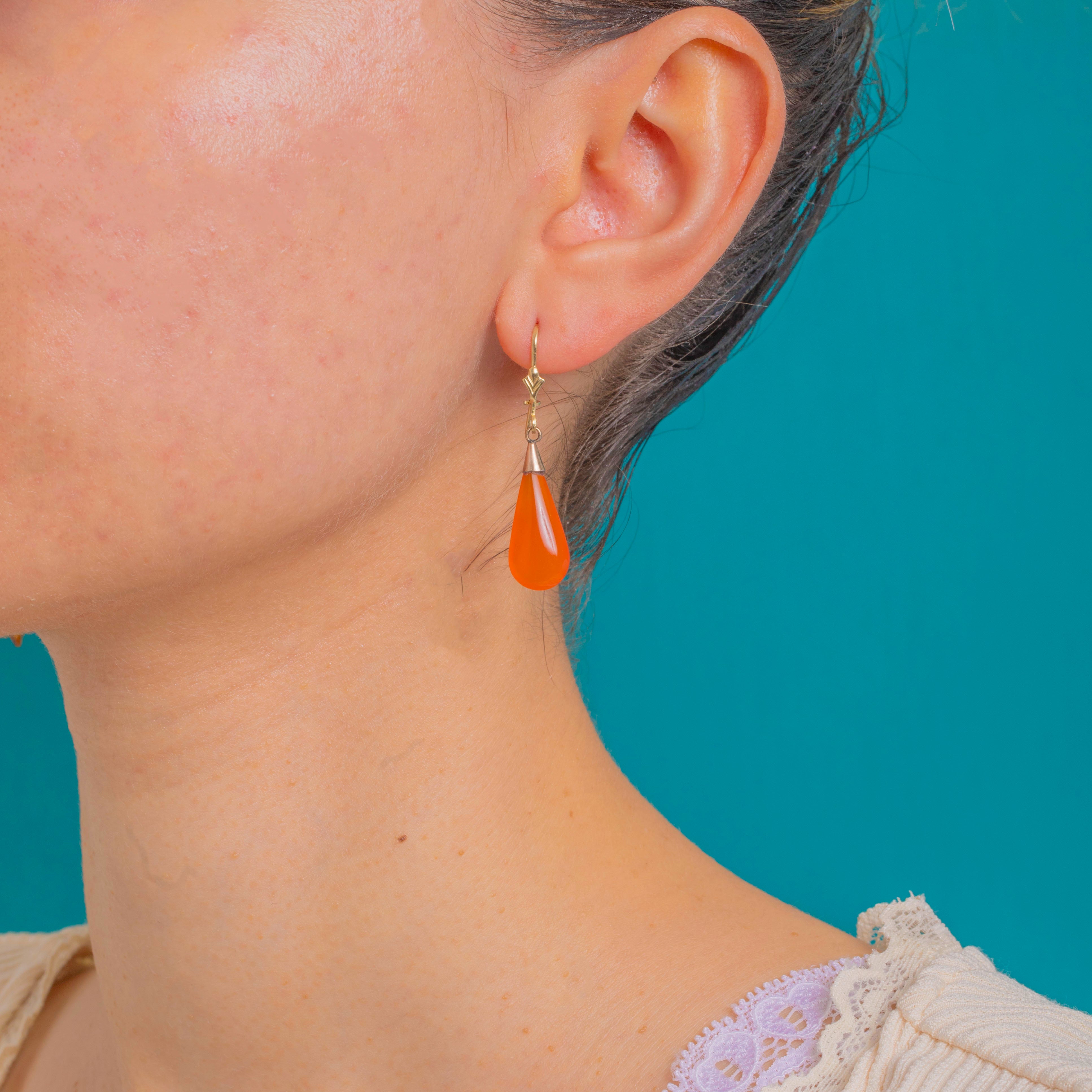 Vivid and sculptural, these Victorian Carnelian torpedo earrings glow with saturated orange warmth. Each elongated teardrop cabochon is crowned by a neat conical 9ct Gold cap, allowing the stones to sway gracefully and catch the light with every movement. The look is sleek and refined, letting the rich colour of the Carnelian take centre stage.