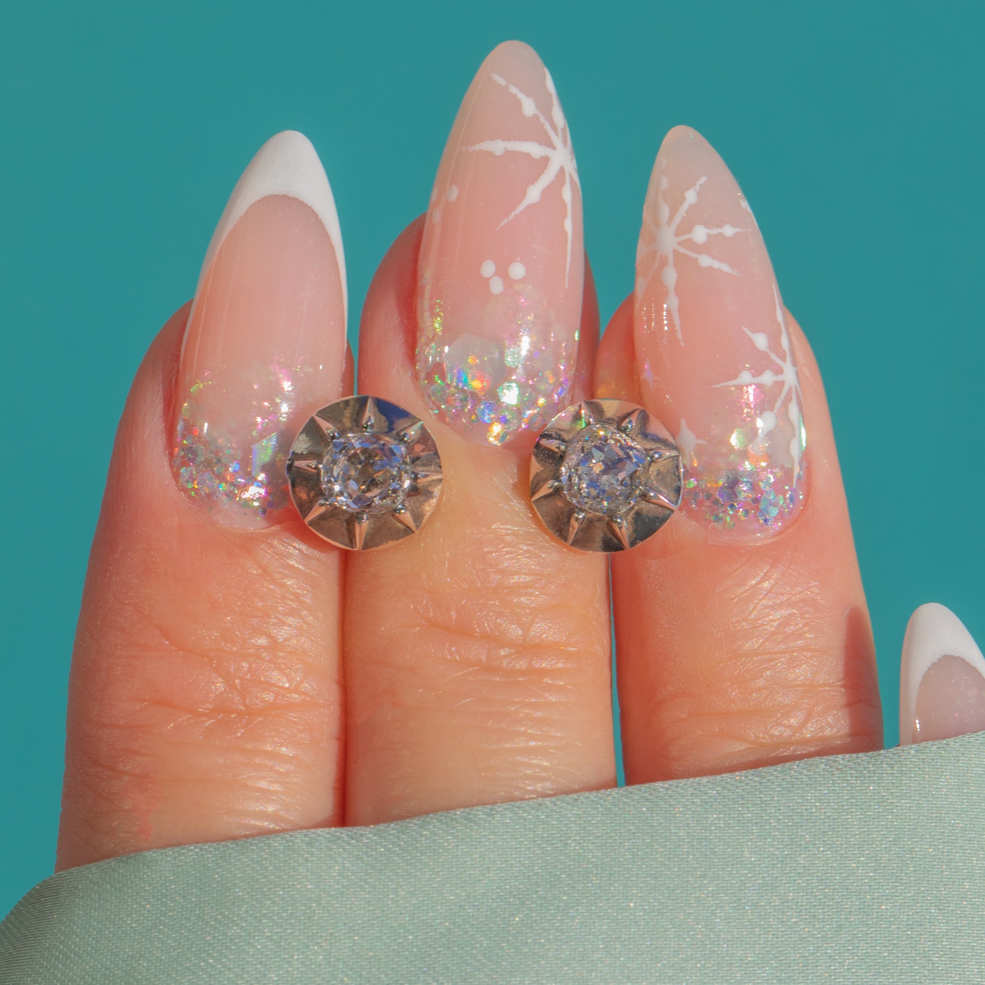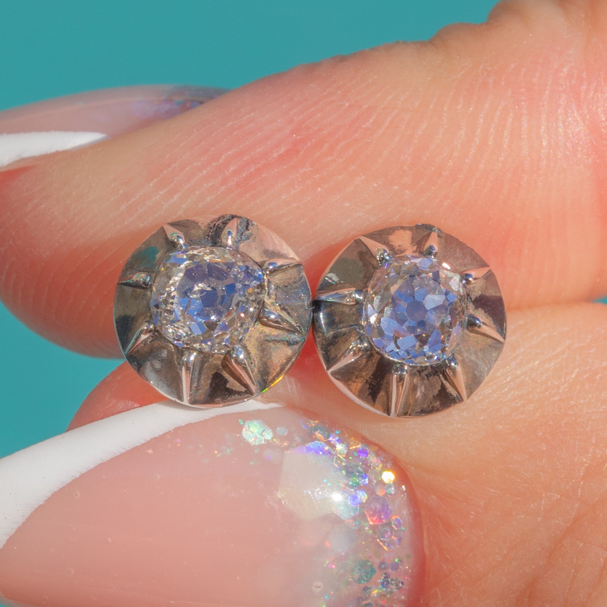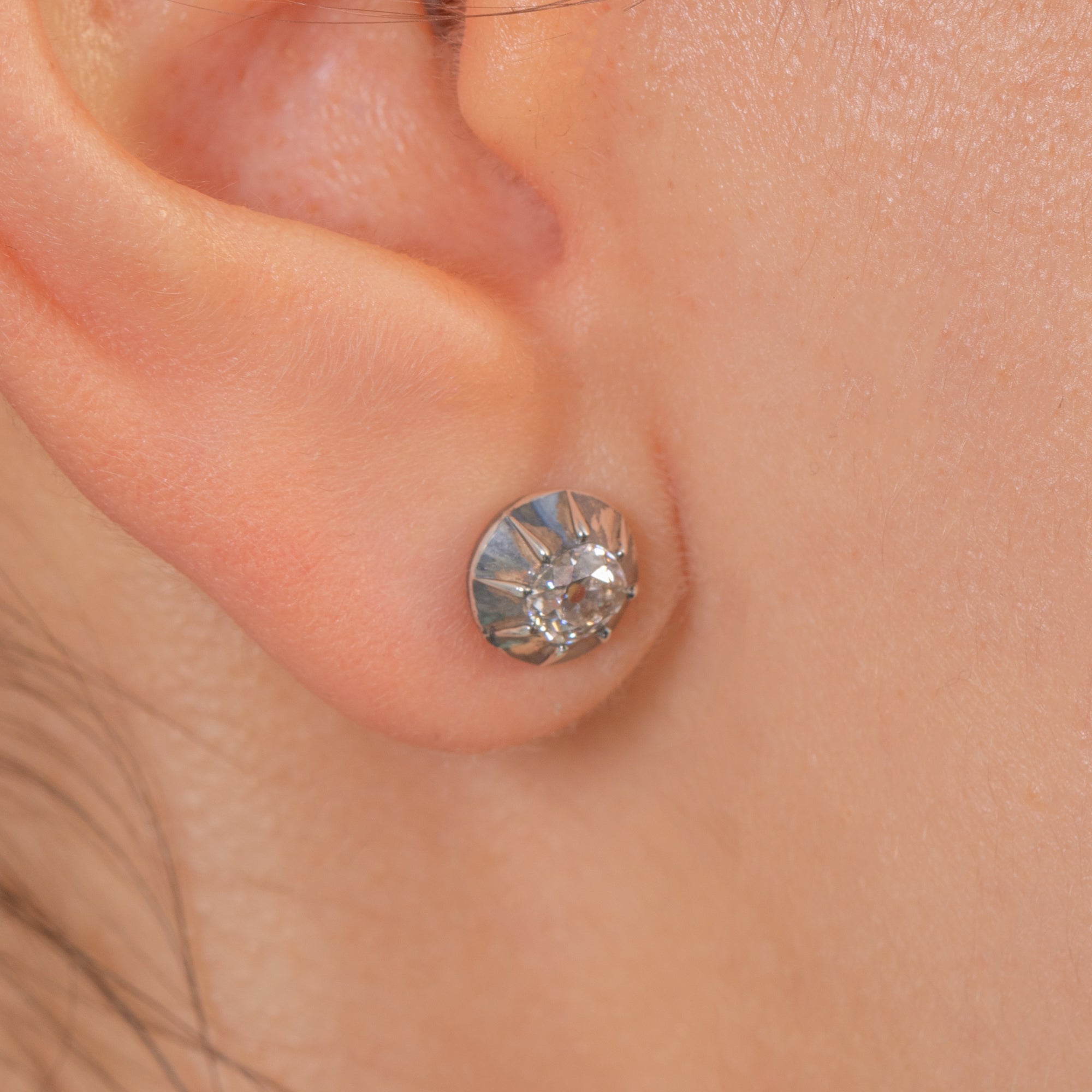 The Diamonds are crisp and lively, estimated F–H in colour with an SI clarity. Their old-cut faceting gives off a soft candlelight brilliance; elegant, understated, and full of character.