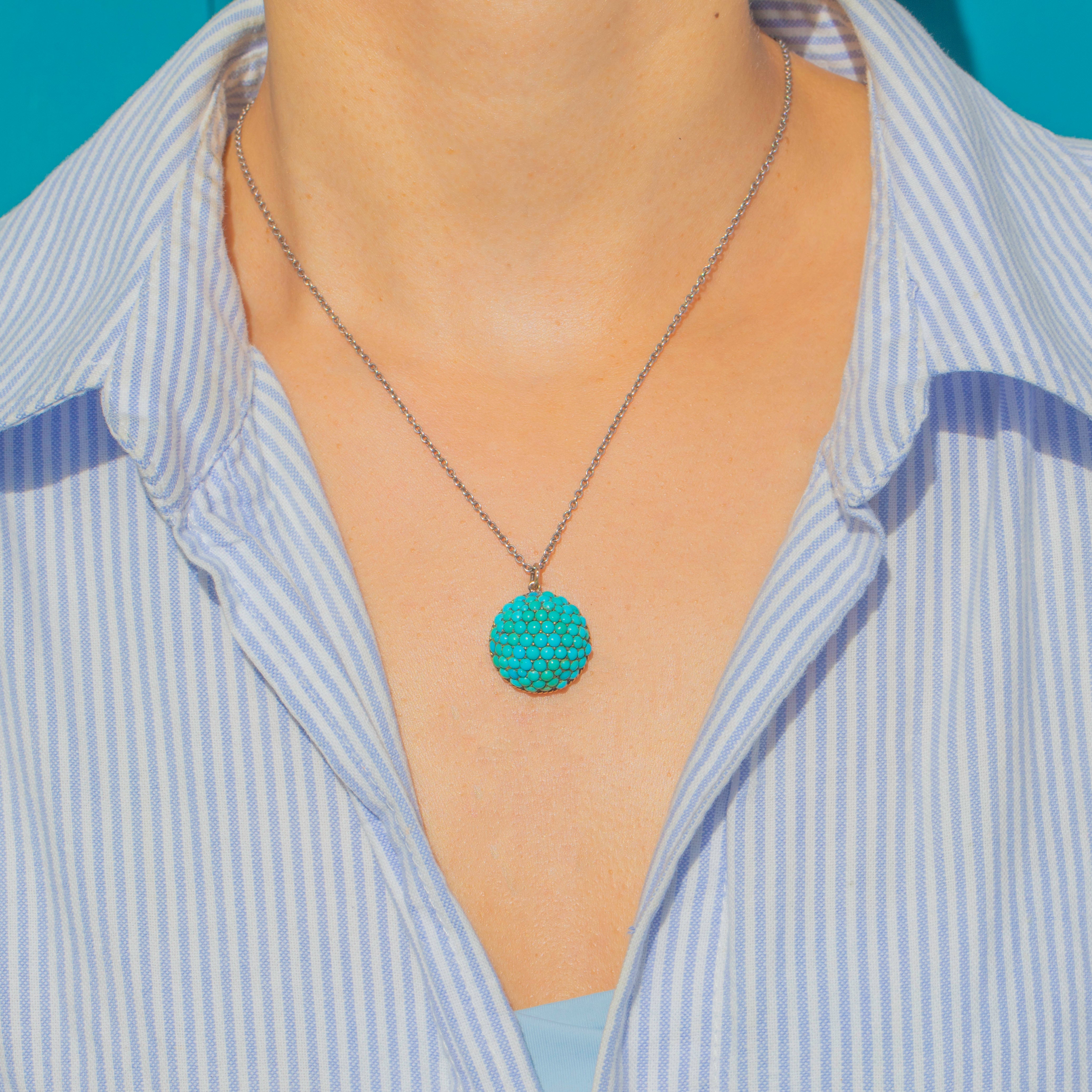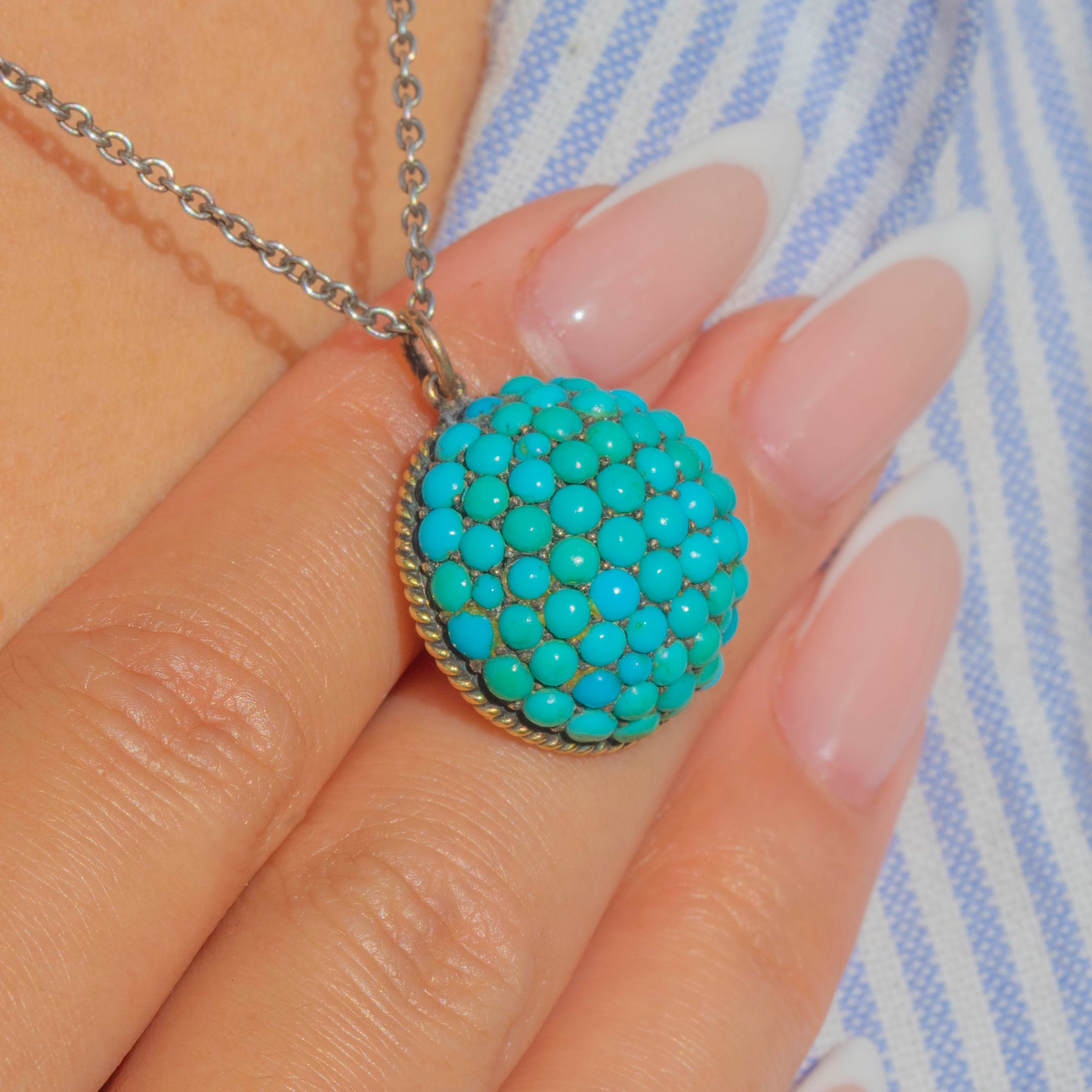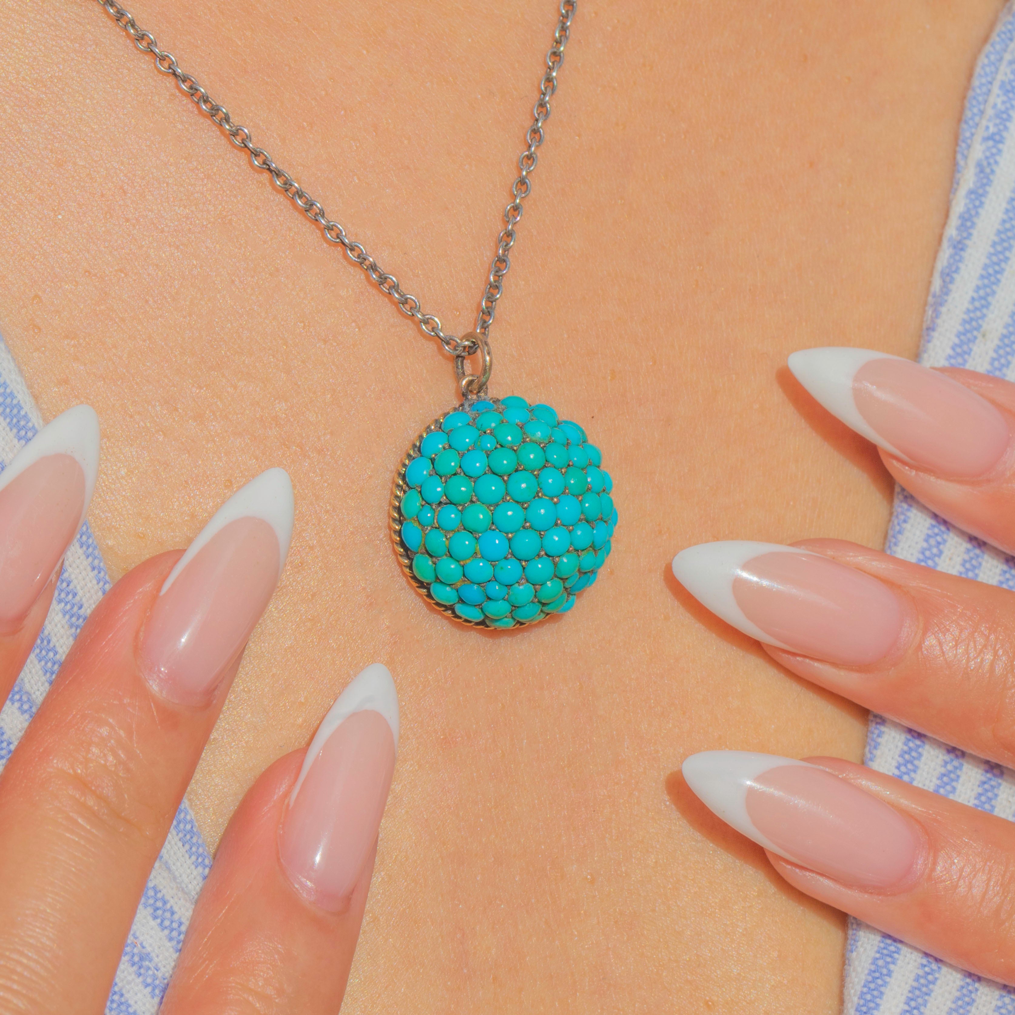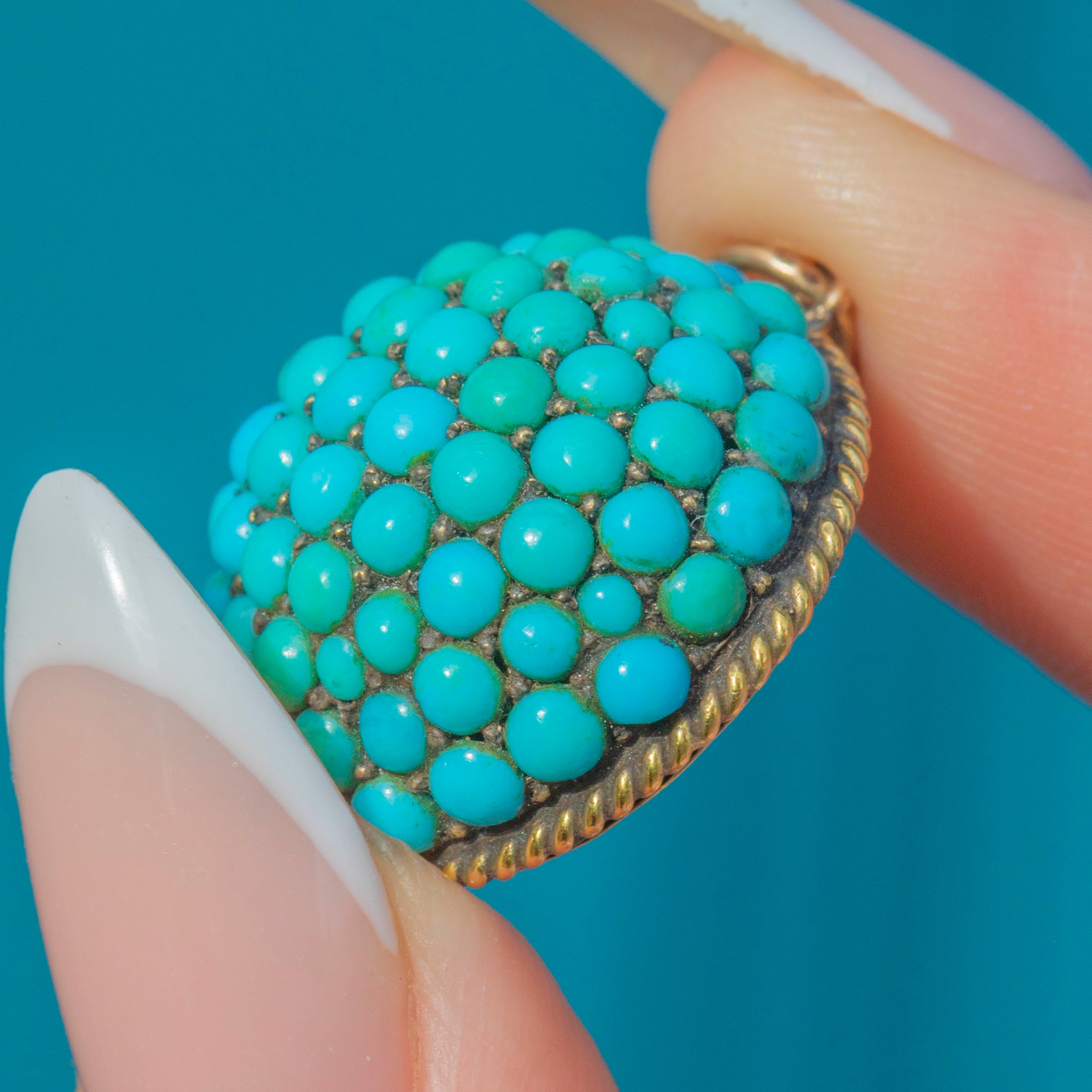 This striking Victorian pendant is a bold celebration of colour and craftsmanship. Crafted in 12ct Gold, the domed bombé form is pavé-set with a mosaic of natural Turquoise cabochons in vibrant shades of sky blue and sea green. The rich tones and textural arrangement make this a captivating jewel with wonderful presence on the neckline.