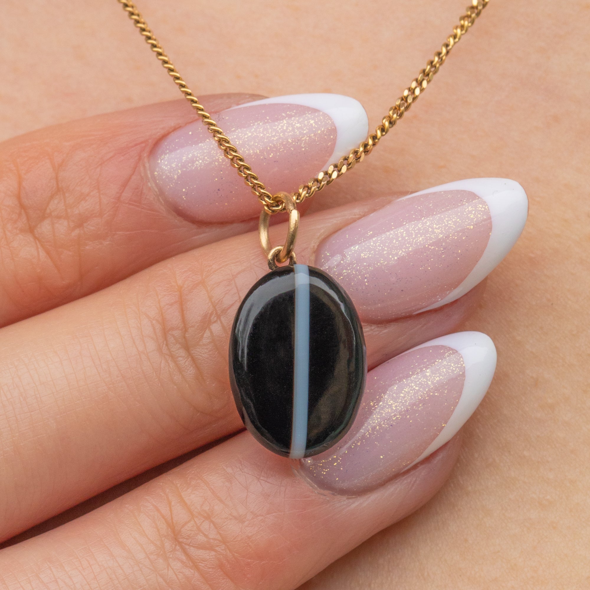 This Victorian 15ct Gold Banded Agate charm will look striking adorning your décolleatge! The smooth inky black Agate displays a contrasting white line down its centre, giving this antique pendant plenty of character.