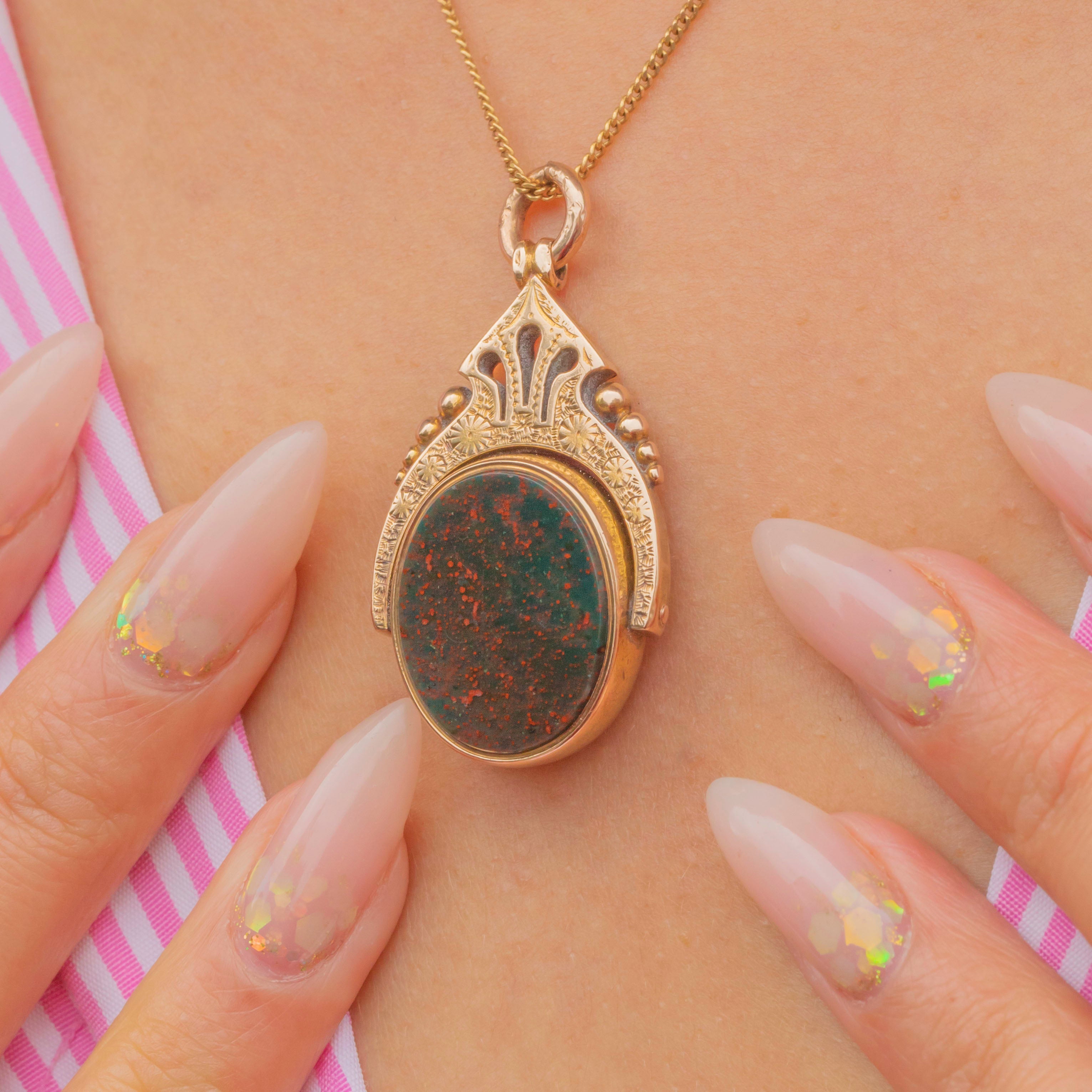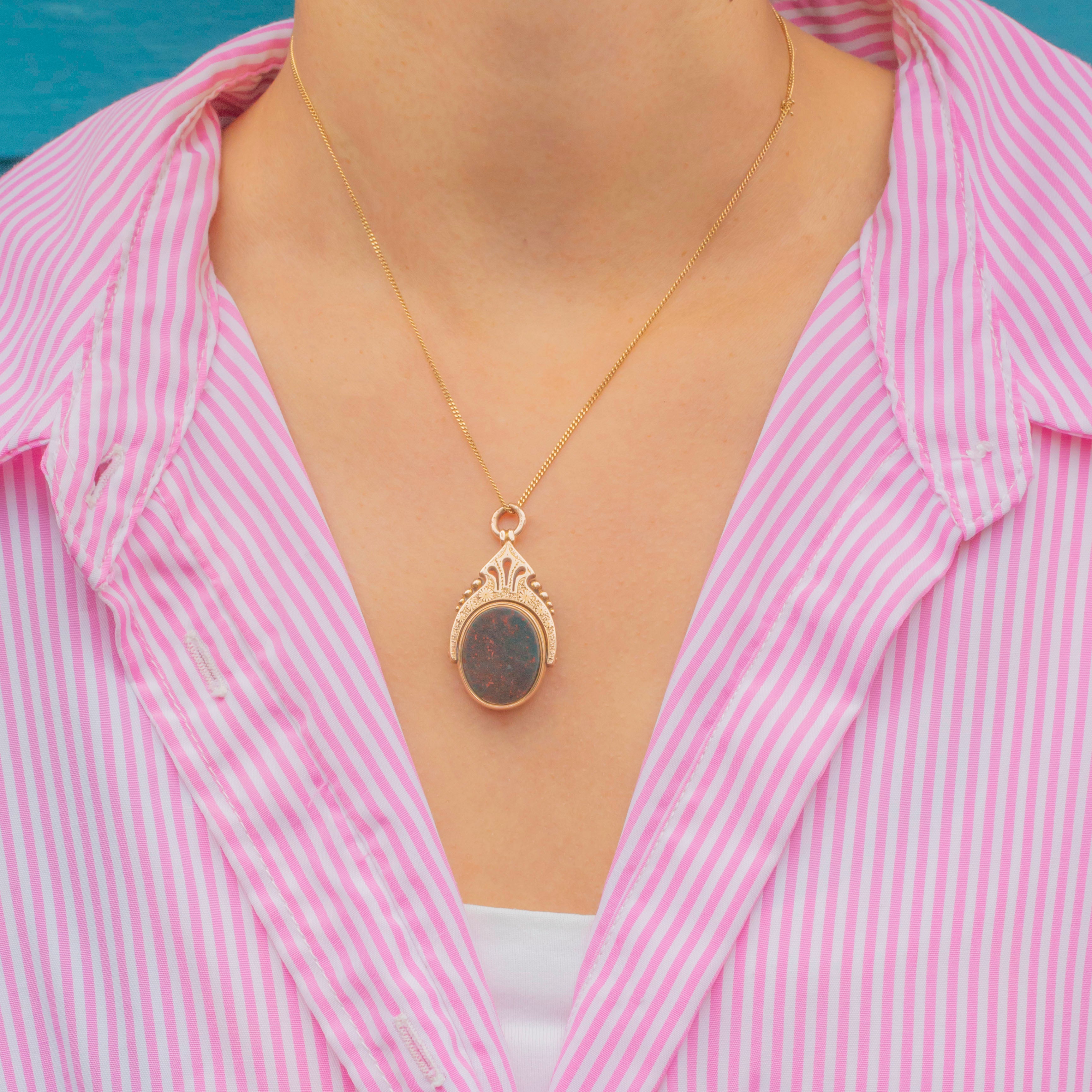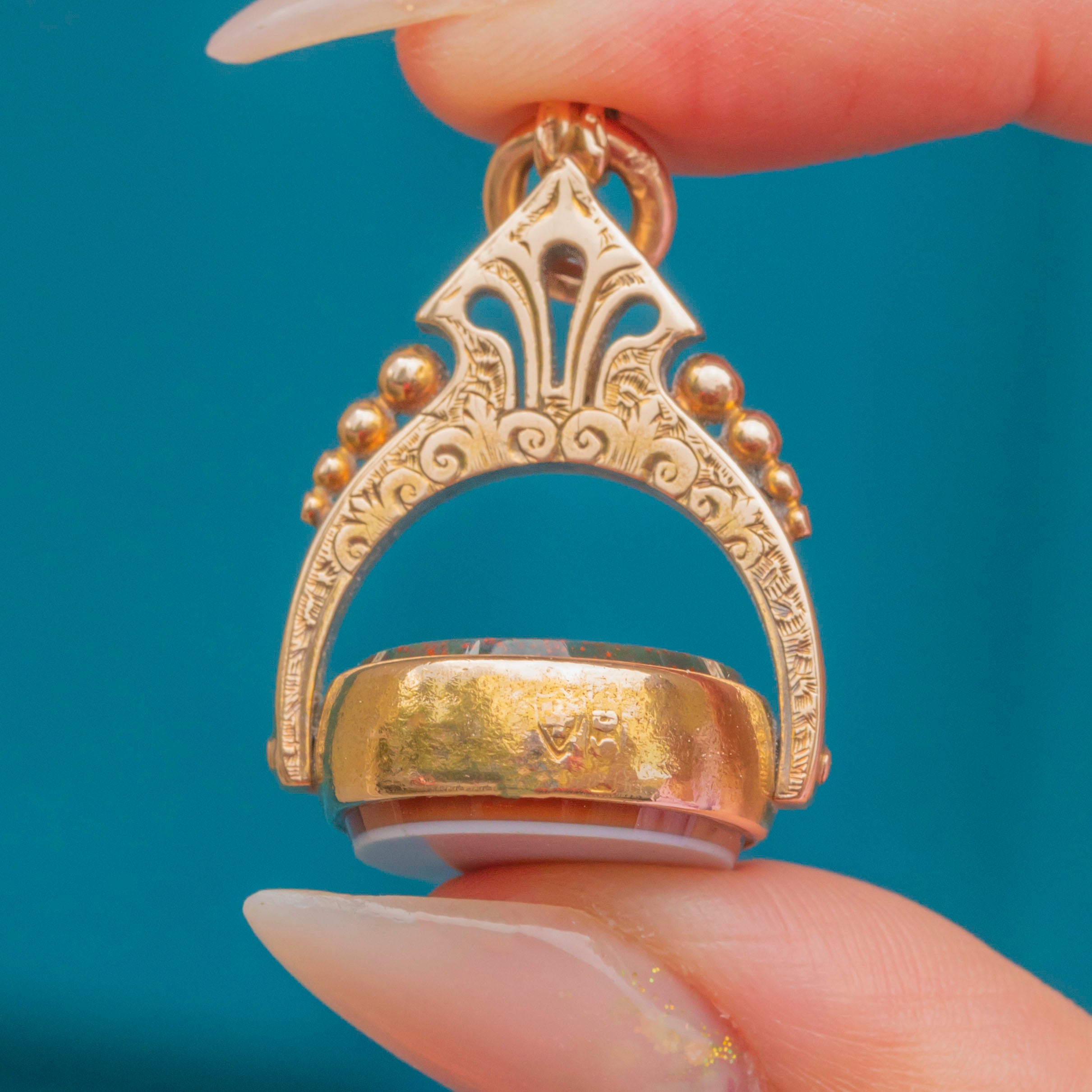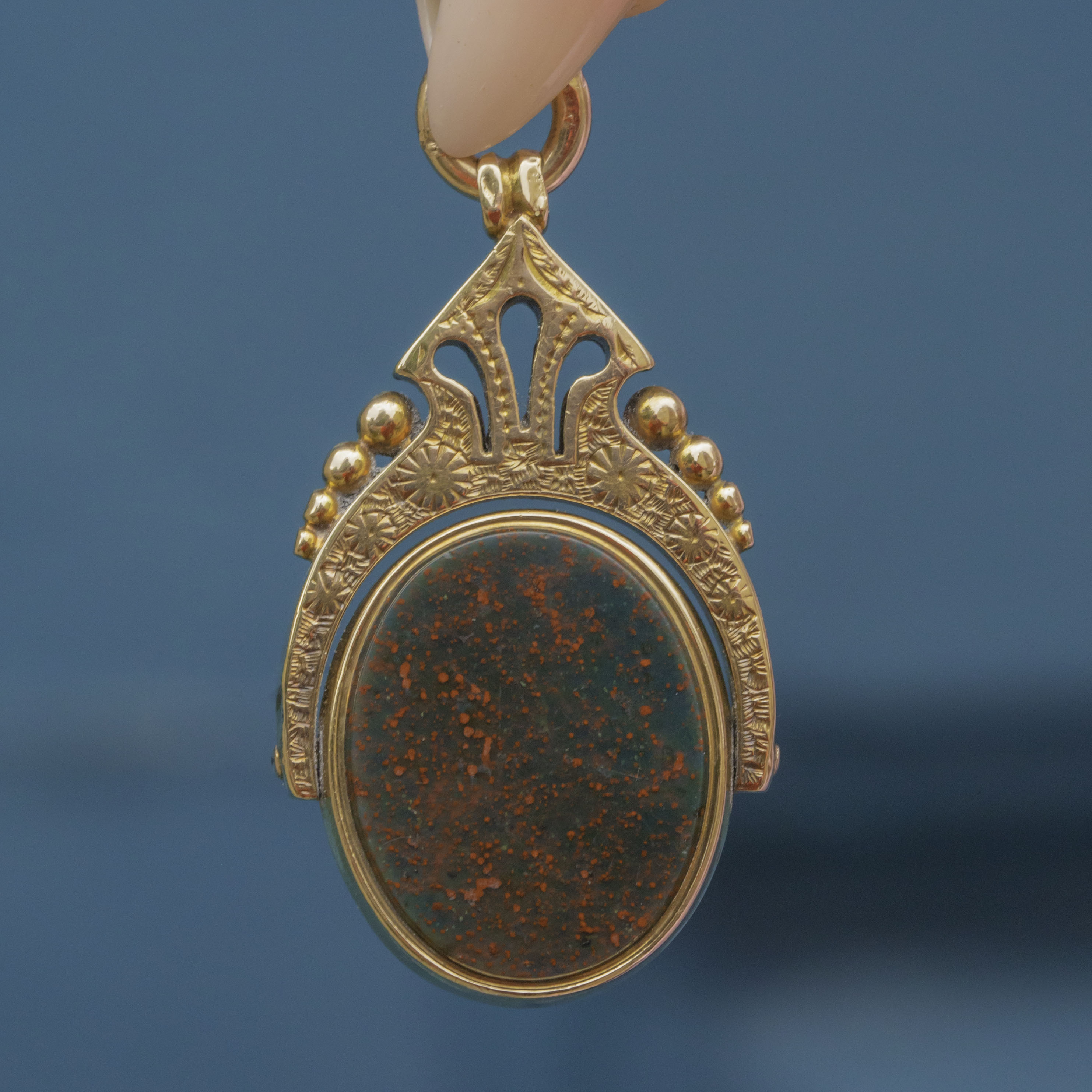 A superb Victorian swivel fob crafted in rich 15ct Gold, set with a glossy deep green Bloodstone flecked with red on one side, and banded Sardonyx on the reverse. The decorative frame is beautifully detailed with engraved motifs and beaded gold accents, giving the fob a distinctive, ornate look.