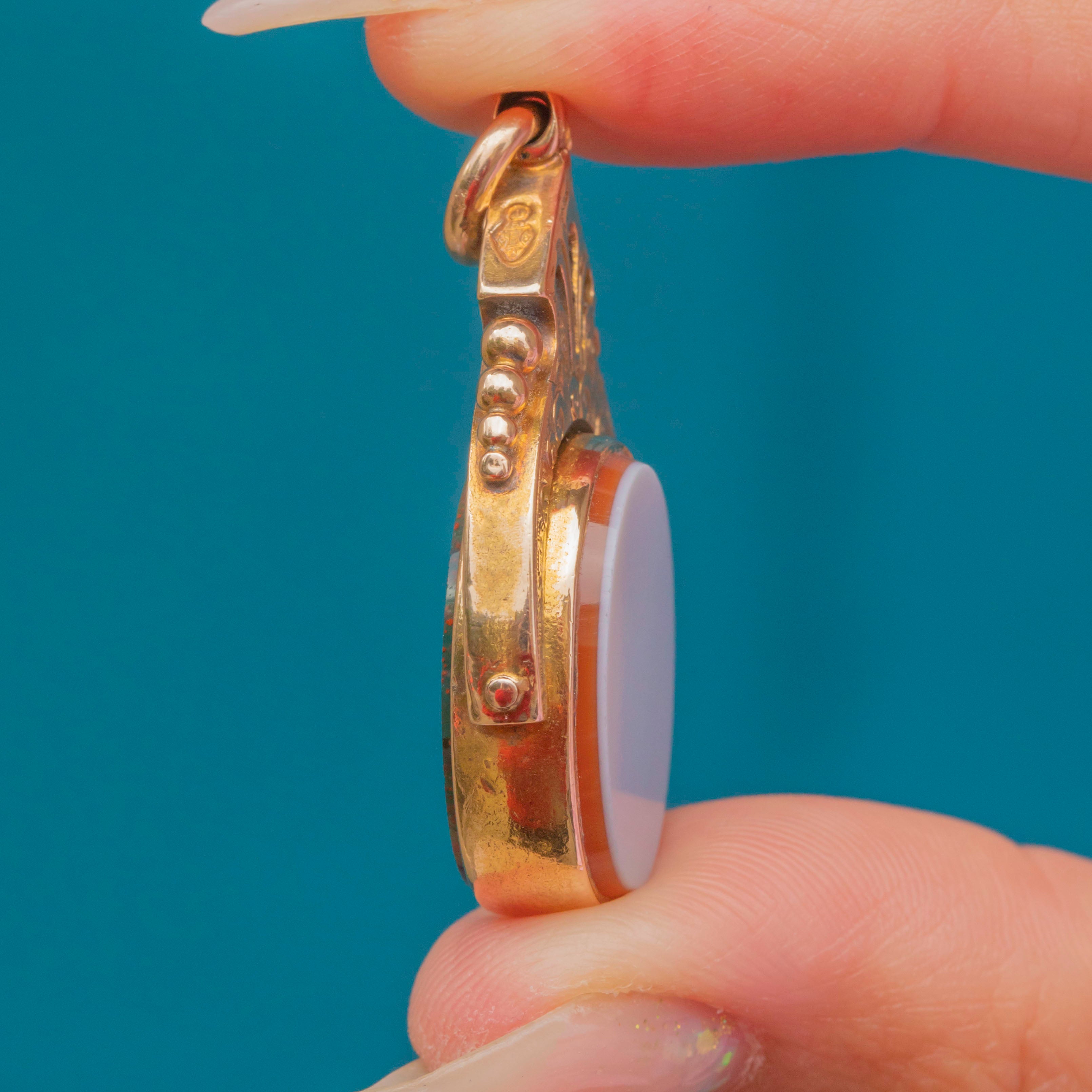 EXCELLENT: Both stones are smooth and glossy with no chips or cracks. The Gold frame retains its rich colour and ornate detail. A superb Victorian swivel fob in beautiful condition.