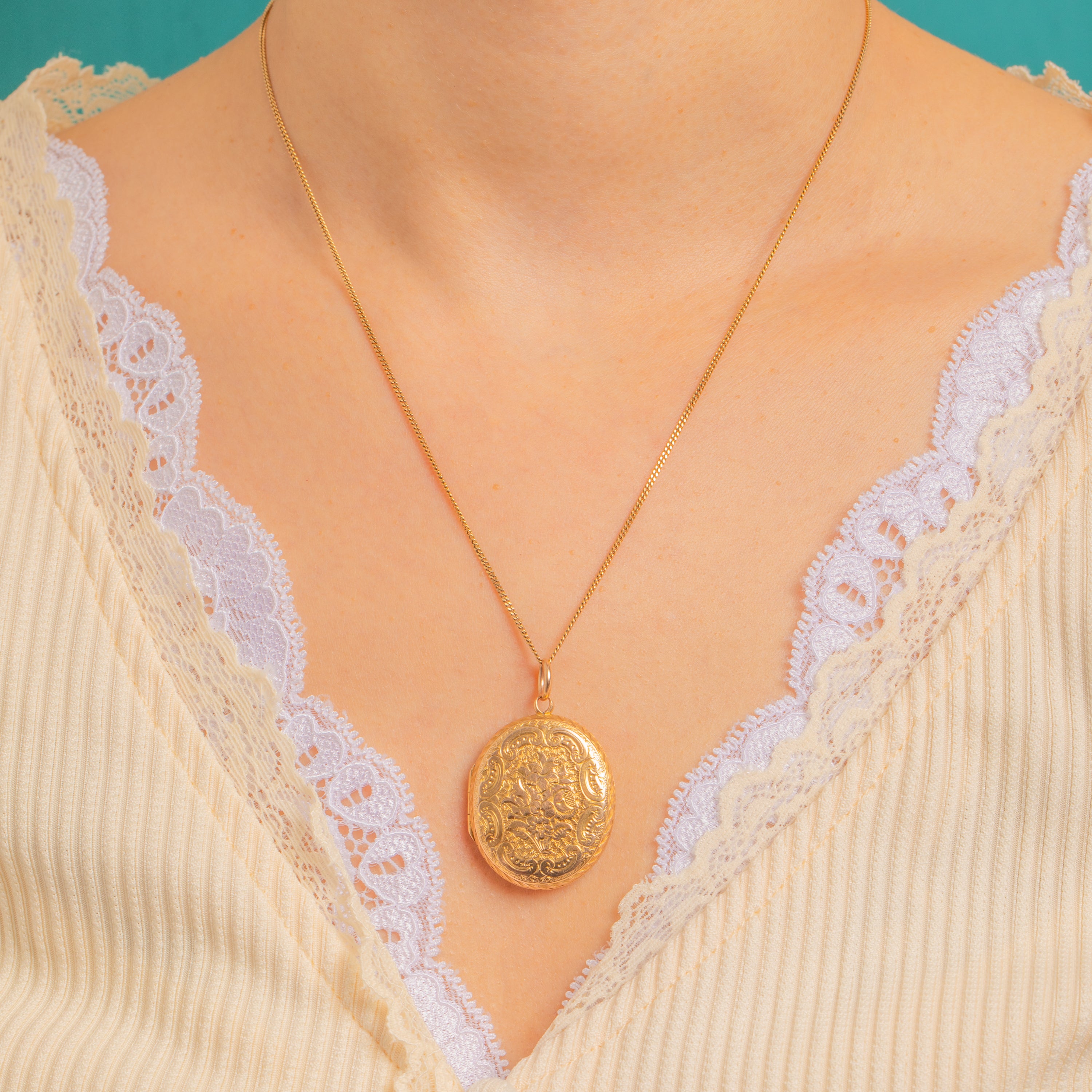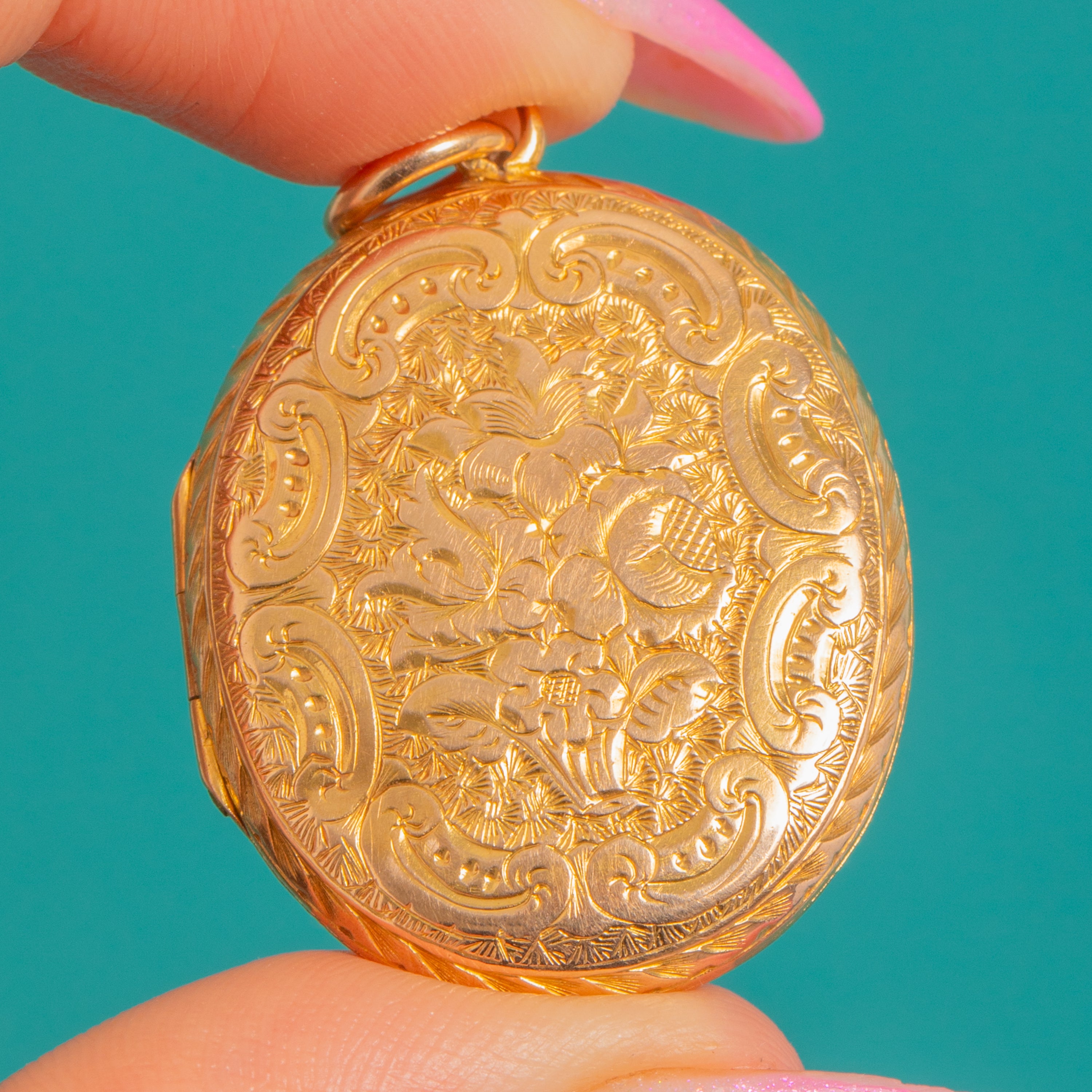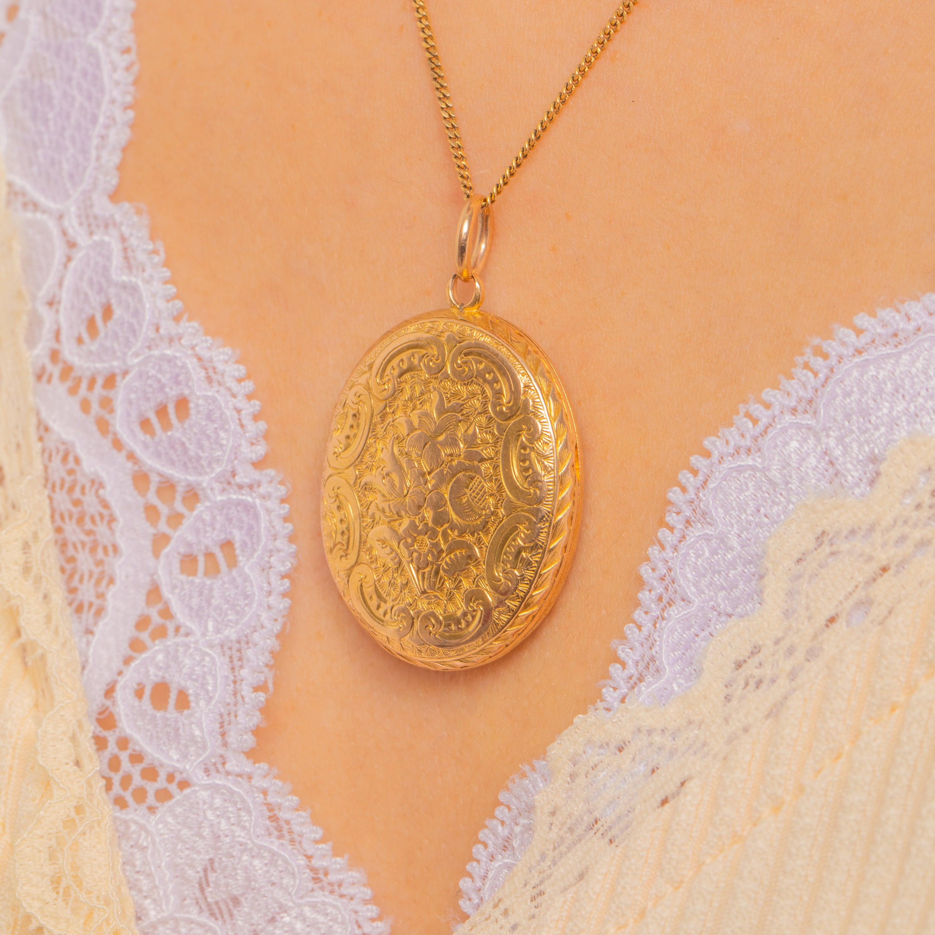 A beautifully engraved Victorian locket in rich 15ct Gold, alive with crisp chased florals and scrolling foliate engravings. The high-relief detailing catches the light wonderfully, giving this classic oval silhouette an ornate, romantic presence.