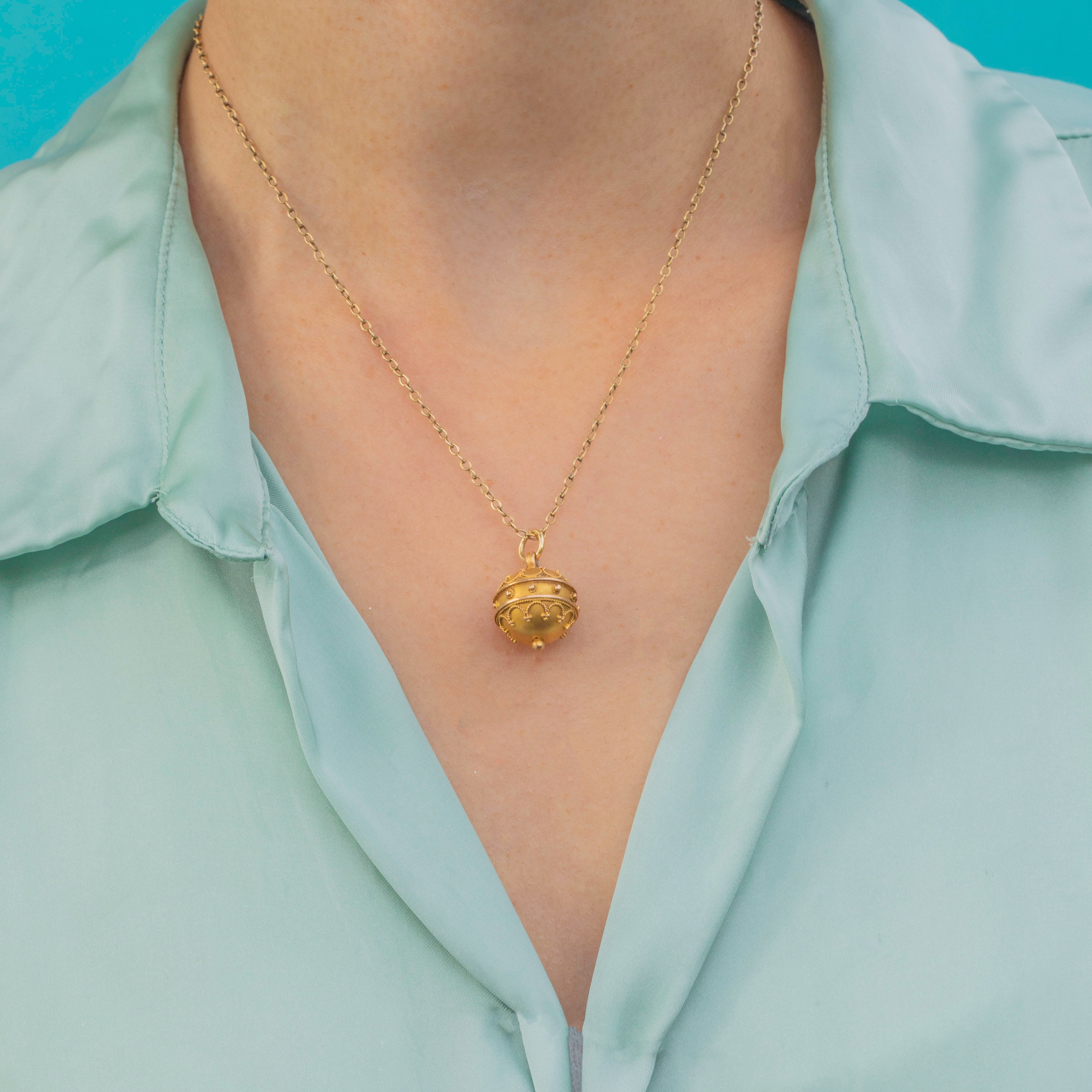 A rare and exquisite Victorian orb pendant crafted in rich 15ct Gold. This spherical pendant is beautifully worked in open filigree, creating an airy, lace-like design that feels both intricate and elegant. The 3D orb form is particularly striking, adding dimension and movement when worn on a chain.