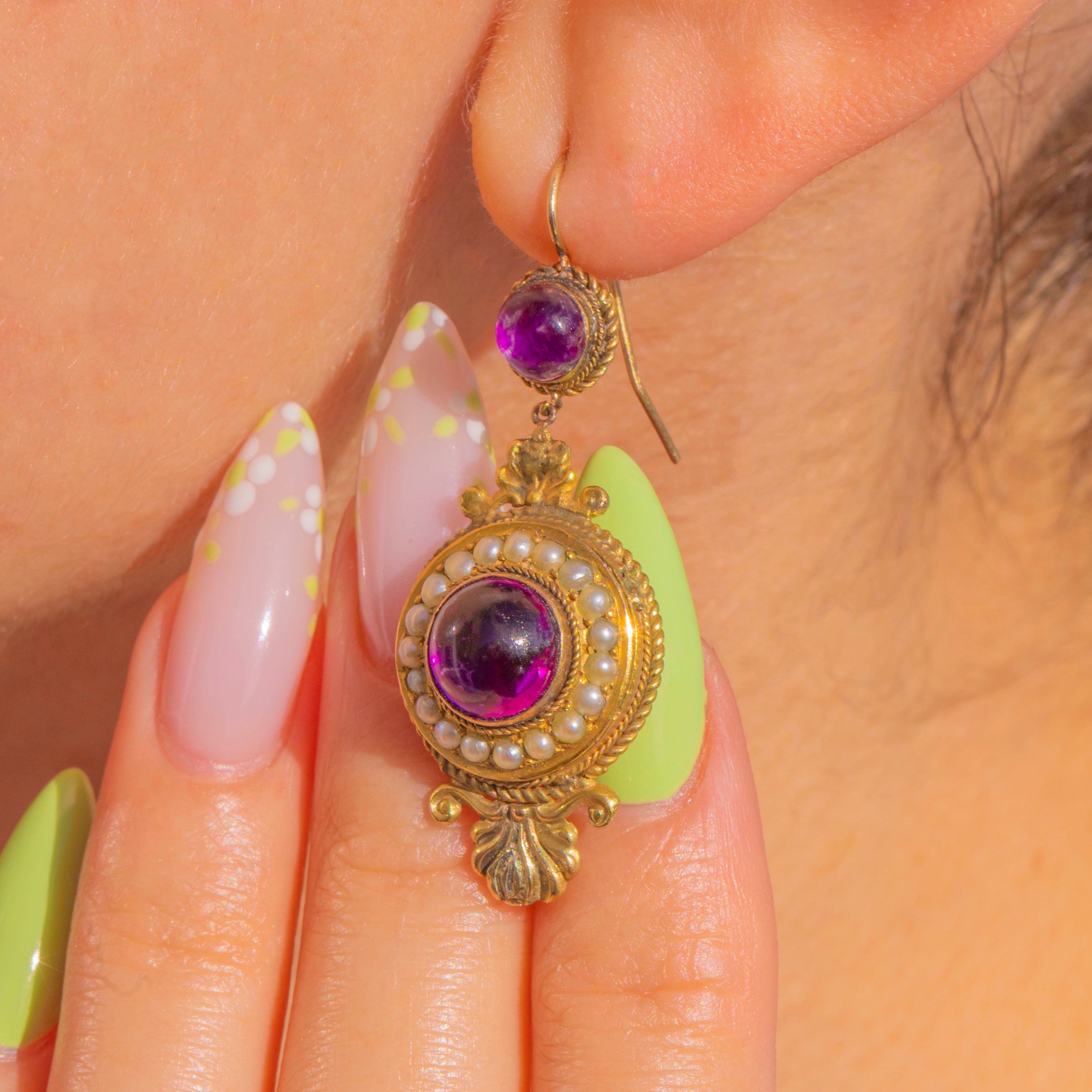 The design balances a smaller round cabochon above a larger round cabochon below, united by a slender link for beautiful movement. The Amethysts total approximately 5.00ct combined, their colour amplified by traditional foil-backing, with the Pearls bringing a delicate, luminescent contrast. Finished with classic shepherd-hook fittings, they’re a quintessential c.1870 Etruscan Revival treasure—ornate, feminine, and endlessly wearable.