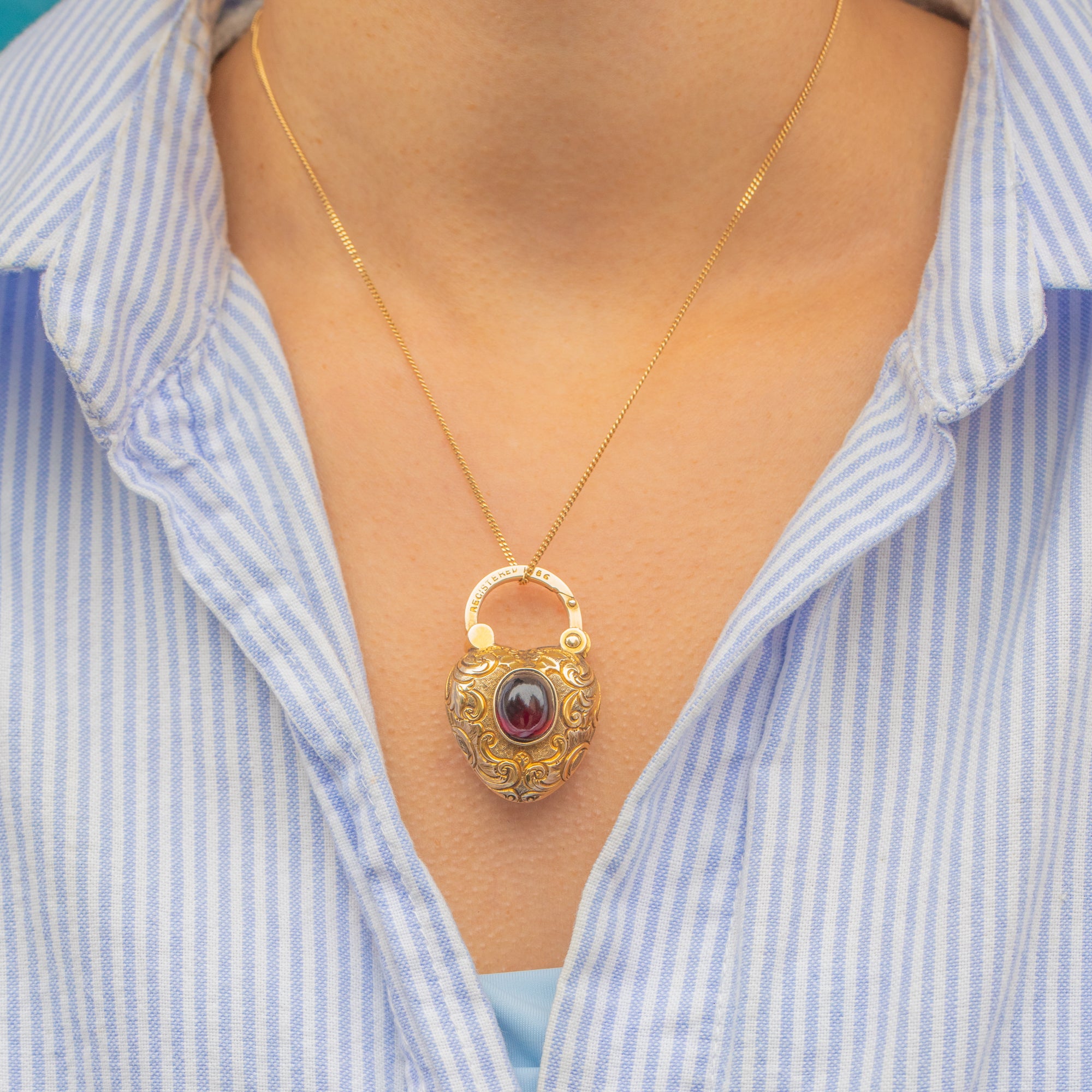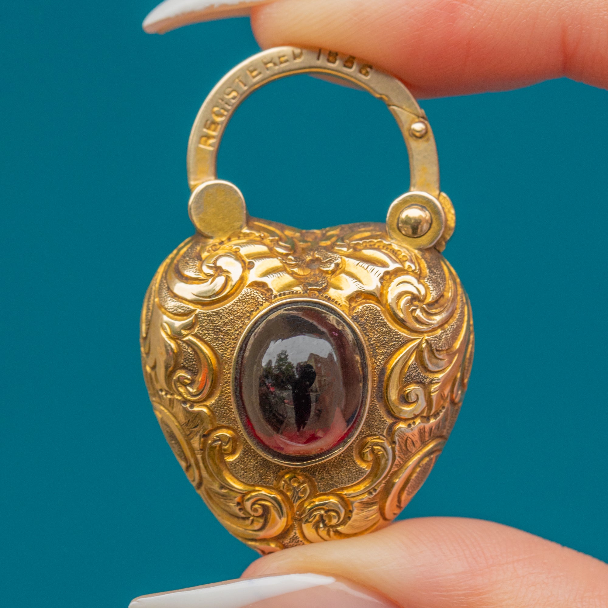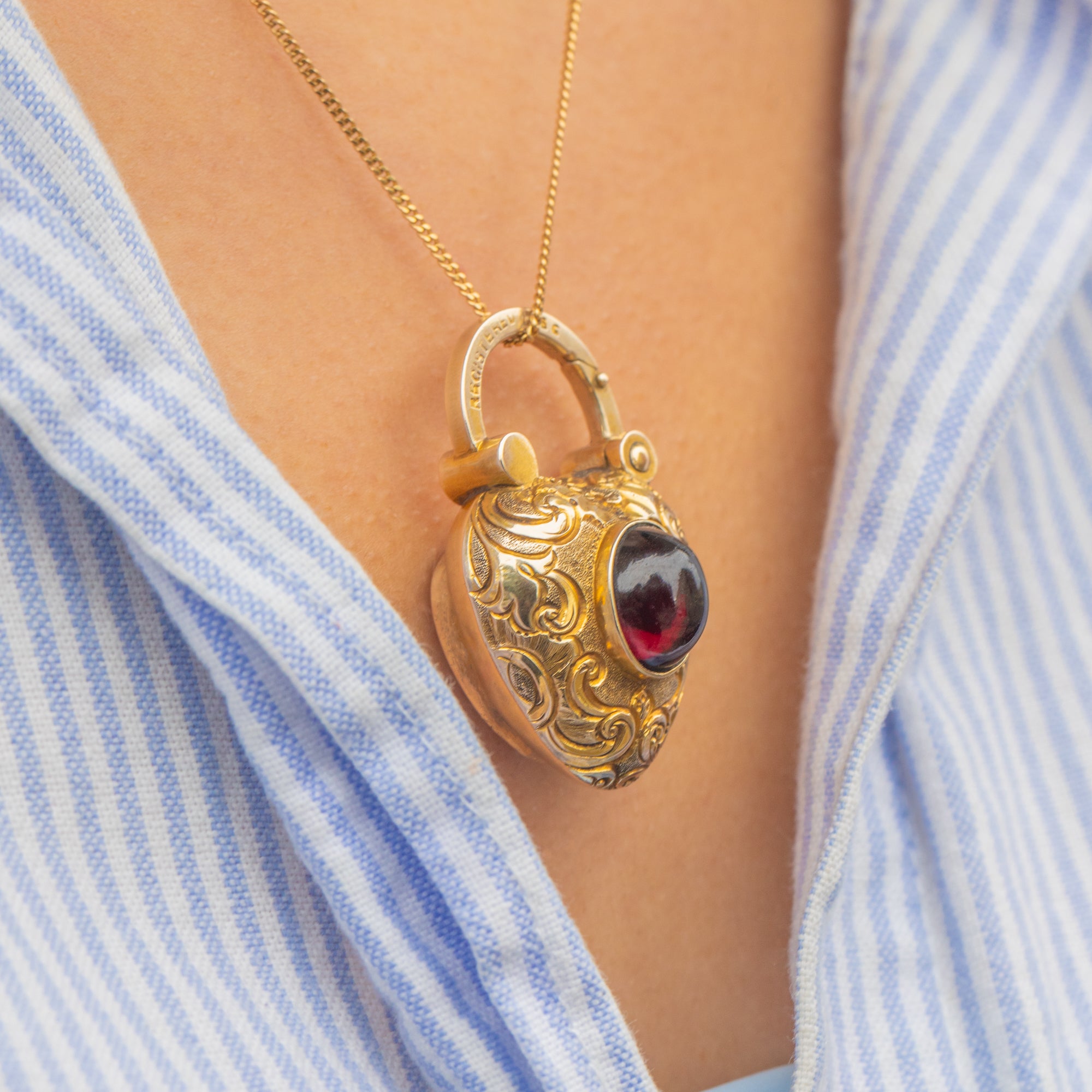 This antique heart padlock is as romantic as it is practical, a perfect symbol of everlasting love. Crafted in richly hued 15ct Gold, the padlock is adorned with ornate chased scrollwork and set with a glowing 1.62ct Garnet cabochon, displaying a deep, juicy hue that shimmers when it catches the light.