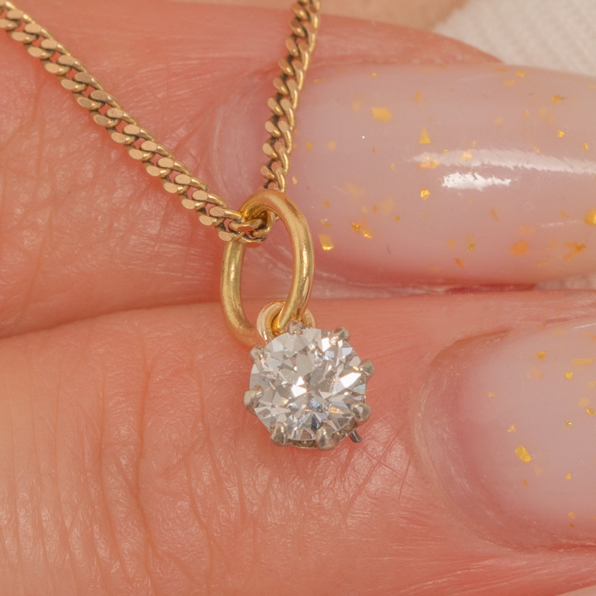 EXCELLENT: The Diamond is bright with no eye-visible chips or abrasions. The 15ct Gold setting and 18ct Gold jump ring are secure with light surface wear commensurate with age. Minor solder/tool marks are present at the jump ring join, stable and not distracting when worn.